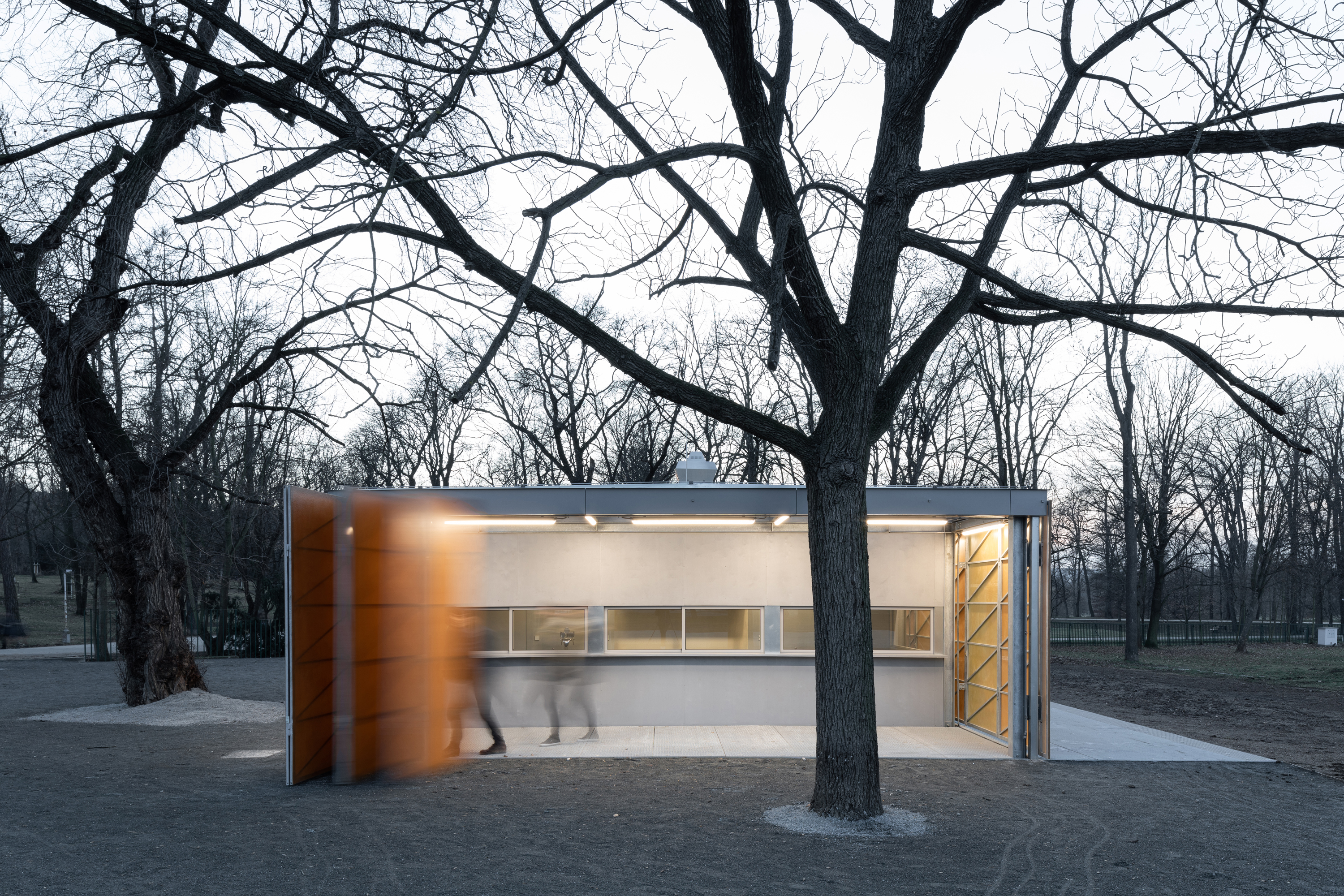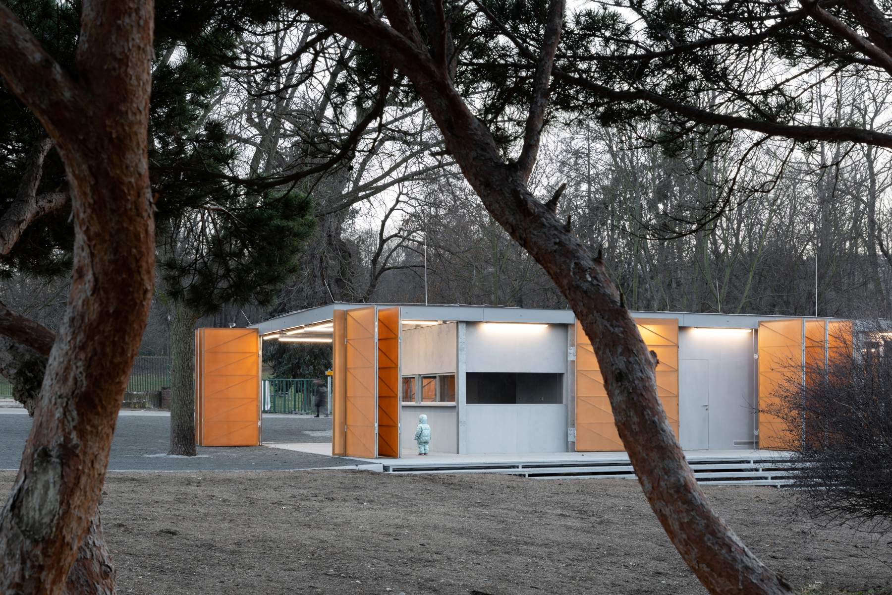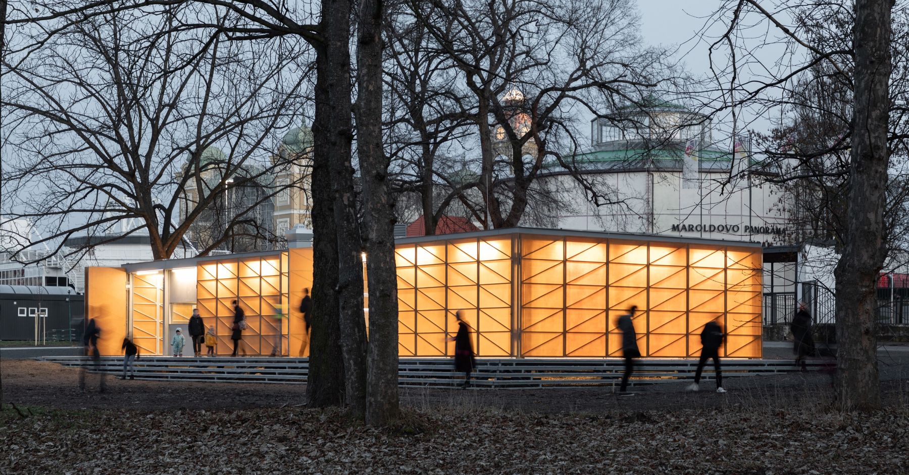 Výrazná jantarová barva panelů tvoří kontrast k šedým odstínům všech konstrukcí, stěn a vybavení pavilonu. Posuvně otočné panely fungují jako skládací skořepina, do kterého je možné celý pavilon uzavřít. Variabilita pláště umožňuje různou míru využití a otevřenosti pavilonu vůči okolí za různých povětrnostních a světelných podmínek.Součástí návrhu bylo také řešení přilehlého okolí. Návrhem brány ve stávajícím oplocení areálu a navazujících zpevněných ploch byla obnovena významná osa Stromovka – Výstaviště, ke které se pavilon přimyká a stává se tak svorníkem dodnes oddělených parků.