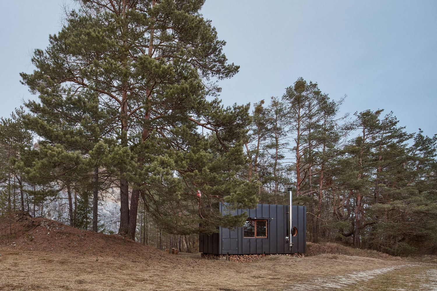 Dřevostavba je obložená sibiřským modřínem - 249 prken, 1932 hřebíků a vrutů, 19 hodin práce! Velké čtvercové okno zajišťuje maximální kontakt s přírodou. Ze spodního lůžka potěší výhled horizontálním oknem, to je jako stvořené pro sledování lesní zvěře dalekohledem a kochání se přírodou v širokém zorném úhlu. Spací patro prosvětlují střešní okna, která v noci nabízí nocležníkům nezapomenutelné výhledy na hvězdnou oblohu nerušenou světelným smogem z okolí. Okna jsou navíc panoramatická, je možné se do nich usadit s nohama na střeše jako na lesní posed. A srnky, zajíci i divočáci opravdu přijdou!
