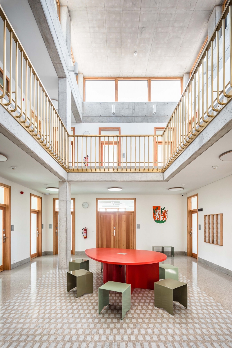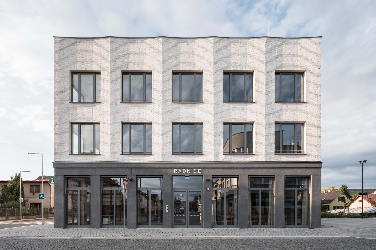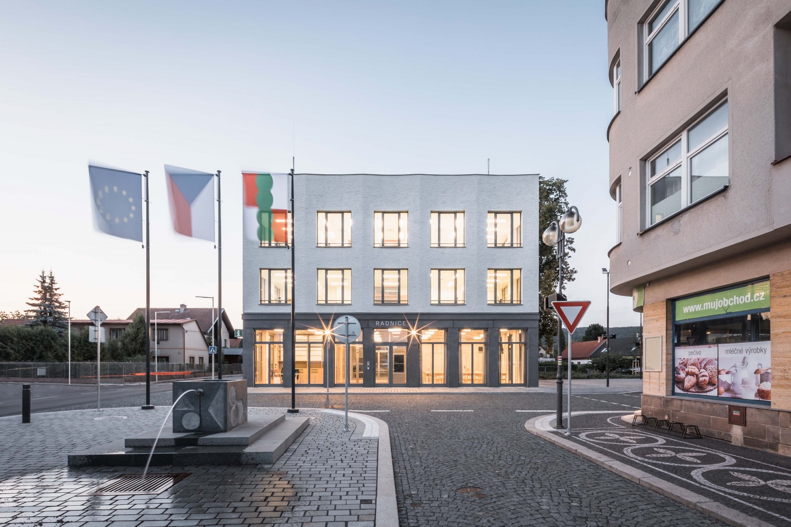 Nová budova na Náměstí K. V. Raise má jednoduchý obdélníkový půdorys a pozornost přitahuje svou sněhobílou prolamovanou fasádou z cihel, jež se pod různými úhly slunce proměňuje. Veřejné přízemí je maximálně otevřené, obsahuje víceúčelový sál, zasedací místnost a podatelnu s infocentrem a lze jej rozšířit i ven k potoku. Atrium prochází i zbylými dvěma patry s kancelářemi a stírá tak hranici mezi občany a vedením města. To je ostatně při svém zasedání v přízemí stále ve spojení s náměstím. Mosazné zábradlí, modřínové dřevo, teracové podlahy a pohledový beton dodávají radnici na stabilitě v čase, zároveň jsou ale příjemné na dotyk i na pohled.