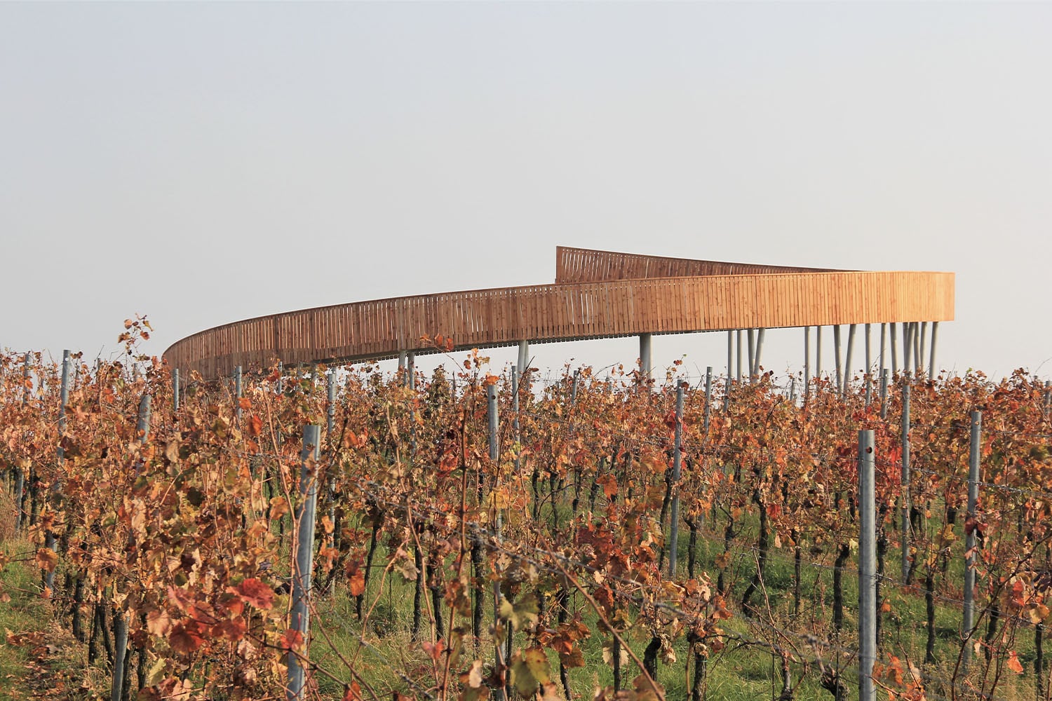Rozhledna u Kobylí se od běžných věží výrazně liší – místo schodů vás vzhůru vede pozvolná kruhová rampa, která z ptačí perspektivy připomíná ulitu. Nenarušuje siluetu krajiny, spíš ji jemně doplňuje. Nedokončený tvar kruhu odkazuje na nekonečný cyklus přírody a času. Orientaci v okolí usnadňuje informační linie umístěná přímo na podlaze, kde se symbolicky propojuje prostor a čas.