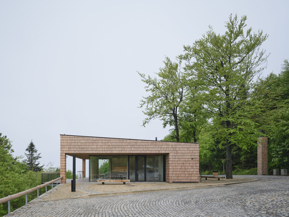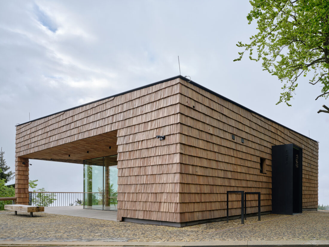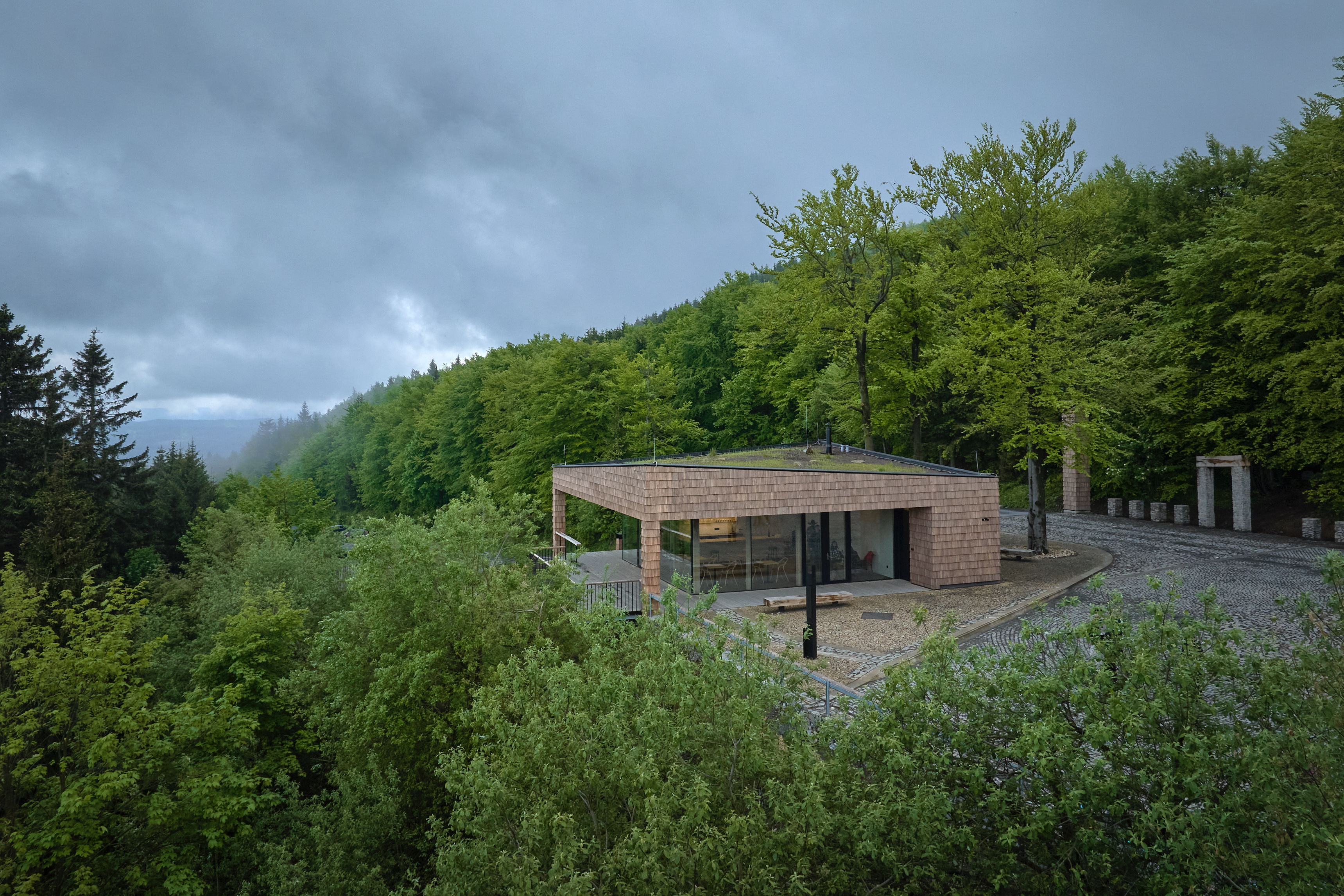 Ateliér Henkai z nedalekého Rožnova pod Radhoštěm navrhl jednoduchou stavbu, která šindelovou fasádou odkazuje na místní tradici. Prosklenou stěnou a terasou se otevírá do údolí s výhledem na Čertův mlýn. Na střeše se pak jako na zdejších loukách zelená horská květena. U protější strany silnice byla postavena typická zvonička a kamenná brána, tvořící vstupní bod na pěší stezku k vrcholu Radhoště.