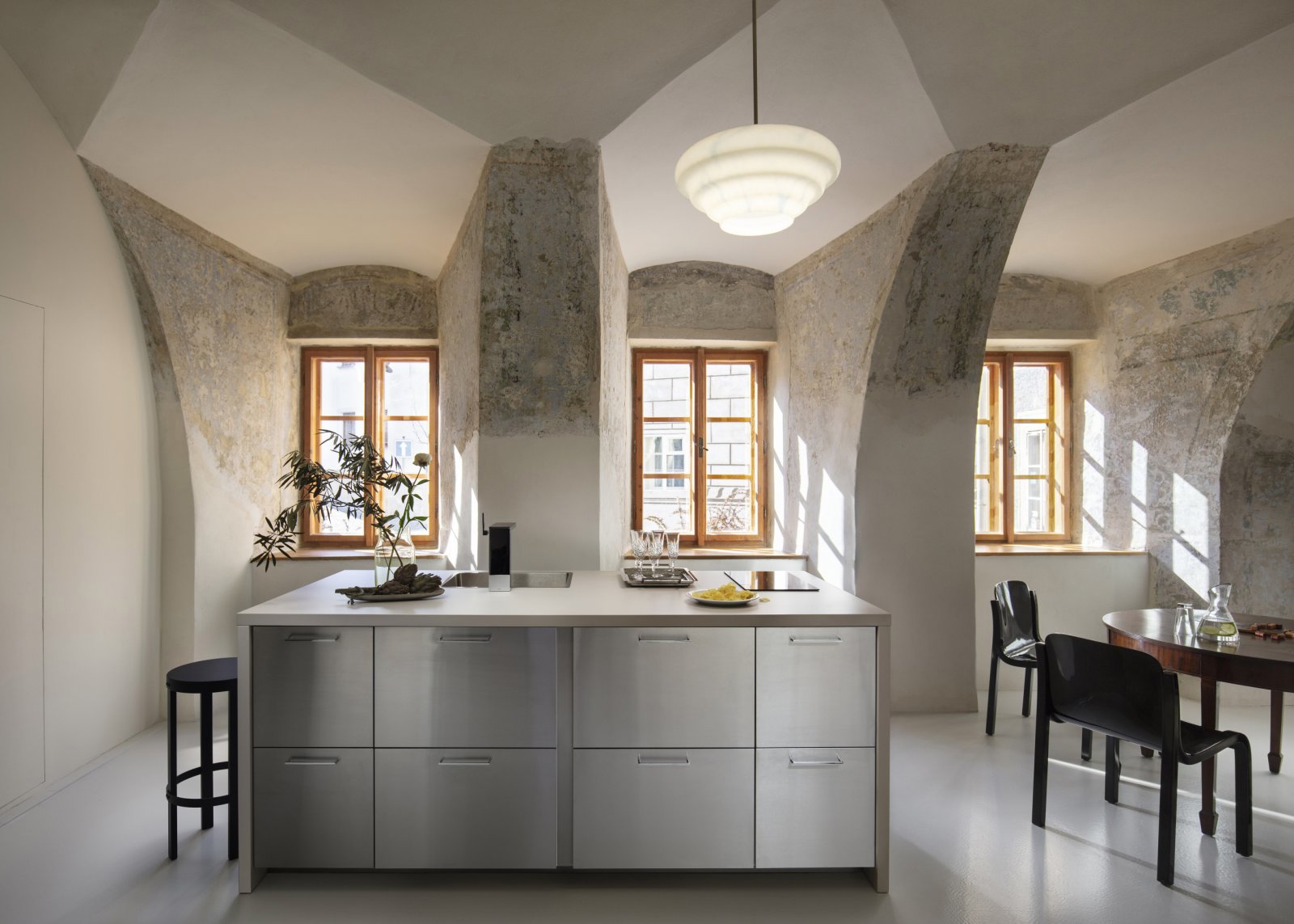 Interiér spojuje dochované historické vrstvy s jemnou pastelovou paletou a pečlivě vybraným vintage nábytkem z evropských antiků. V každém apartmánu se objevují výrazné detaily – původní kachlová kamna, loftově řešený společenský prostor či výhledy na Křížovou horu a střechy města.