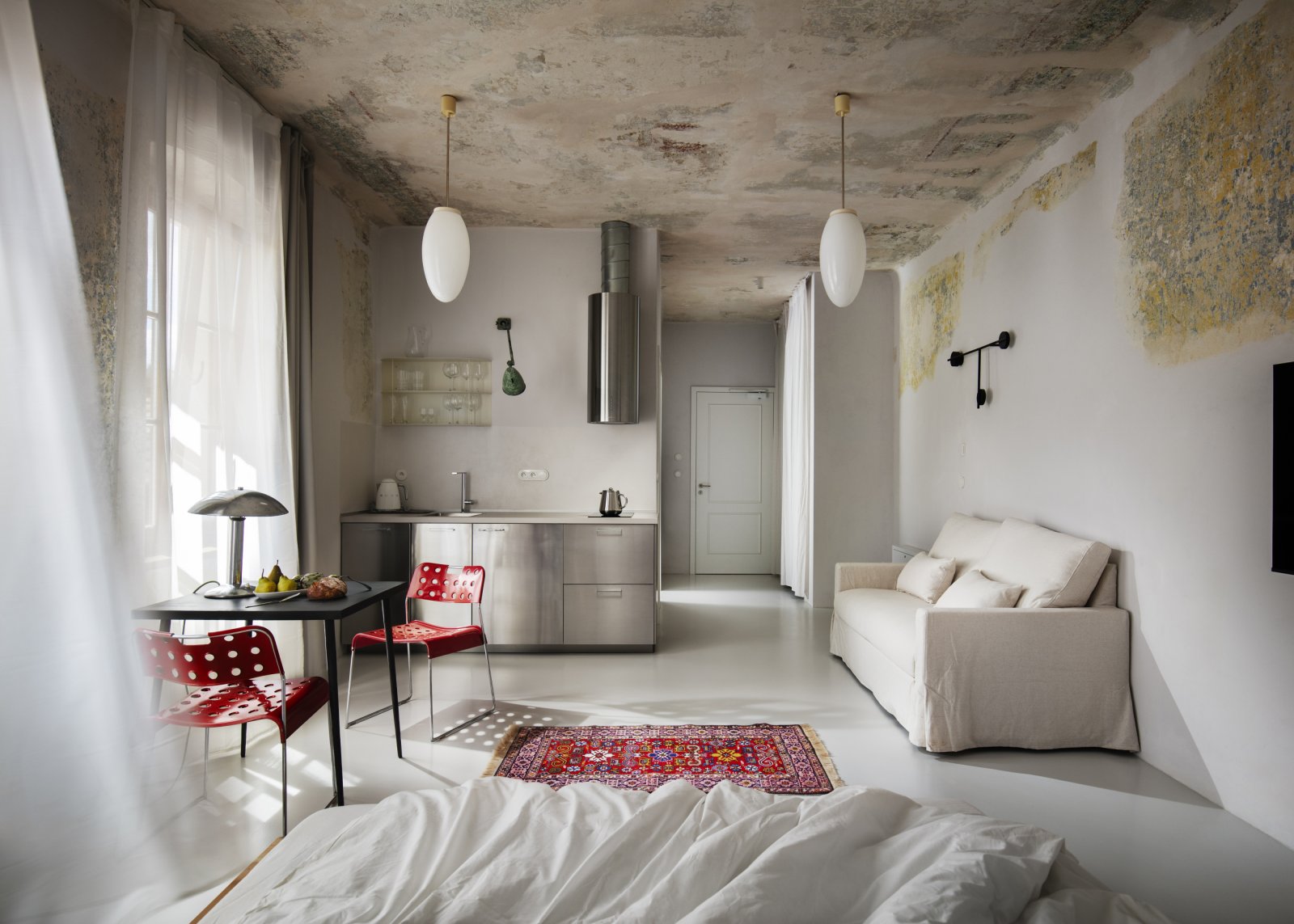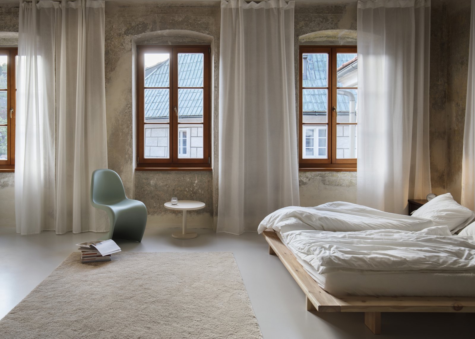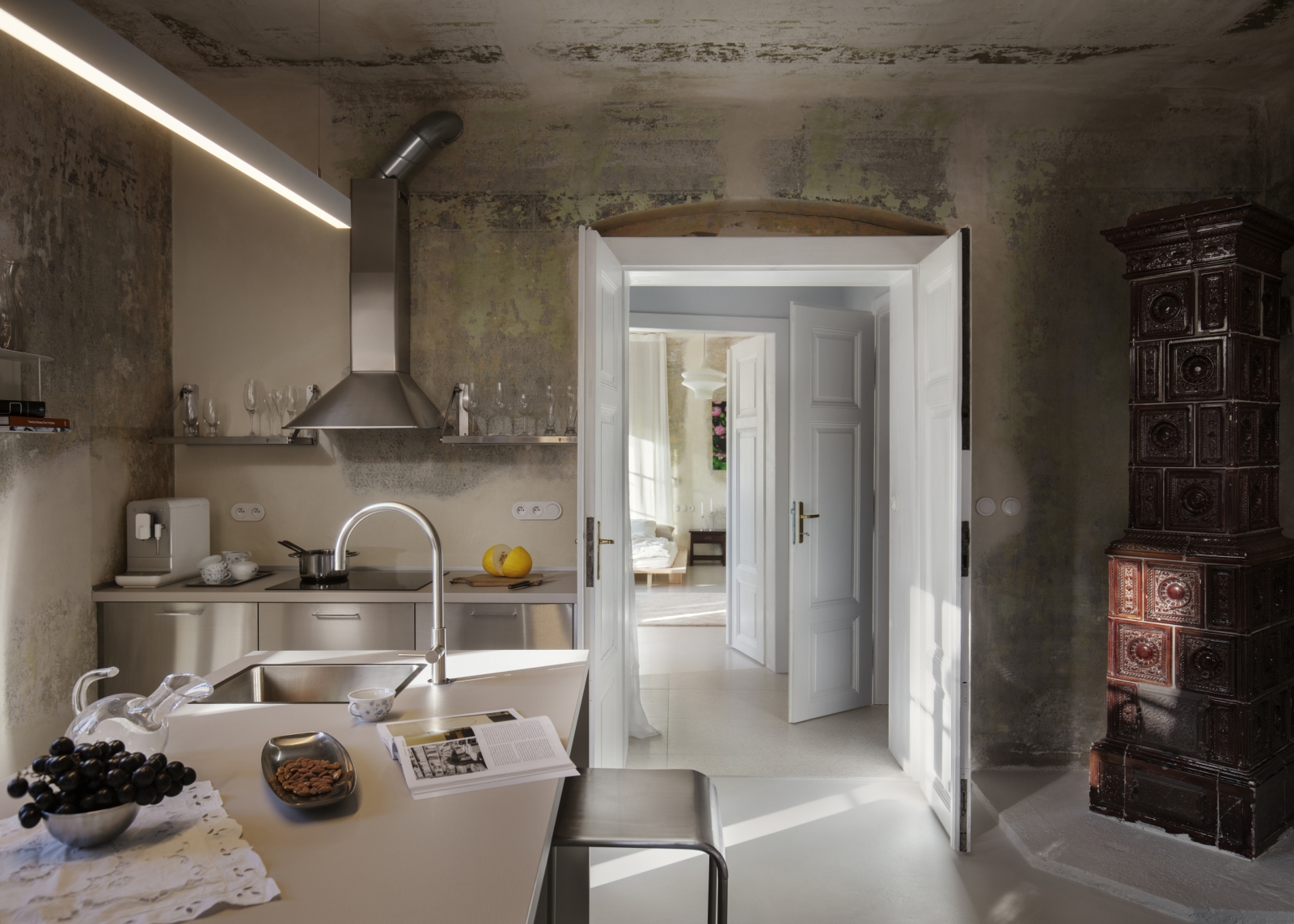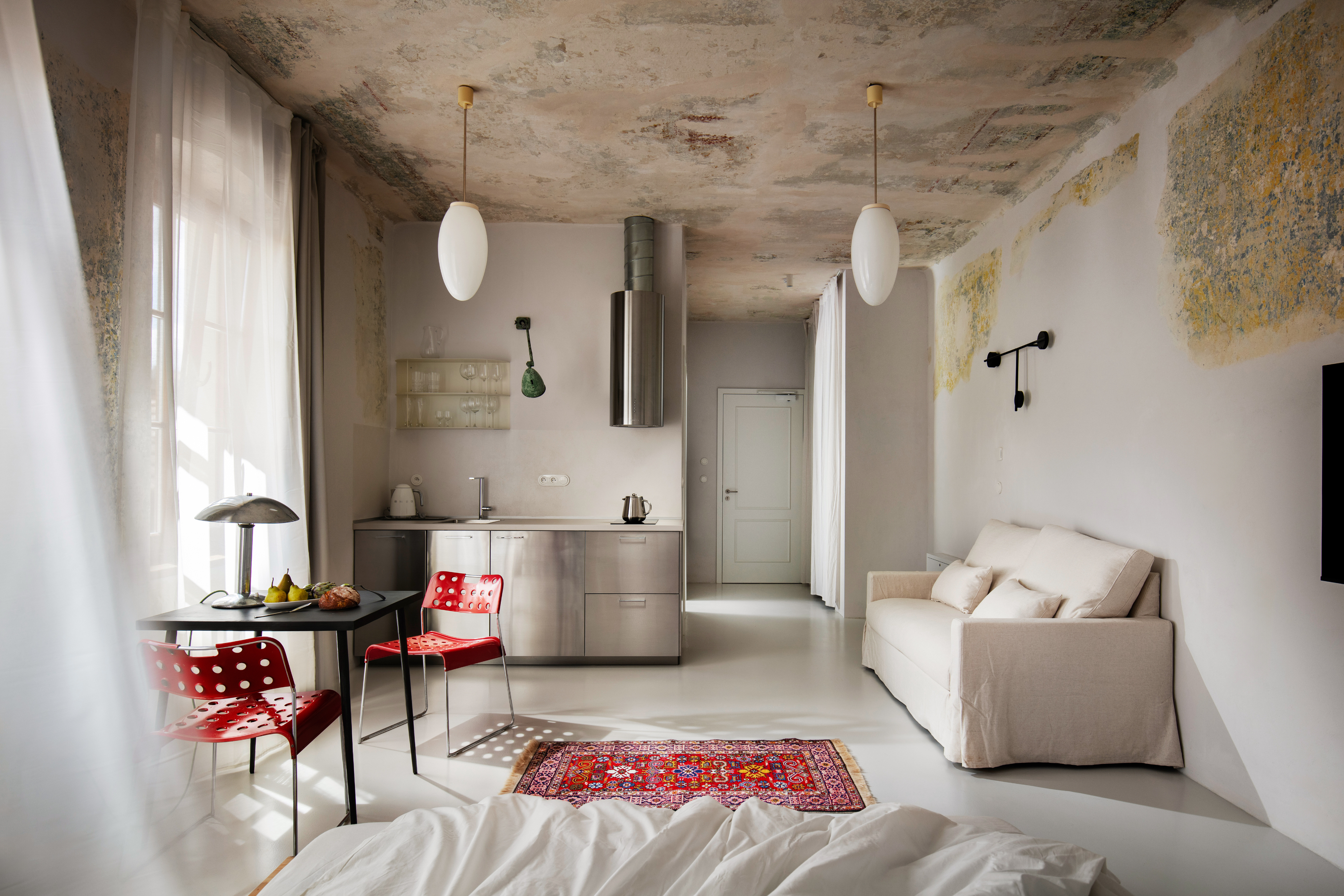 Interiér spojuje dochované historické vrstvy s jemnou pastelovou paletou a pečlivě vybraným vintage nábytkem z evropských antiků. V každém apartmánu se objevují výrazné detaily – původní kachlová kamna, loftově řešený společenský prostor či výhledy na Křížovou horu a střechy města.