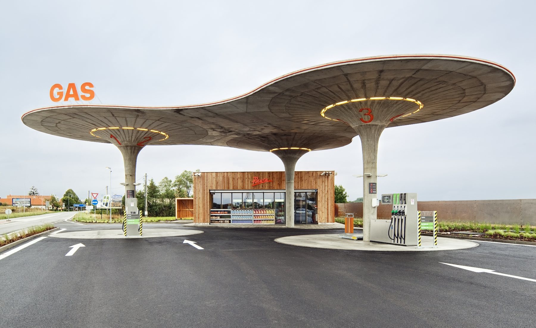 Prostor okolo stojanů s pohonnými hmotami je zastřešen zakřivenou plochou nesou třemi sloupy. Tři „houby“ poskytují průchod suchou nohou až do kiosku. Na jednotlivých houbách nejsou pro zachování vizuálního zážitku přítomny žádné rušivé prvky. Místo okapů voda stéká do dešťových vpustí vedených středem každého sloupu. Ve sloupech jsou ukryty také další nezbytné technologie jako odvětrávání a svítidla.