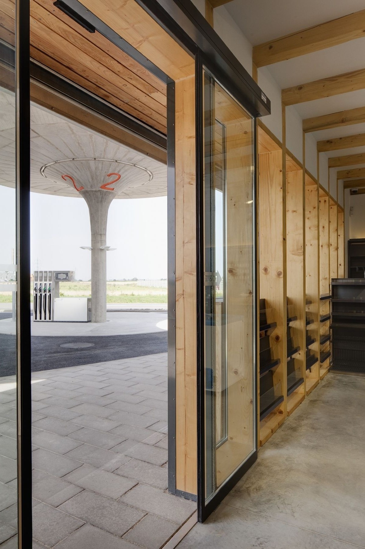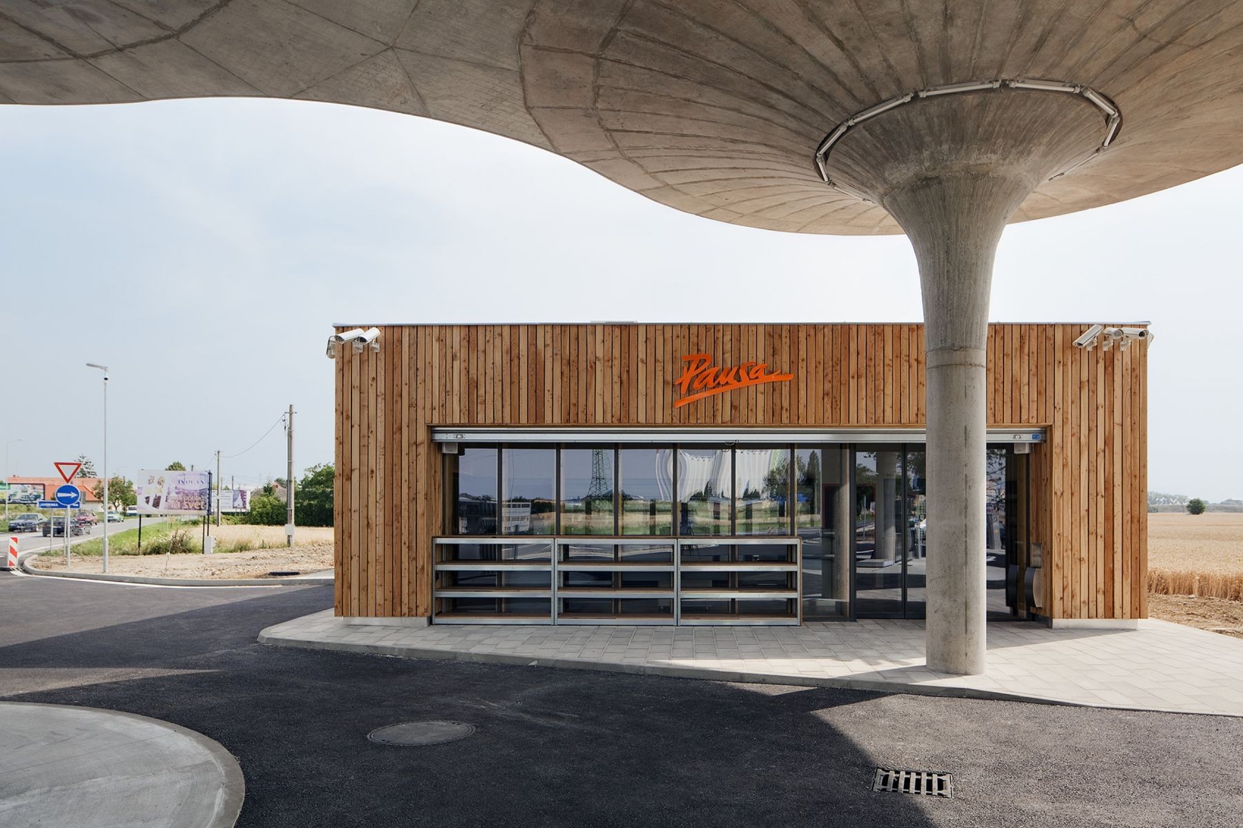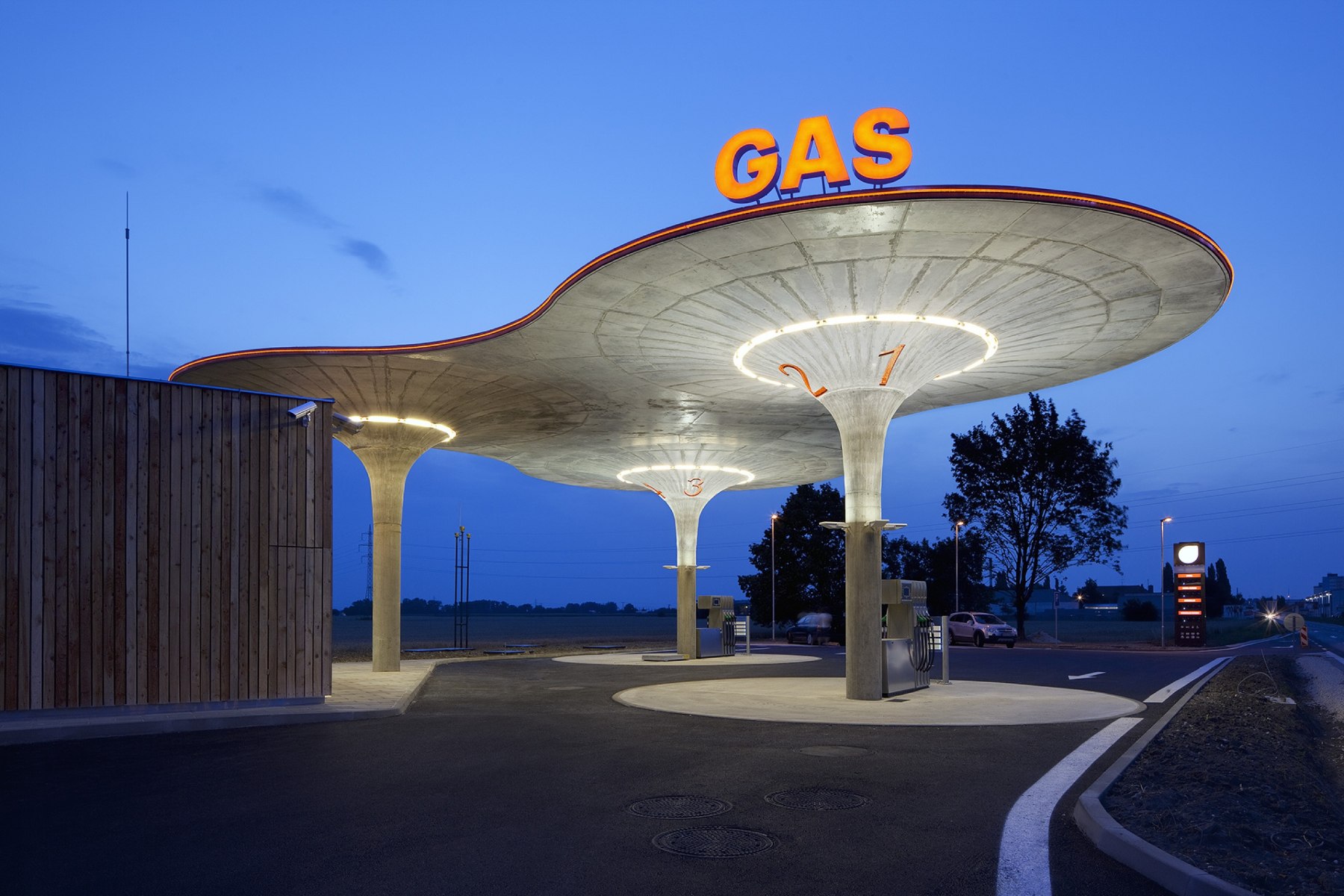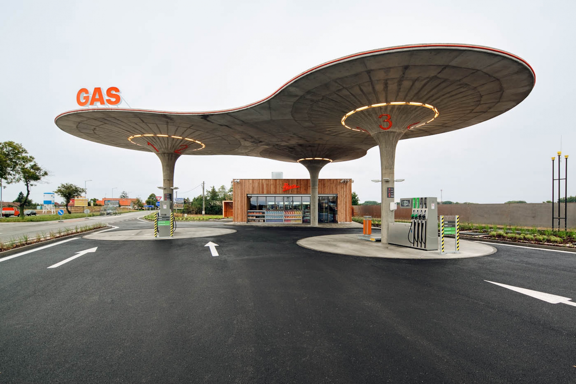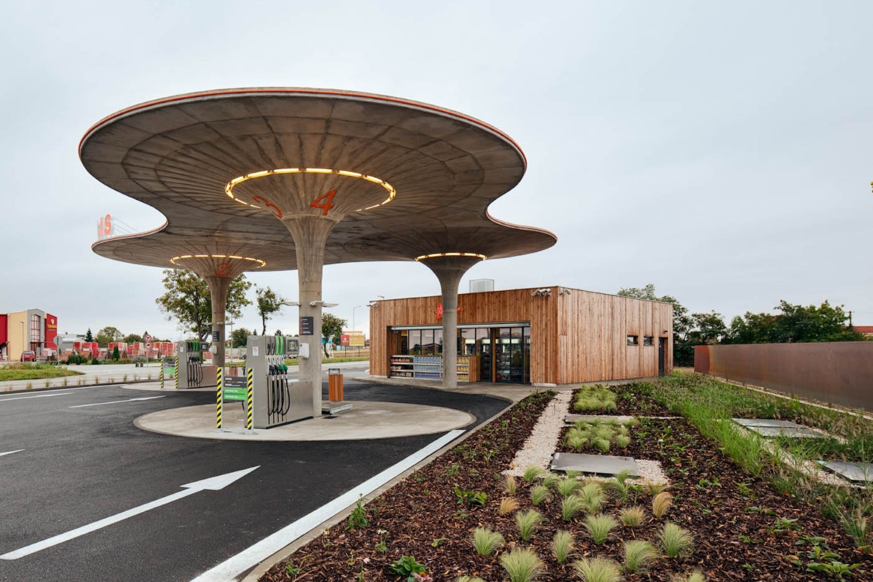Prostor okolo stojanů s pohonnými hmotami je zastřešen zakřivenou plochou nesou třemi sloupy. Tři „houby“ poskytují průchod suchou nohou až do kiosku. Na jednotlivých houbách nejsou pro zachování vizuálního zážitku přítomny žádné rušivé prvky. Místo okapů voda stéká do dešťových vpustí vedených středem každého sloupu. Ve sloupech jsou ukryty také další nezbytné technologie jako odvětrávání a svítidla.