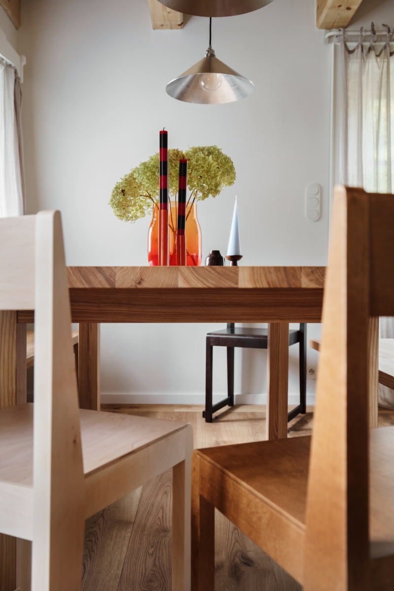 Interiér navazuje na původní dispozici, avšak v moderním pojetí. V přízemí se nachází útulná světnice s funkčními kachlovými kamny, kuchyní a posezením s francouzským oknem do zahrady. K dispozici jsou dvě koupelny a v patře dvě ložnice. Jednoduchý, světlý nábytek kombinuje minulost se současností, doplňují jej renovované kousky a originální osvětlení. Celý prostor působí svěže, přirozeně a harmonicky.