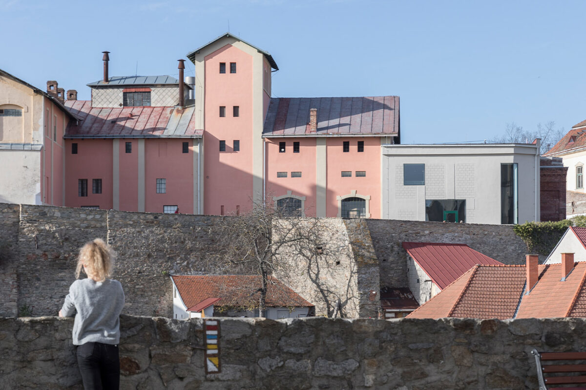 Pivovar z 19. století byl zrestaurován – a zachráněn – tak, aby si zachoval svůj hodnotný původní výraz. Klasická obdélníková budova byla přepracována na historický výstavní prostor, který vybízí návštěvníky k ponoření se do bohaté historie moravské kultury vína a jeho degustace. Z bývalé technické haly byla naopak zachována pouze vnější struktura s úmyslem vytvořit zcela nový koncept, který v rámci Enotéky znojemských vín funguje jako volný otevřený prostor. Do strohého bílého interiéru je vložena tmavá vestavba, hravá kompozice v různých úrovních rozdělující tuto „bílou krabici“ na jednotlivé prostory a menší vzájemně propojené místnosti, čímž odkazuje na měřítko a atmosféru tradičních místních vinných sklepů. Tento nově pojatý vinný bar tak mění původní význam architektury i funkce haly.