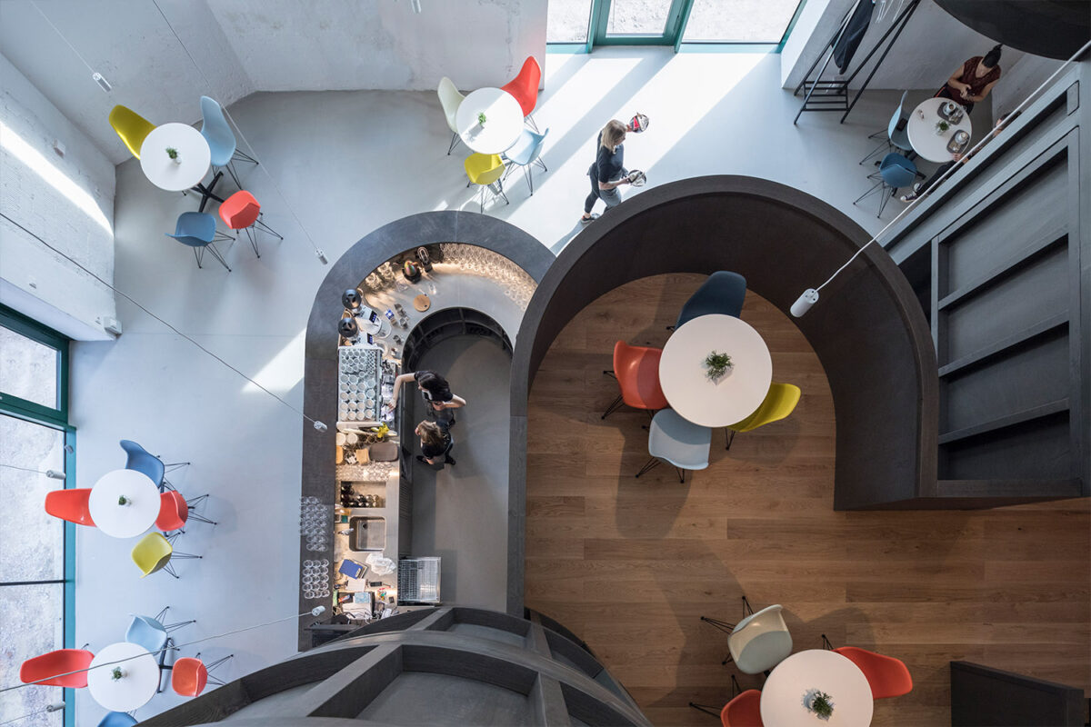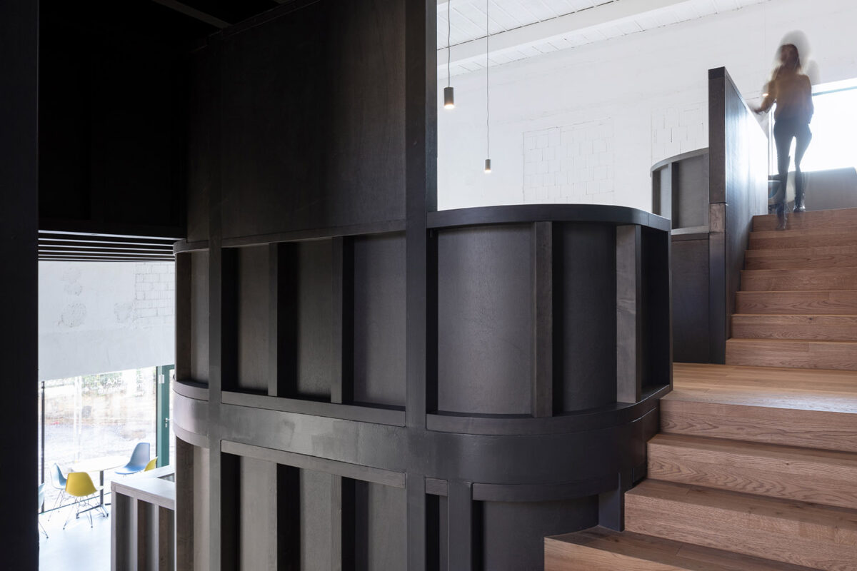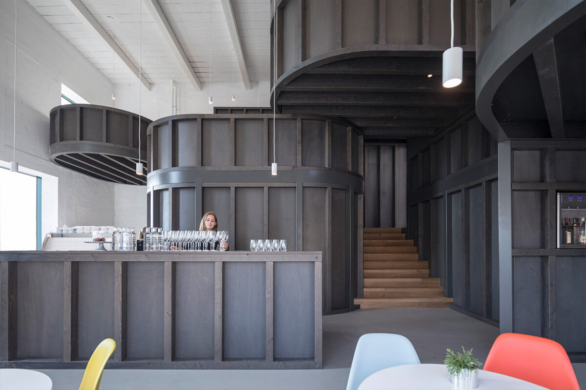 Pivovar z 19. století byl zrestaurován – a zachráněn – tak, aby si zachoval svůj hodnotný původní výraz. Klasická obdélníková budova byla přepracována na historický výstavní prostor, který vybízí návštěvníky k ponoření se do bohaté historie moravské kultury vína a jeho degustace. Z bývalé technické haly byla naopak zachována pouze vnější struktura s úmyslem vytvořit zcela nový koncept, který v rámci Enotéky znojemských vín funguje jako volný otevřený prostor. Do strohého bílého interiéru je vložena tmavá vestavba, hravá kompozice v různých úrovních rozdělující tuto „bílou krabici“ na jednotlivé prostory a menší vzájemně propojené místnosti, čímž odkazuje na měřítko a atmosféru tradičních místních vinných sklepů. Tento nově pojatý vinný bar tak mění původní význam architektury i funkce haly.