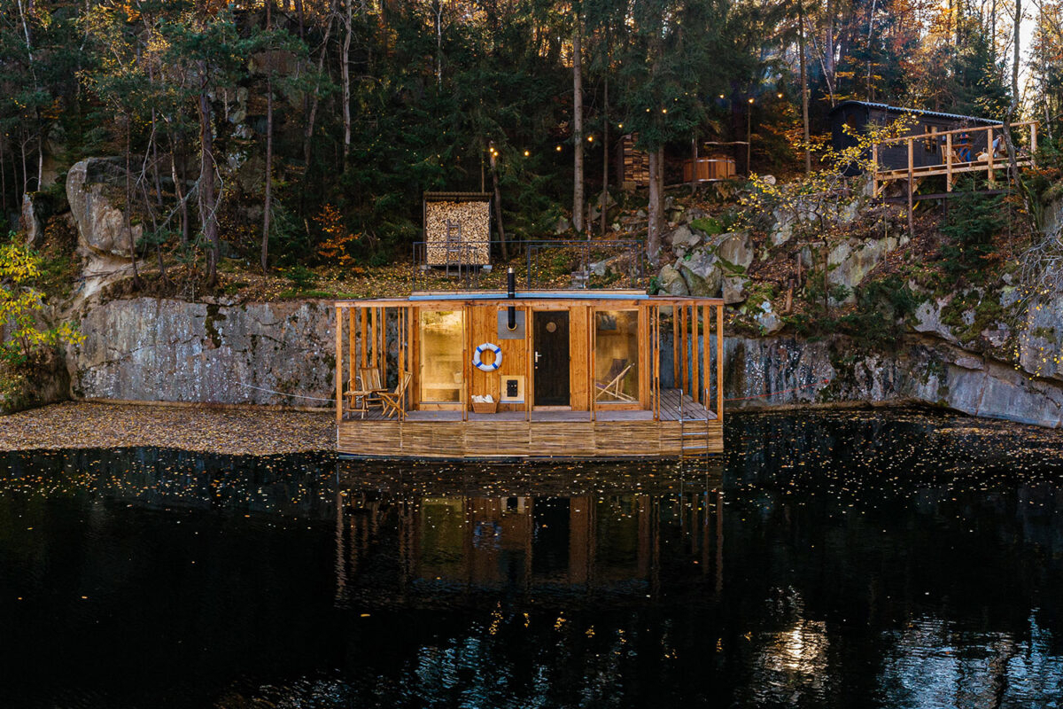 Sauna dokonale splývá s okolním prostředím a kouzelná atmosféra lomu už je poté pouze třešničkou na dortu. Kromě samotné sauny má dřevostavba umístěná na pontonu také místo pro posezení nebo pochozí chodník. Ve středu pontonu stojí buňka z modřínového dřeva věnovaná jak samotné sauně, tak odpočívárně s útulným interiérem ze smrkového dřeva. Zbytek prostoru patří venkovnímu ochozu, ze kterého lze skočit přímo do ledové vody.