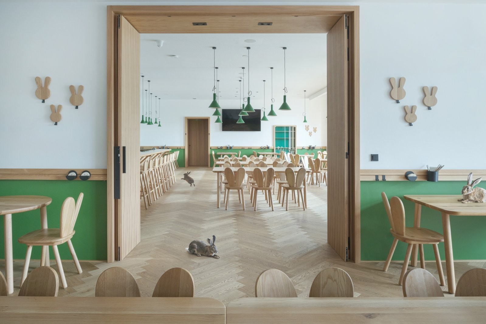 Interiér je funkční a bez zbytečných dekorací. Nábytek navržený Lukou Križkem z IO Studia zahrnuje králičí motivy v židlích, držácích na podnosy a věšácích, přinášející hravost a originalitu. Dubové obložení společenského sálu nejen chrání, ale také zlepšuje akustiku. Na druhém patře vznikly dva nové sociální byty, které splňují potřeby obce.
