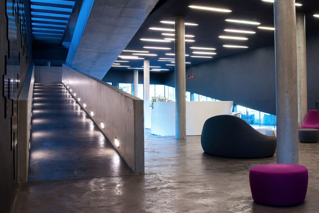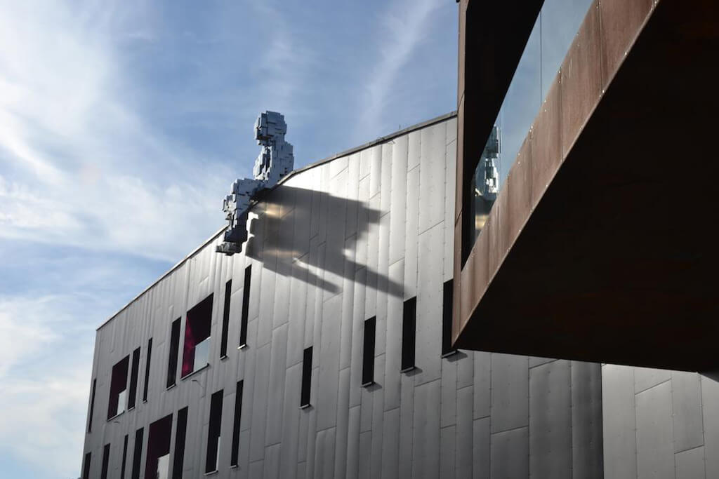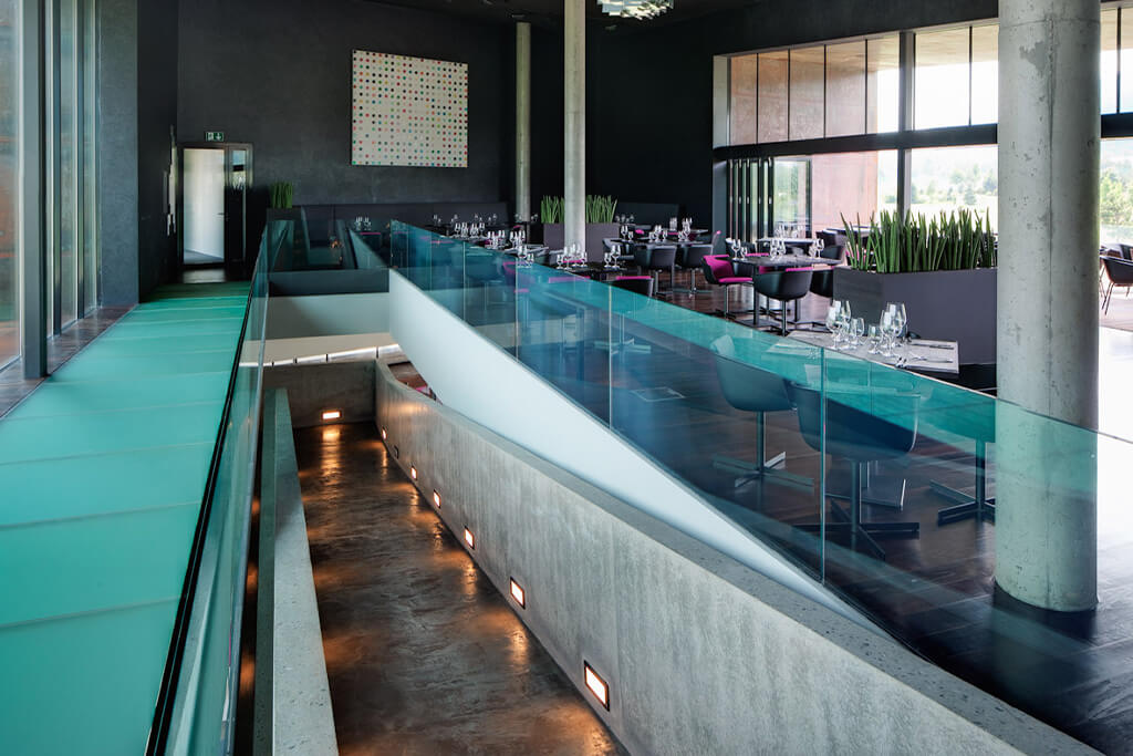 Ve středu hotelu se nachází hlavní vstup, restaurace a lobby. V budově se objevují nečekané prvky, je na každém pozorném vnímavém návštěvníkovi, co objeví a jaký si k tomu vytvoří příběh. Umělecké díla v hotelu jsou originály od předních světových i českých umělců. Na stavbu byly použity takové materiály, aby co nejvíce zachovaly minimalistický styl – beton, sklo, kámen a ocelový plech. A to se díky barvám jako je šedá, bílá a černá skvěle podařilo.