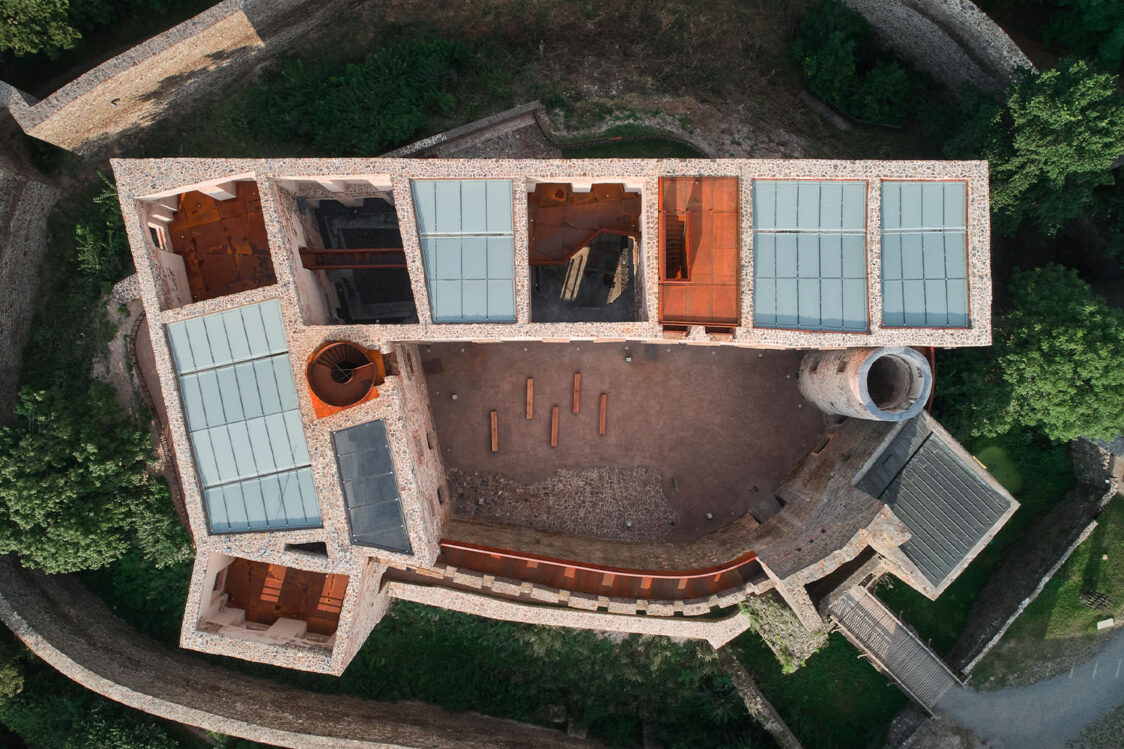 Památkový ústav dbal na zachování autenticity hradu, proto například zastřešení paláce bylo povoleno pouze částečné a nesmělo přesahovat úroveň obvodového zdiva. Do již existujících otvorů palácového torza přibyly nové prohlídkové trasy, které propojily přízemí s dosud nedostupnými úrovněmi stavby. Nové prvky, navržené v soudobém designu, jsou od historické konstrukce jasně čitelné. Architekti pracovali se třemi základními materiály, přičemž v každé vrstvě převládá jiný. Pro zastřešení byly zvoleny skleněné střechy na ocelových nosnících. Konstrukce schodišť a lávek o úroveň níž je řešena povětrnostně odolnou ocelí, která časem získá rezavý nádech. V přízemí paláce vede trasa po chodníčcích z leštěného betonu.