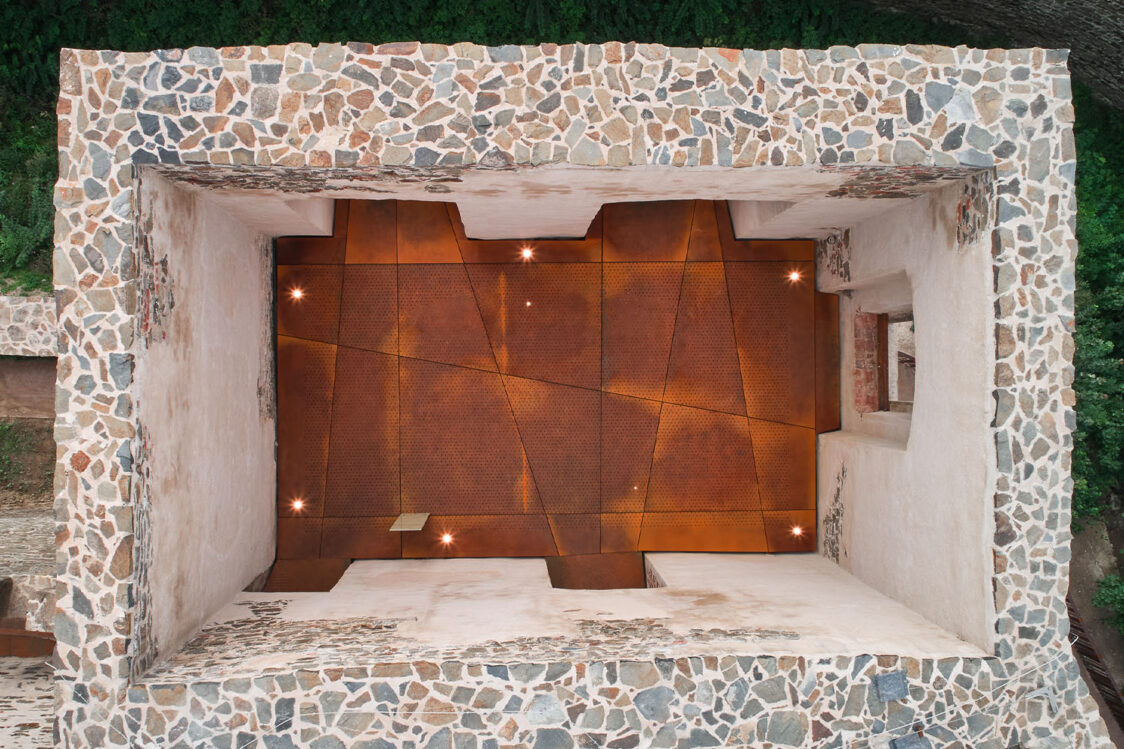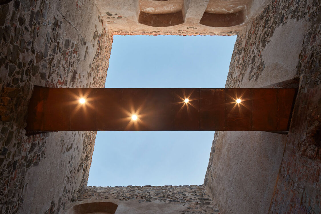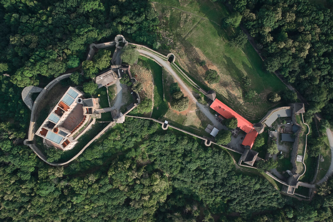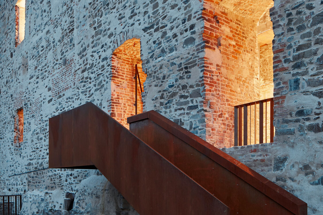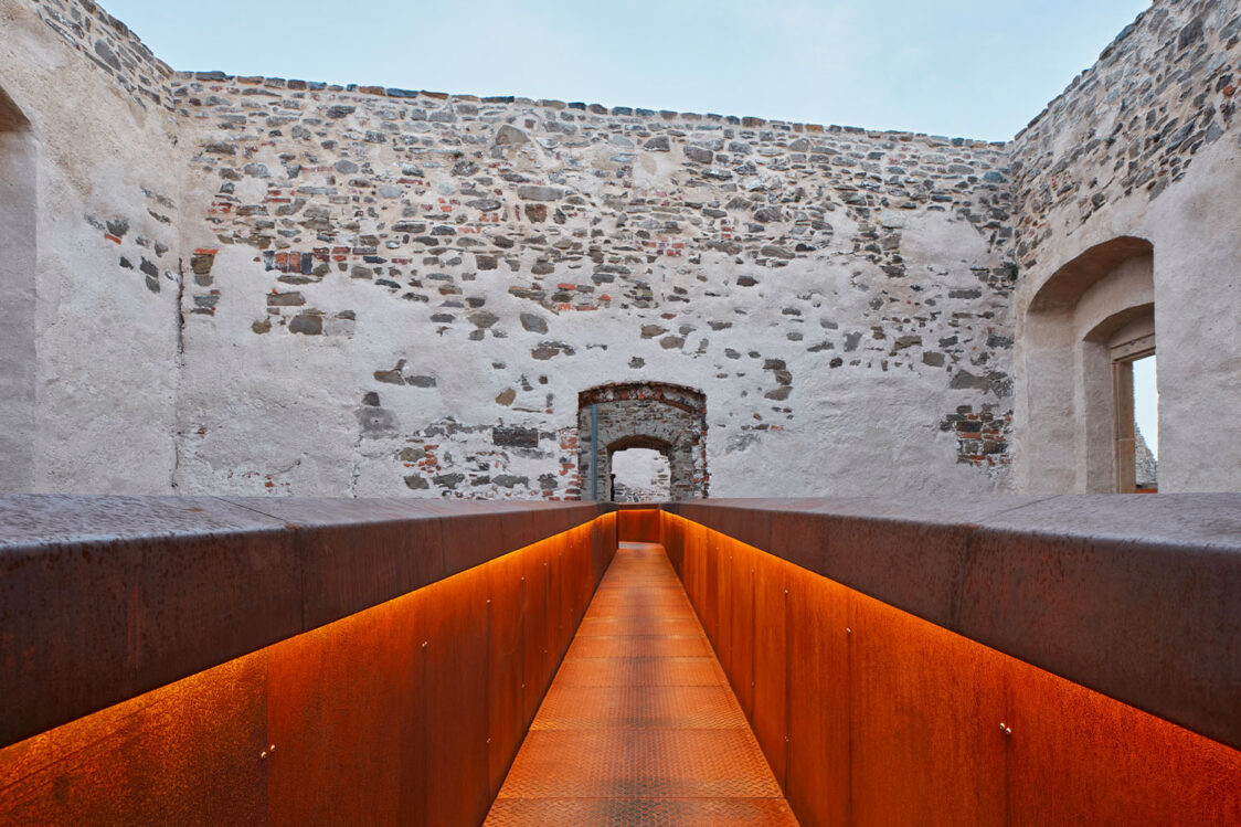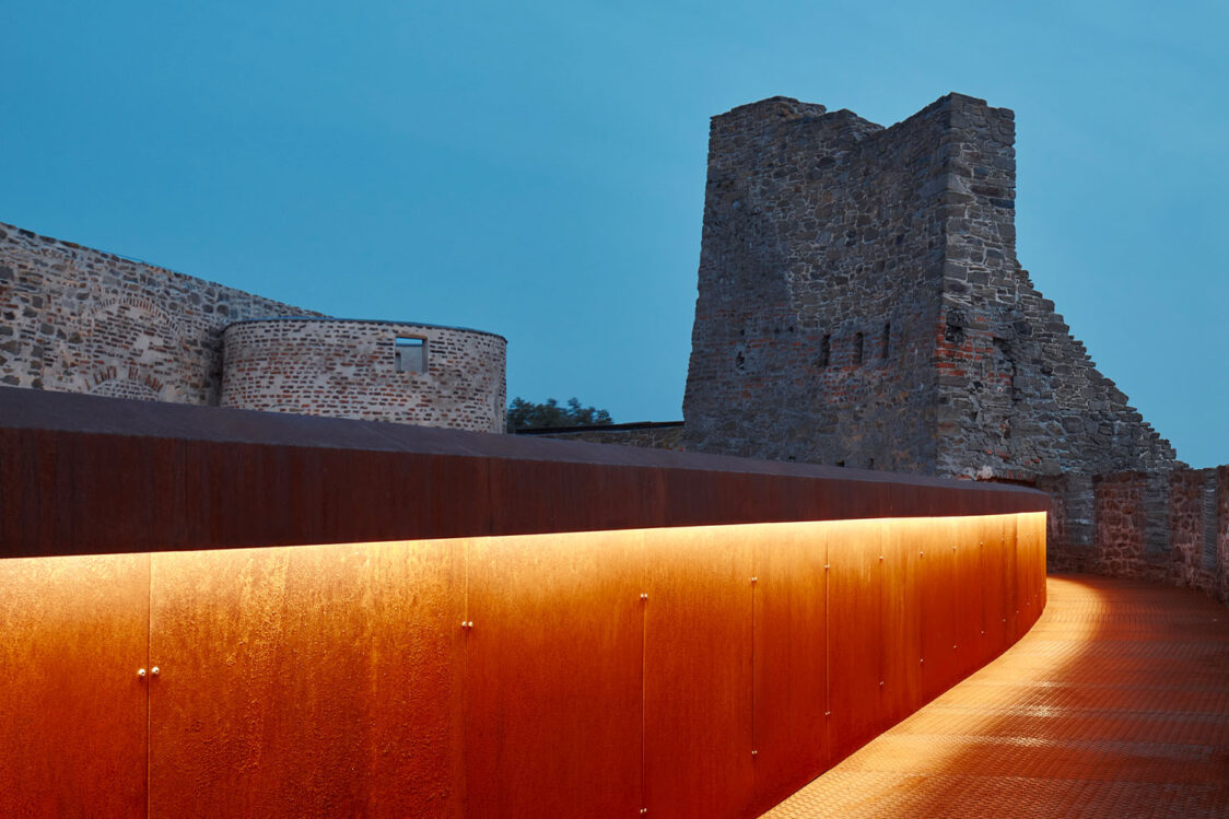 Památkový ústav dbal na zachování autenticity hradu, proto například zastřešení paláce bylo povoleno pouze částečné a nesmělo přesahovat úroveň obvodového zdiva. Do již existujících otvorů palácového torza přibyly nové prohlídkové trasy, které propojily přízemí s dosud nedostupnými úrovněmi stavby. Nové prvky, navržené v soudobém designu, jsou od historické konstrukce jasně čitelné. Architekti pracovali se třemi základními materiály, přičemž v každé vrstvě převládá jiný. Pro zastřešení byly zvoleny skleněné střechy na ocelových nosnících. Konstrukce schodišť a lávek o úroveň níž je řešena povětrnostně odolnou ocelí, která časem získá rezavý nádech. V přízemí paláce vede trasa po chodníčcích z leštěného betonu.