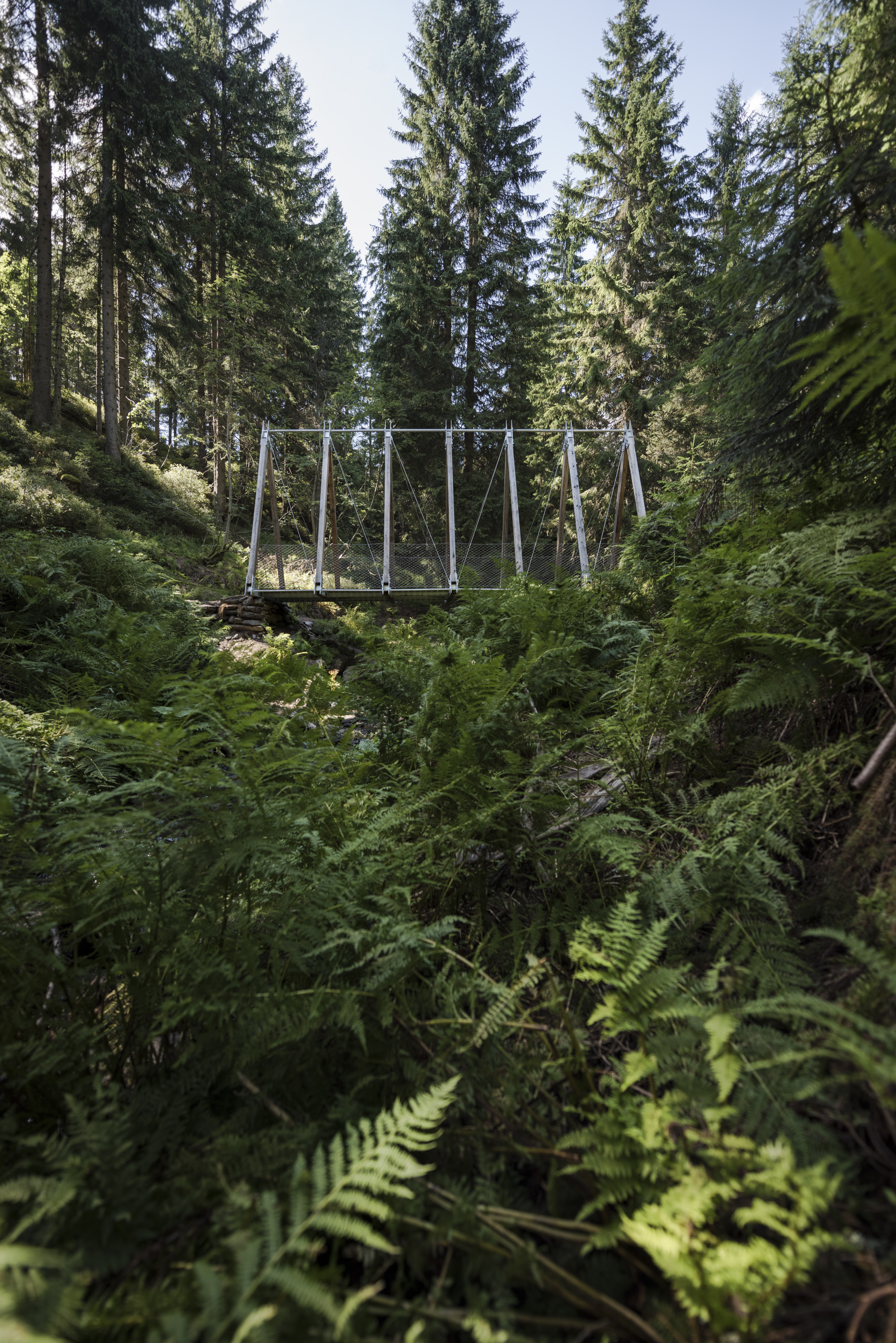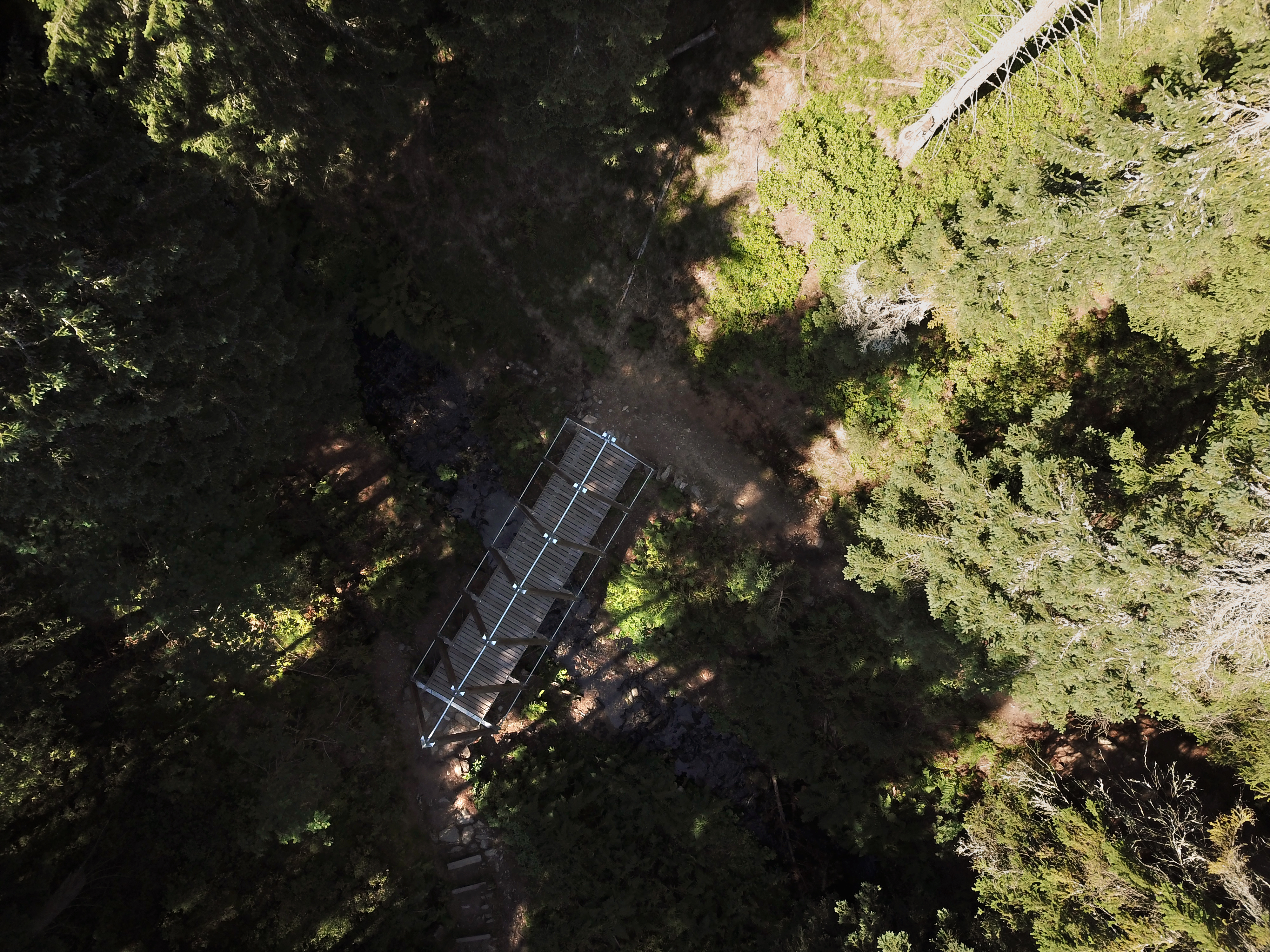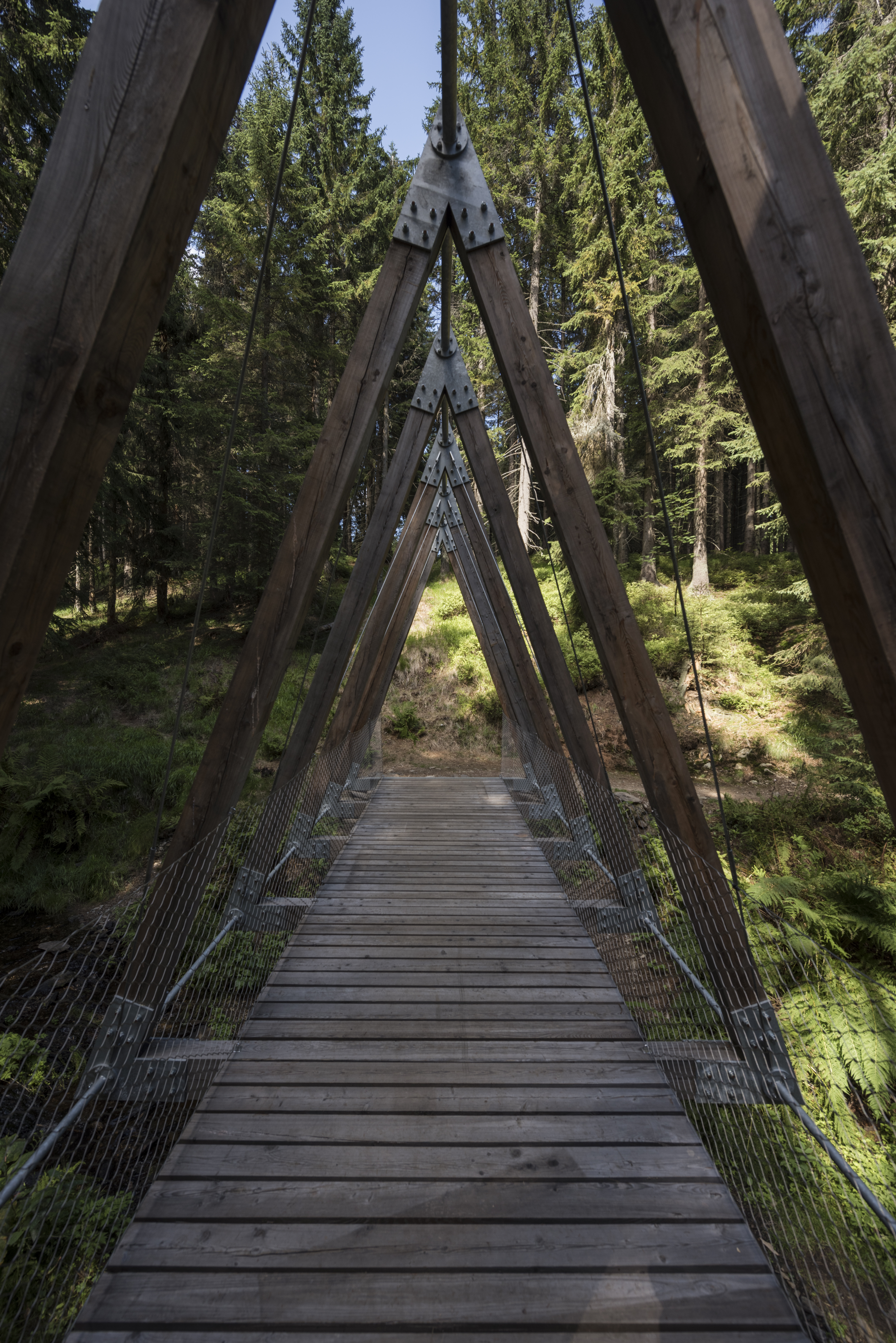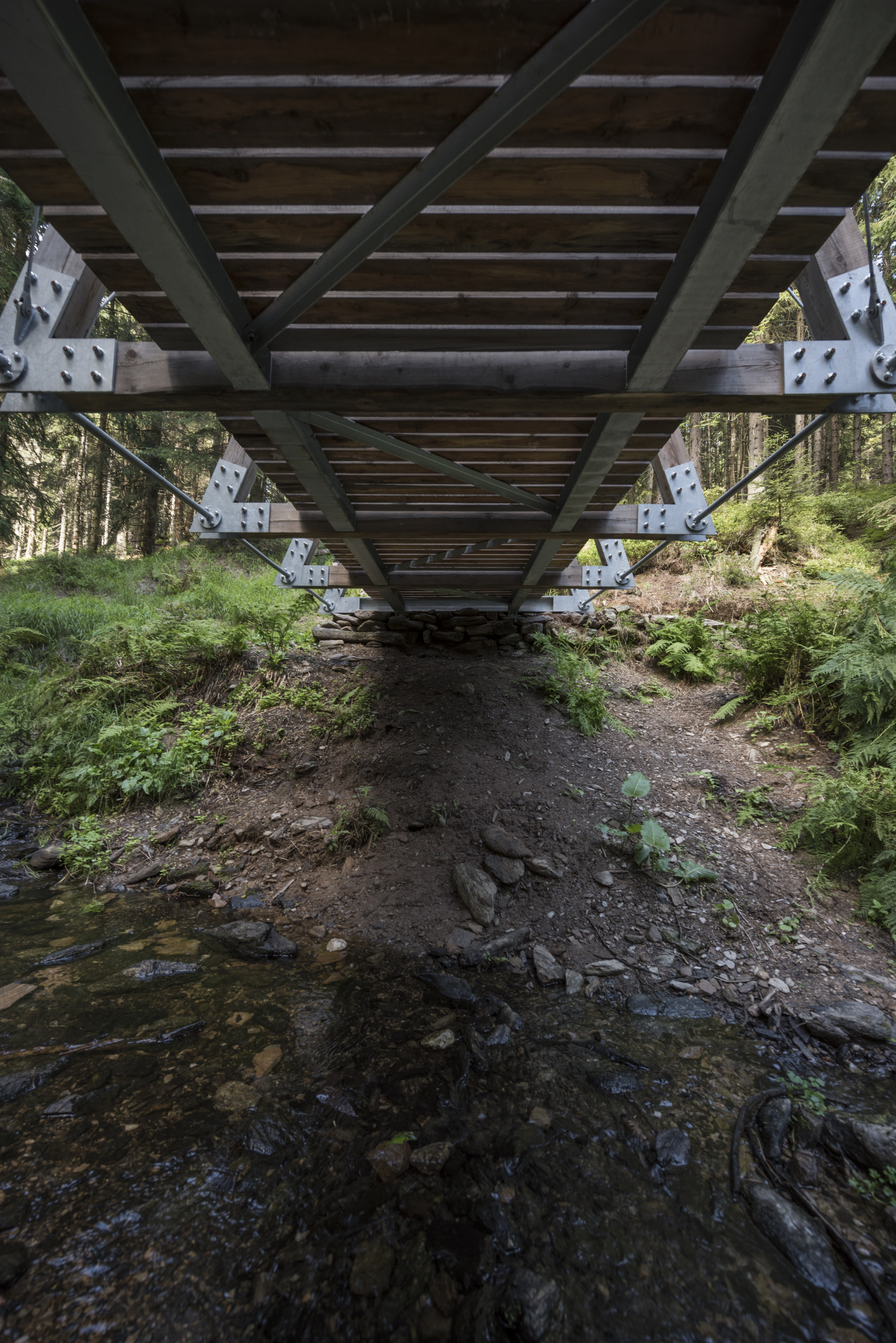 Konstrukce mostu je tvořena dřevěnými fošnami a sedmi rovnoramennými trojúhelníky ze dřeva, které jsou propojeny ocelovými prvky. Díky těmto trojúhelníkům působí celý most jako stan.