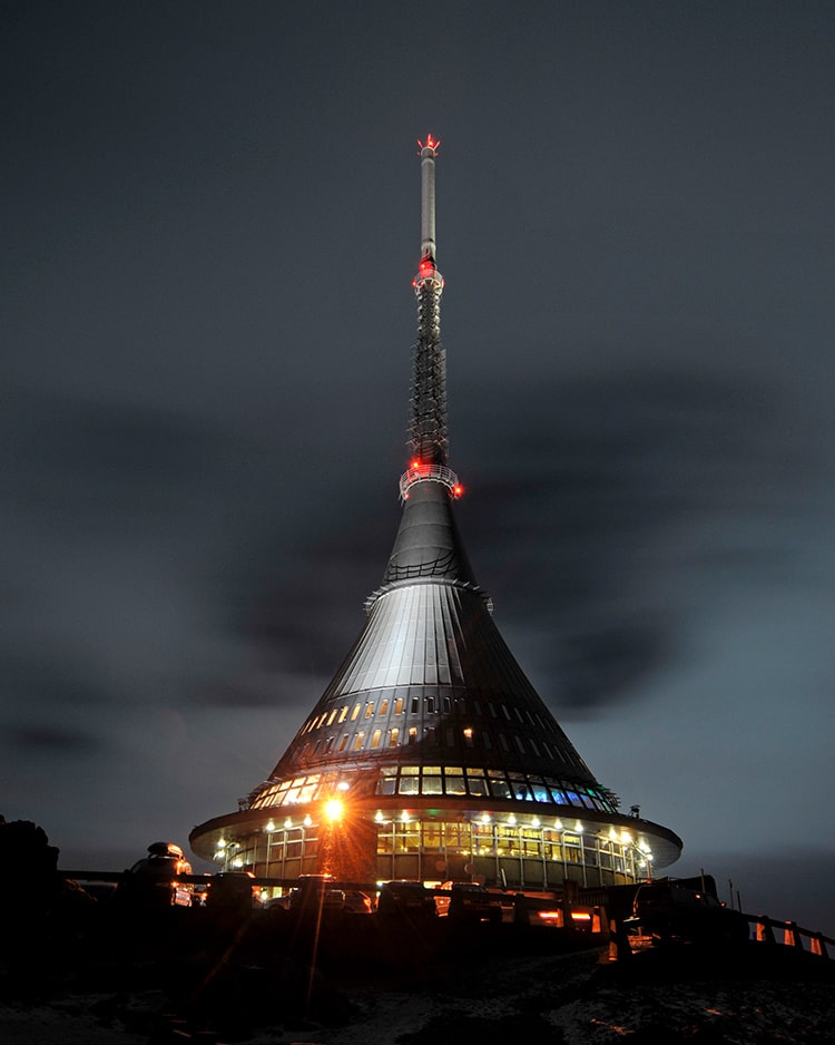 Na Ještědu se ve výšce 1012 m.n.m se nachází stejnojmenný vysílač a hotel. Tyčí se do výšky 94 metrů, jeho stavba začala v roce 1965 a skončila o 8 let později. Díky svému tvaru je extrémně odolný nepřízním počasí. Televizní vysílač a horský hotel navržený Karlem Hubáčkem získal v roce 1999 ocenění Stavba století. Hyperboloid, neboli jak se tvar stavby nazývá, prodlužuje vrchol hory Ještěd.