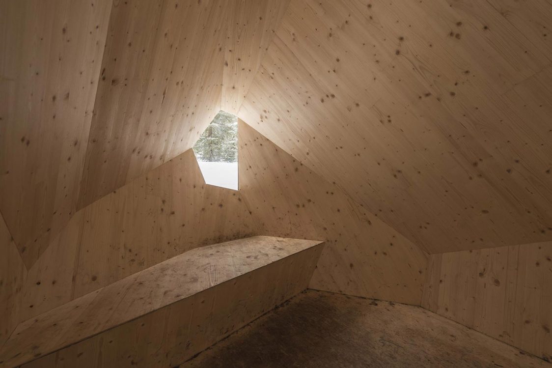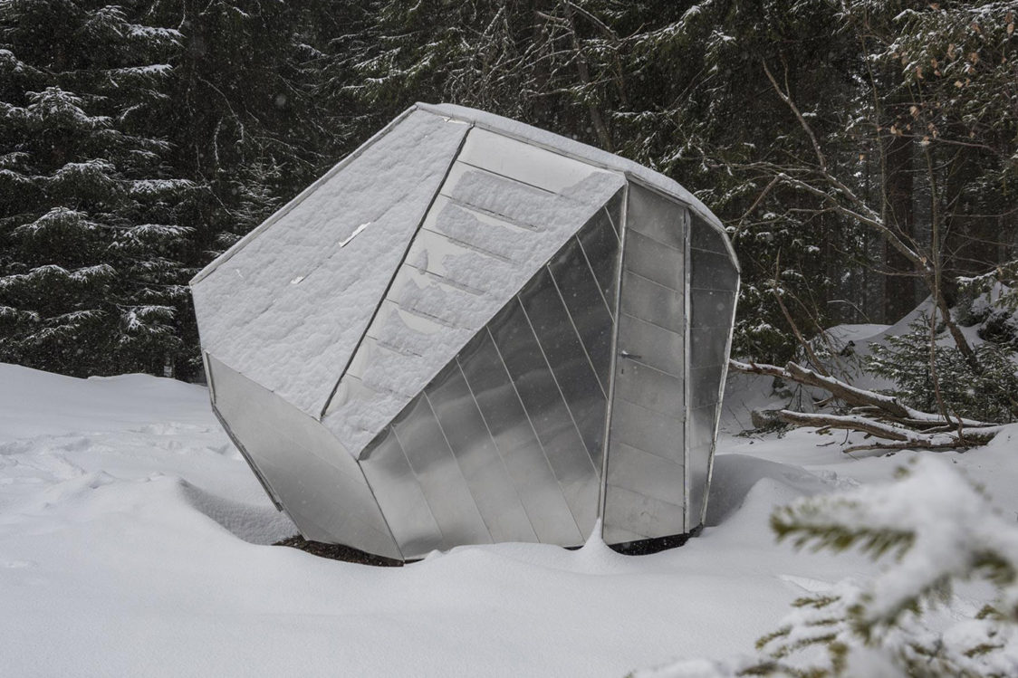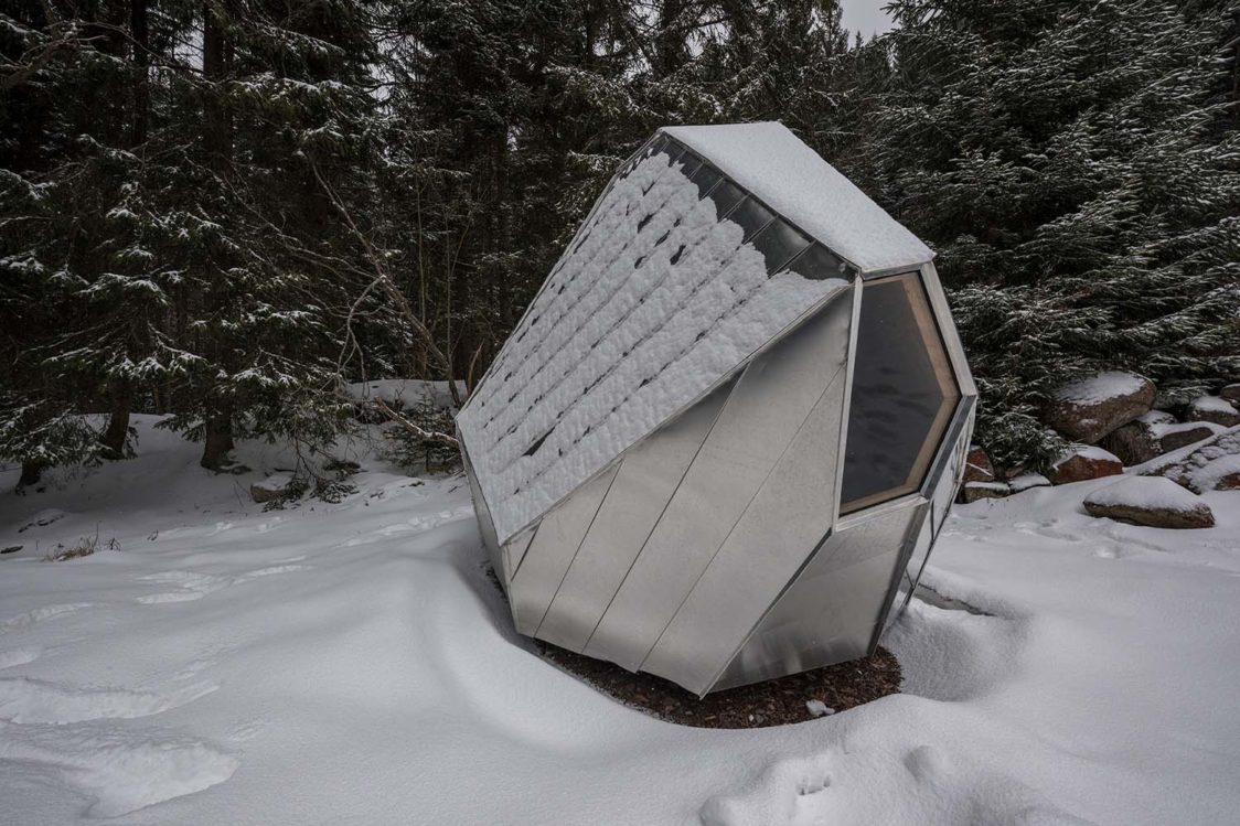 Díky dvěma oknům lze prohlédnout skrz, kde lze spatřit světlý interiér. Pod okny se nacházejí dvě zkosené lavičky. Plášť útulny je pokrytý falcovaným plechem, který měnit svůj vzhled stejně, jako když mech porůstá kámen.