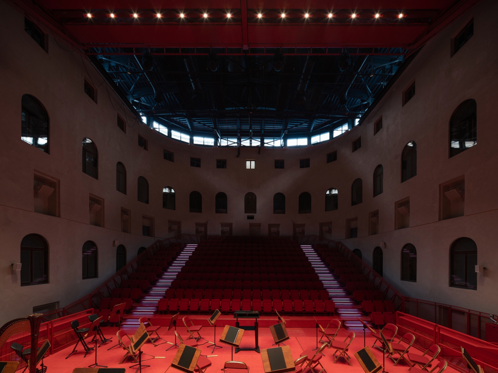Historická dvorana Císařských lázní se po více než sto letech dočkala nového života – vestavby koncertního sálu, který stojí samostatně na šesti ocelových nohách a nedotýká se původní stavby z roku 1895. Architekti zvolili odvážnou, signálně červenou formu, která vstupuje do dialogu s neorenesanční architekturou citlivě, ale bez skrývání své současné povahy.