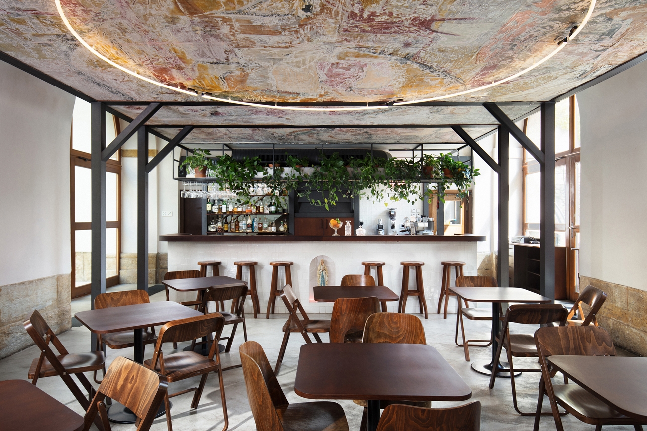 Dominantou interiéru je bar obložený ručně vyráběnou keramikou a tmavým dřevem odkazujícím na kostelní lavice. Originální zdobný povrch stropu, vytvořený z recyklované textilie a pryskyřice, evokuje barokní fresku. Celkovou atmosféru doplňuje kruhové svítidlo připomínající svatozář – symbol, který se propisuje do celého prostoru.