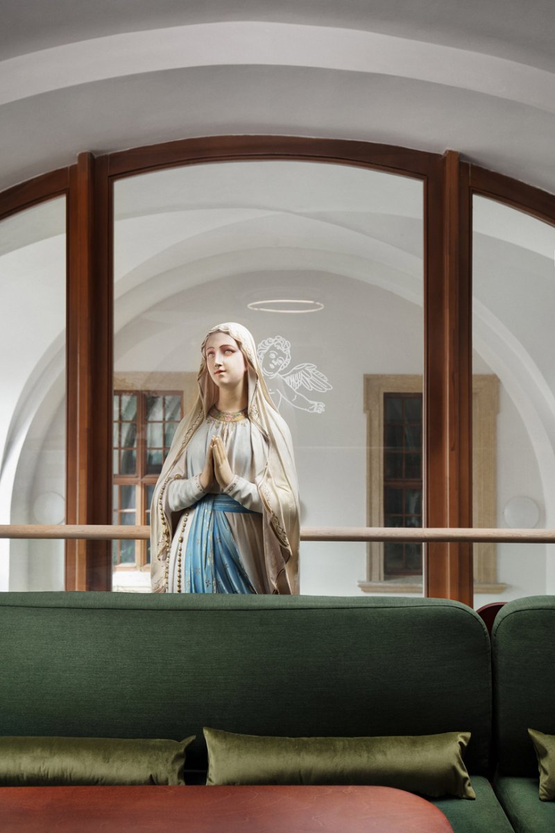 Vedle barokní kaple v areálu olomouckého jezuitského konviktu vznikla kavárna, jejíž interiér citlivě propojuje duchovní odkaz místa s moderním designem. Vysoký klenutý prostor je rozdělen vloženým patrem, které metaforicky připomíná strom – přízemí v zemitých tónech představuje kmen, zatímco patro s rostlinami a zeleným čalouněním evokuje korunu.