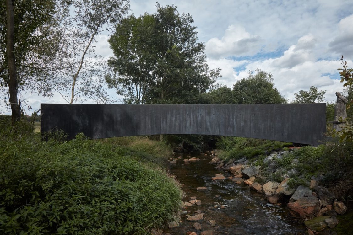 Lávka přes Dřetovický potok je zasazena do pozoruhodného přírodního kontextu, který do určité míry nahrazuje urbanizovaný veřejný prostor v obci. Návrh byl realizován v roce 2018 a o rok později se dostal až mezi šest finalistů v soutěži Česká cena za architekturu. Charakteristické prohnutí mostu na obou osách mu dodává stabilitu a dělá z něj neobyčejný most.