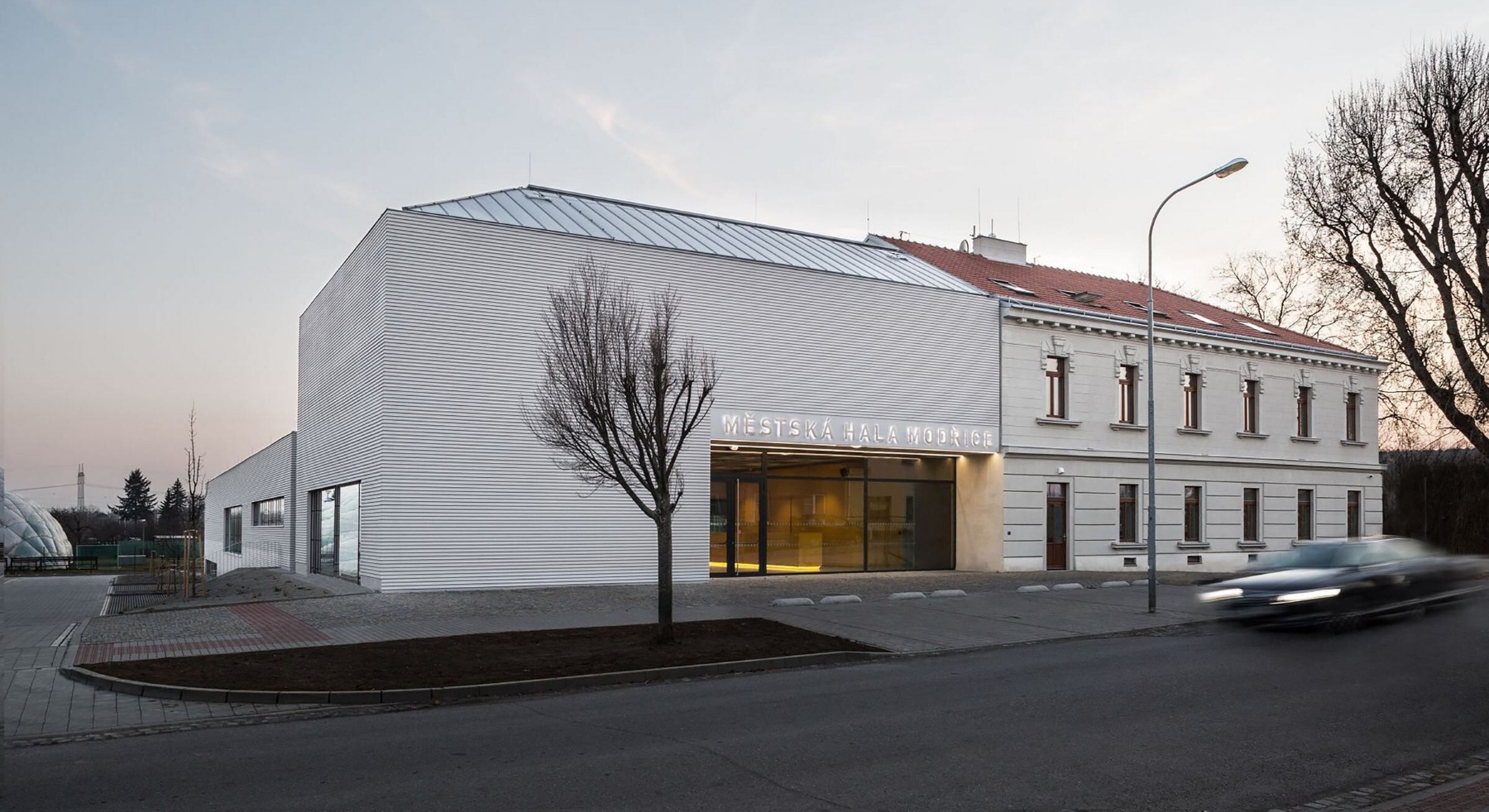Městská hala v Modřicích má potenciál stát se i komunitním centrem. Architektura domu vyjadřuje solidnost, vážnost a vzbuzuje klid. To vše od takového domu očekává i veřejnost. Stavba je proto navržena jako klidný dům pevně stojící na zemi. Velký objem haly je rozptýlen členěním do tří stejných hmot. Toto členění odpovídá vnitřnímu provozu – velká hala obsahuje velké hřiště, které lze rozdělit na tři hřiště nohejbalová/volejbalová.