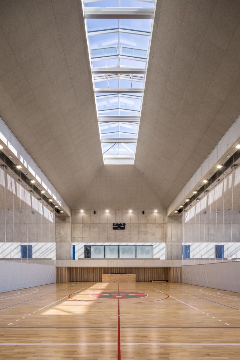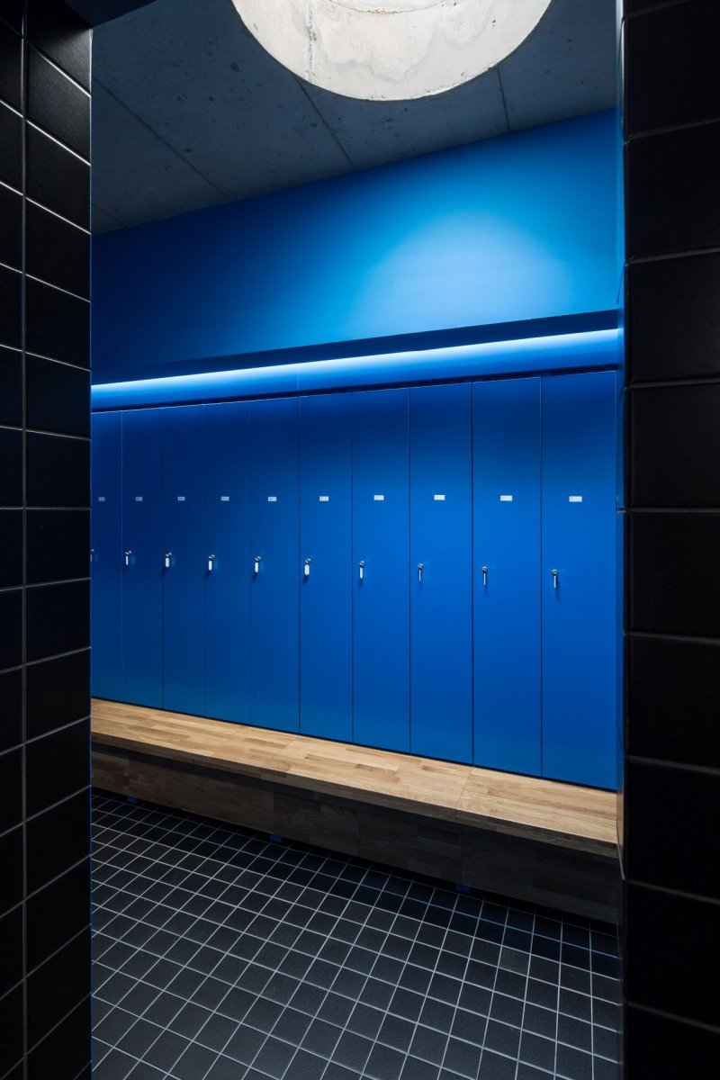 Interiér haly je navržen tak, aby měl každý návštěvník prostorový zážitek a v objektu se orientoval intuitivně. Průhledy do hlavní sportovní haly z foyer vedou diváky na tribunu. Cestou na tribunu příchozí míjejí prosklenou stěnu oddělující tribunu a posilovnu. Posilující jsou vlastně aktéry obrysového divadla pro příchozí a naopak. Suterén zabírají z velké časti šatny a bazén, který je díky svažitosti pozemku přirozeně prosvětlen Okna do bazénu jsou na úrovni terénu, parapet čelního okna tvoří nízké široké stupně, které slouží jako místo pro odpočinek nebo místo pro posezení dětí při výuce plavaní. Součástí bazénu je i relaxační whirlpool.
