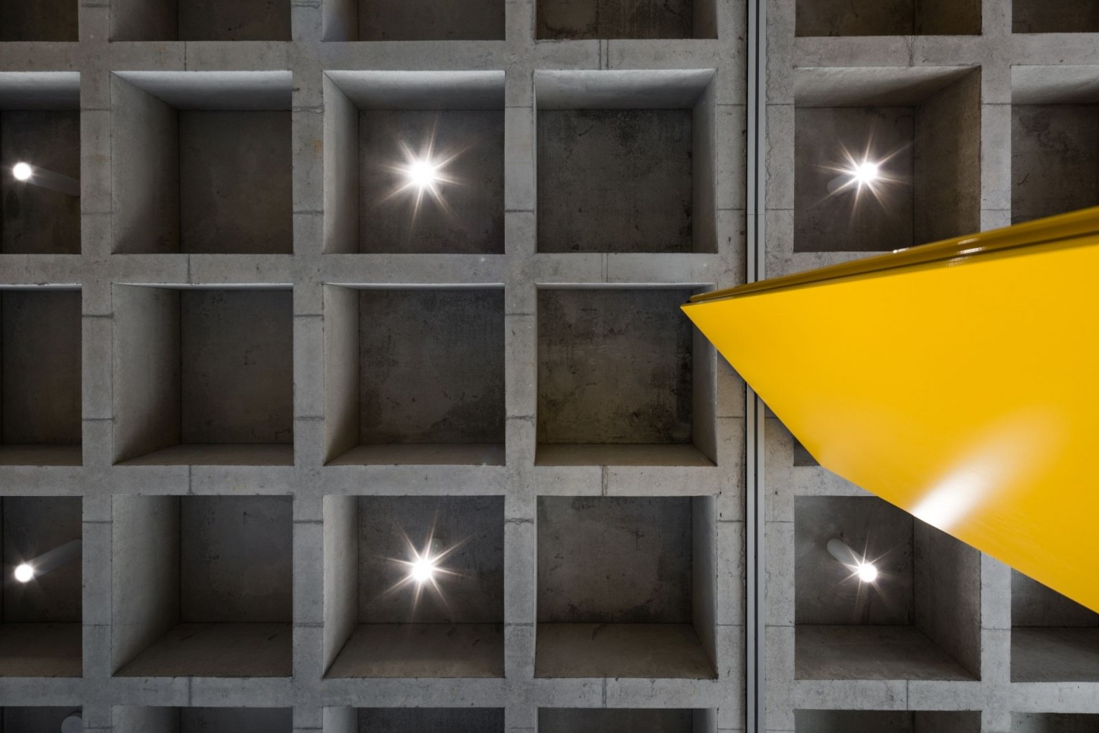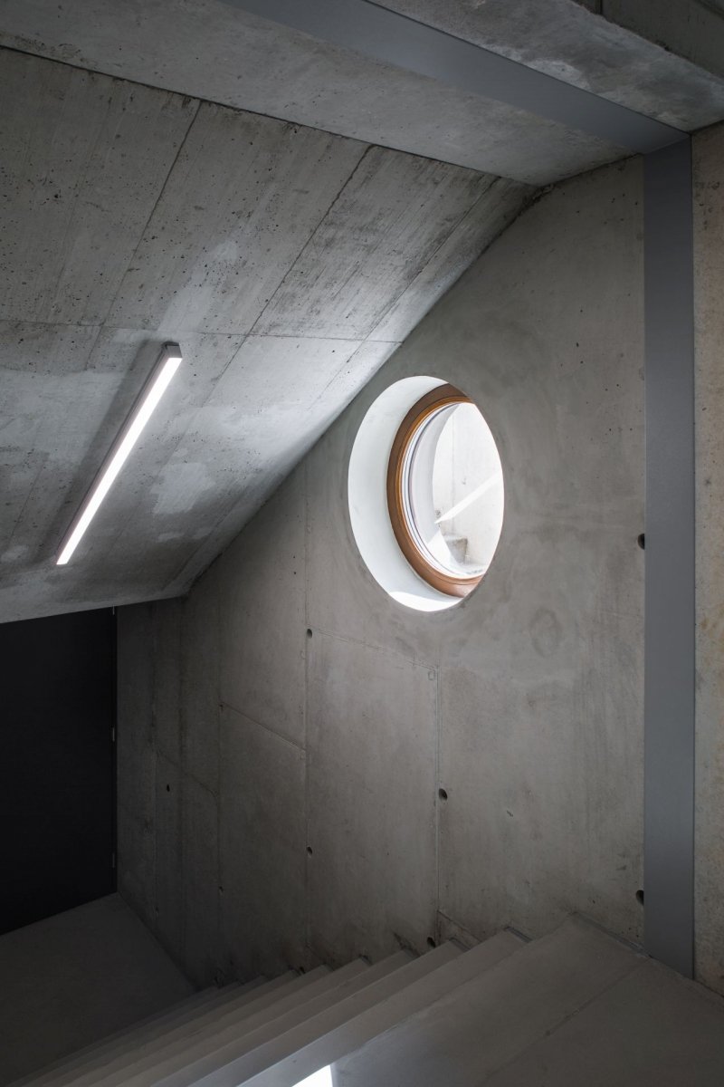 Fasádu nových částí domu tvoří omítka profilovaná do horizontálních říms průřezu pravoúhlého trojúhelníku. Toto členění dodá velkým plochám detail a lidské měřítko. Střecha městské haly je plechová, tónovaná v barvě omítky.