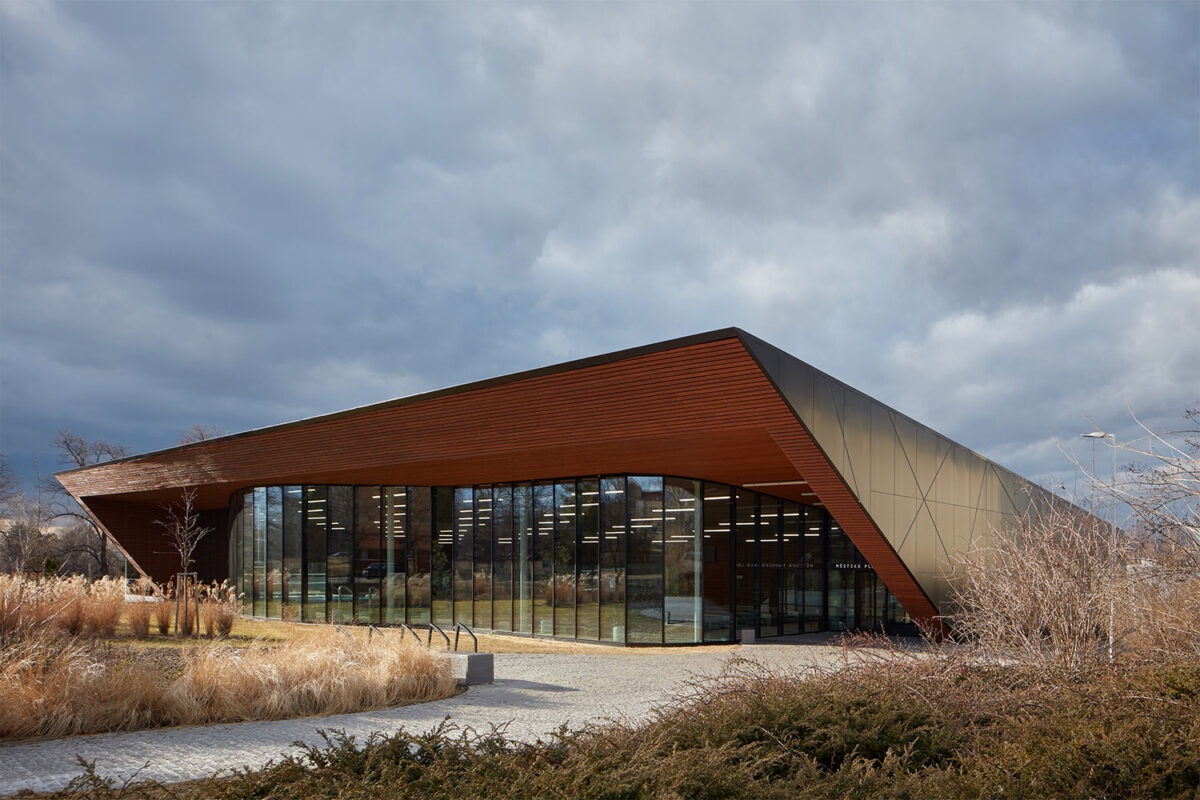 Černý dynamicky tvarovaný krystal, ze všech stran spoře otevřený, na jižní straně zcela odhaluje vnitřní svět plavecké haly. Zvlněná skleněná fasáda orientovaná do veřejného prostoru navazujícího na okolní budovy úřadu. Vzájemná interakce aktérů odhaluje tajemství pohybu a vybízí místní rezidenty k trávení volného času aktivní sportovní činností.