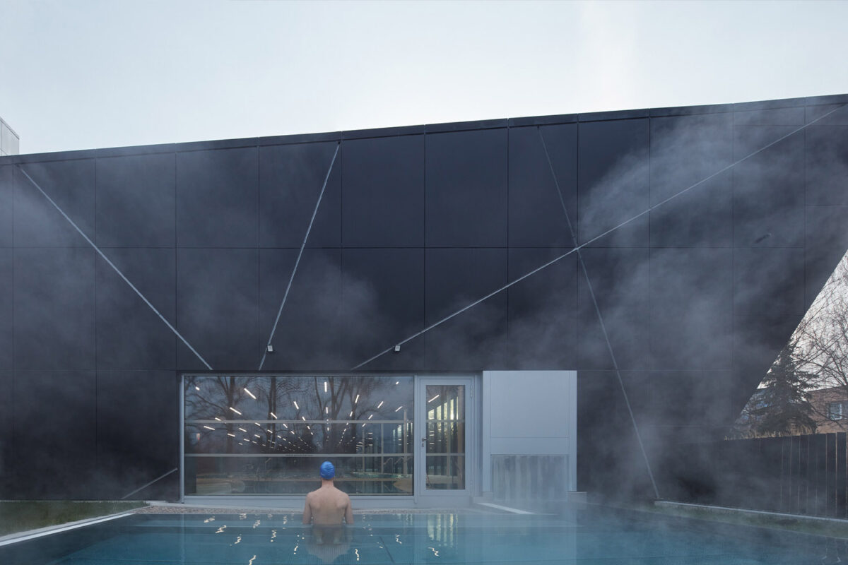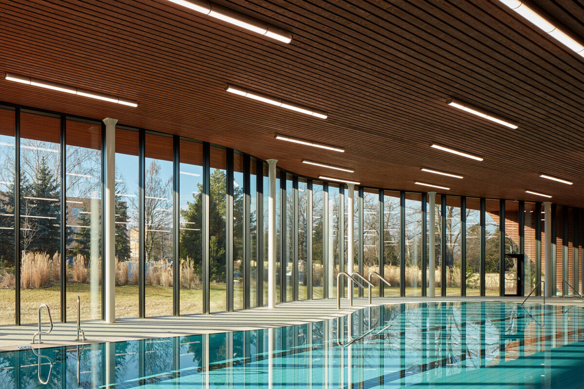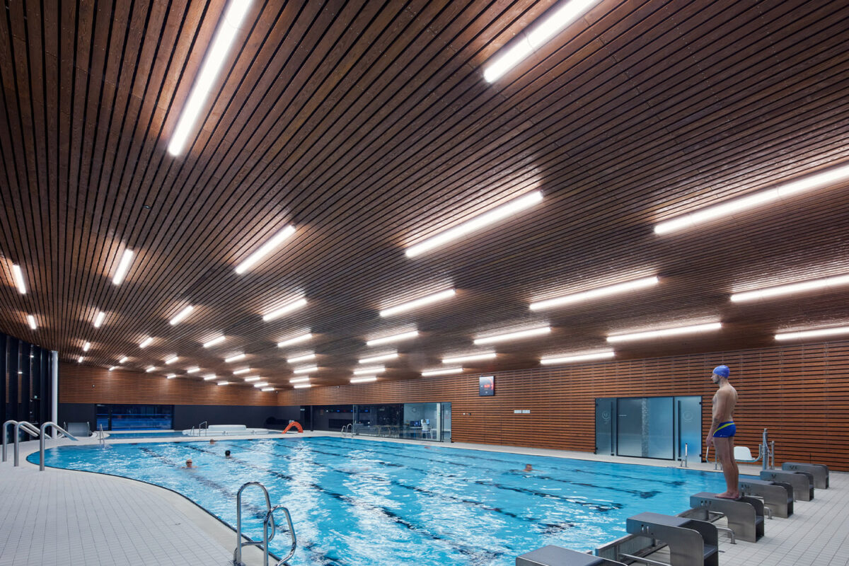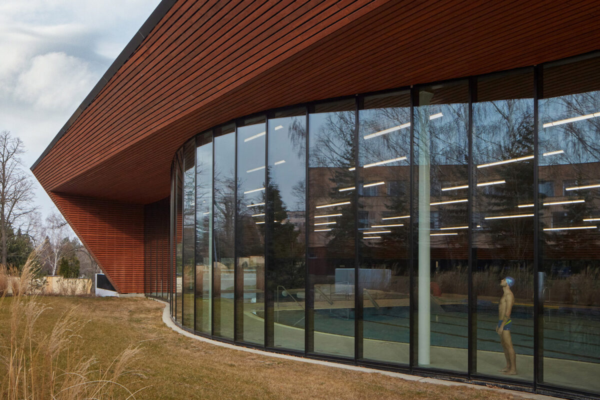 Černý dynamicky tvarovaný krystal, ze všech stran spoře otevřený, na jižní straně zcela odhaluje vnitřní svět plavecké haly. Zvlněná skleněná fasáda orientovaná do veřejného prostoru navazujícího na okolní budovy úřadu. Vzájemná interakce aktérů odhaluje tajemství pohybu a vybízí místní rezidenty k trávení volného času aktivní sportovní činností.