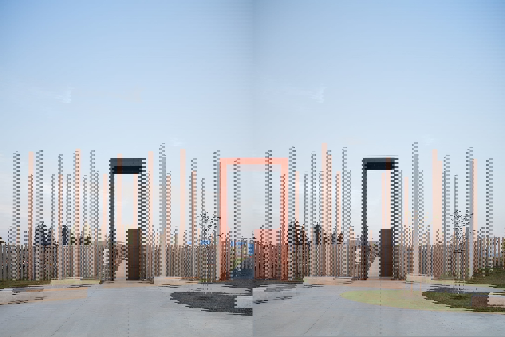 Pietnost místa a přírodní charakter nastínily, jak volit materiálové řešení. Ocel s kontrolovanou korozí, železobeton a dřevo. Cortenová ocel jako symbol postupného stárnutí je použita na vstupním portálu. Portál – monumentální, strohá těžká brána dvou světů. Rozměrná konstrukce brány v kombinaci s betonovými sloupy slouží zároveň jako hlavní orientační bod v rozlehlém areálu. Koncové body hlavních cest mají svůj cíl – místa s lavičkami k zastavení, k rozjímání. Oblíbené místo – jižní cíp – zátoka s malou vodní plochou. Dnes již i s rybími obyvateli. Díky neznámému dárci. První známka přijetí tohoto území obyvateli.