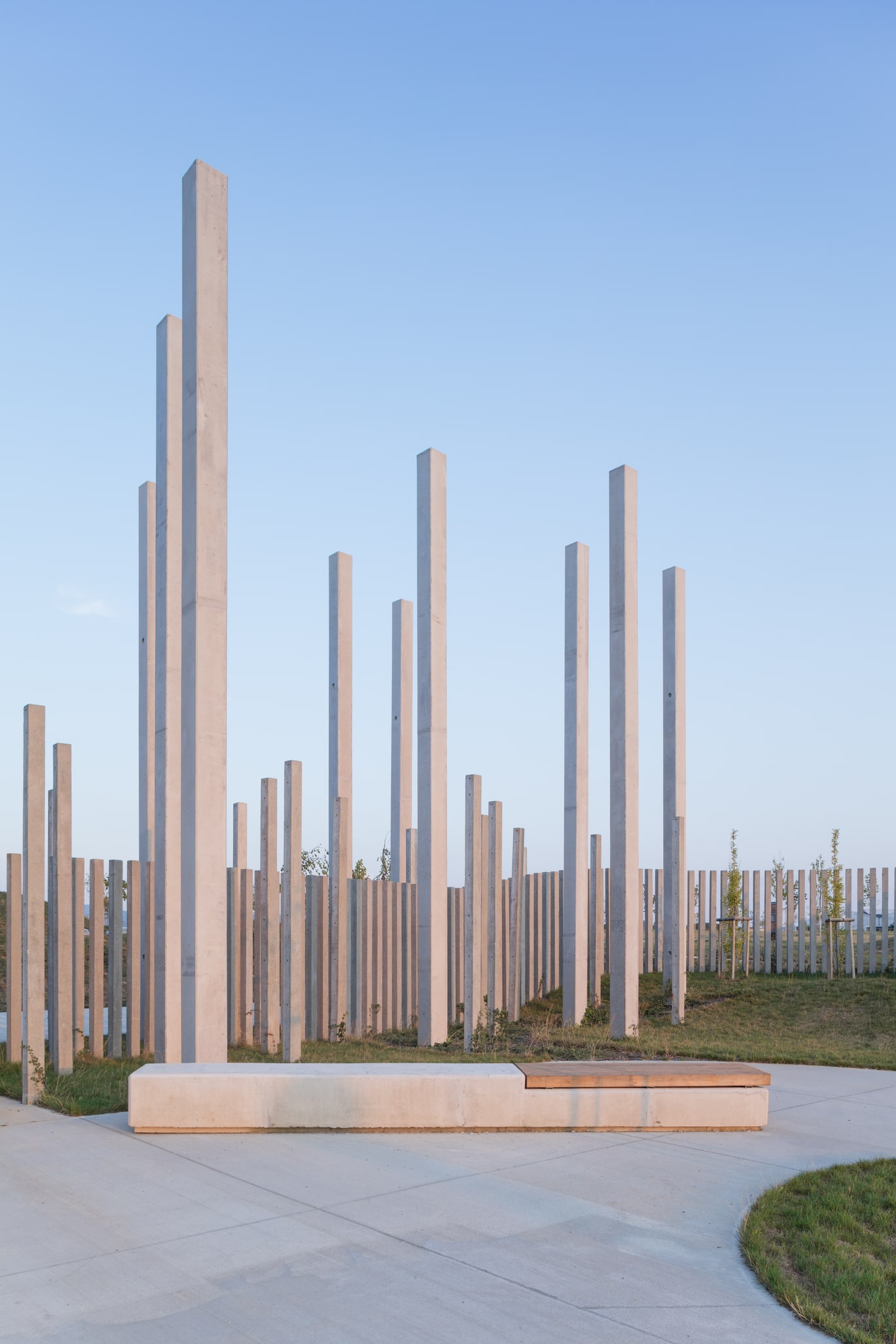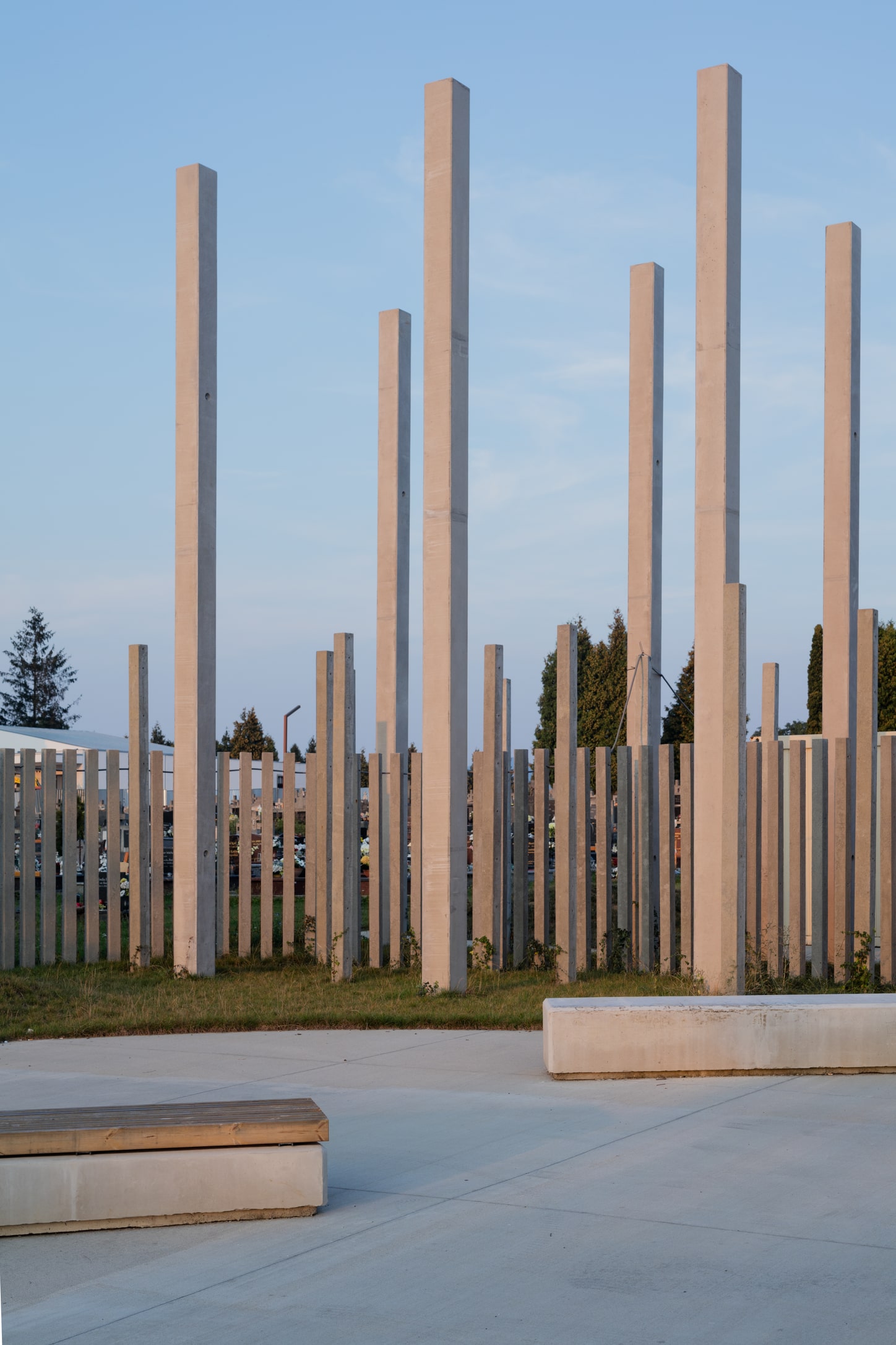 Pietnost místa a přírodní charakter nastínily, jak volit materiálové řešení. Ocel s kontrolovanou korozí, železobeton a dřevo. Cortenová ocel jako symbol postupného stárnutí je použita na vstupním portálu. Portál – monumentální, strohá těžká brána dvou světů. Rozměrná konstrukce brány v kombinaci s betonovými sloupy slouží zároveň jako hlavní orientační bod v rozlehlém areálu. Koncové body hlavních cest mají svůj cíl – místa s lavičkami k zastavení, k rozjímání. Oblíbené místo – jižní cíp – zátoka s malou vodní plochou. Dnes již i s rybími obyvateli. Díky neznámému dárci. První známka přijetí tohoto území obyvateli.