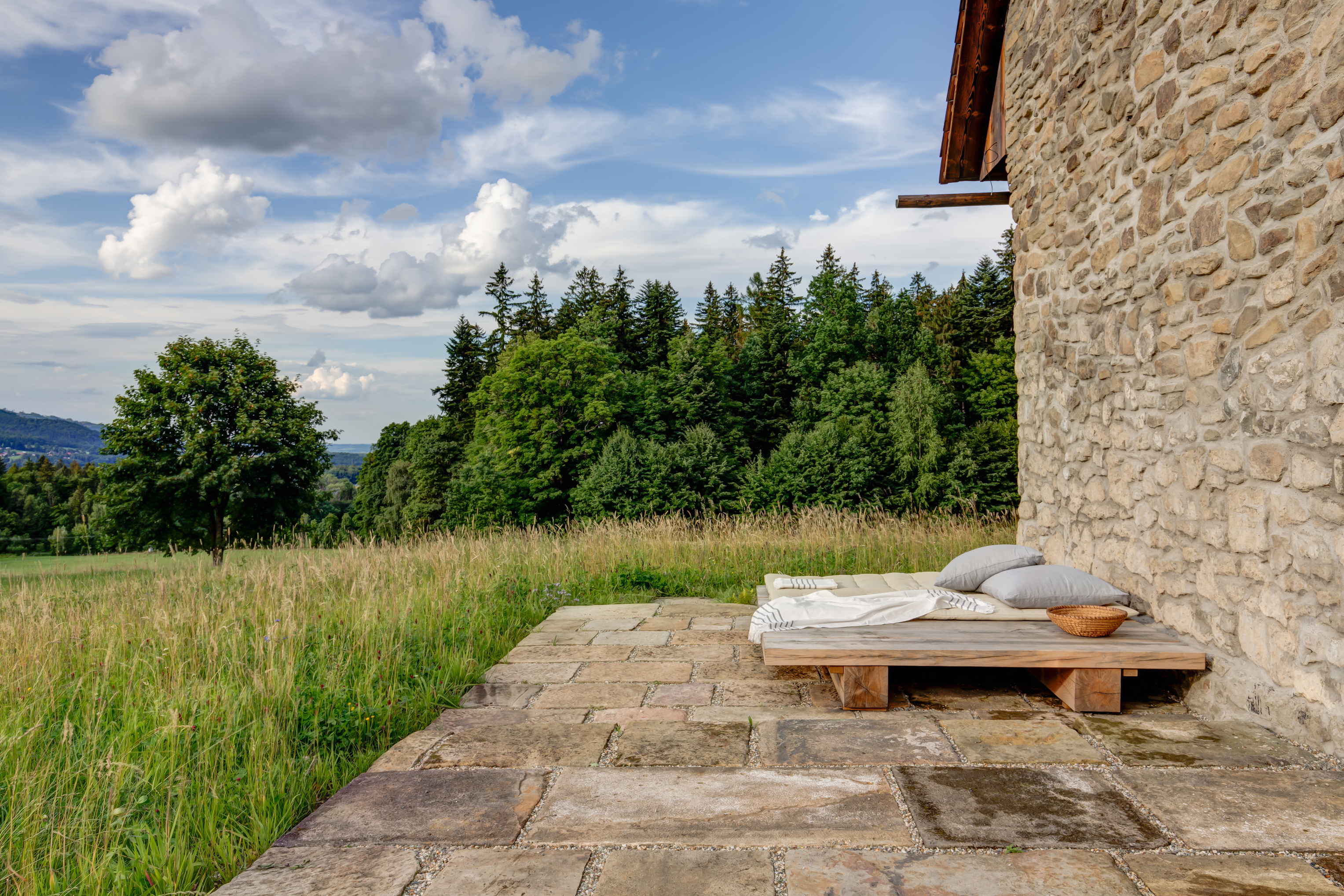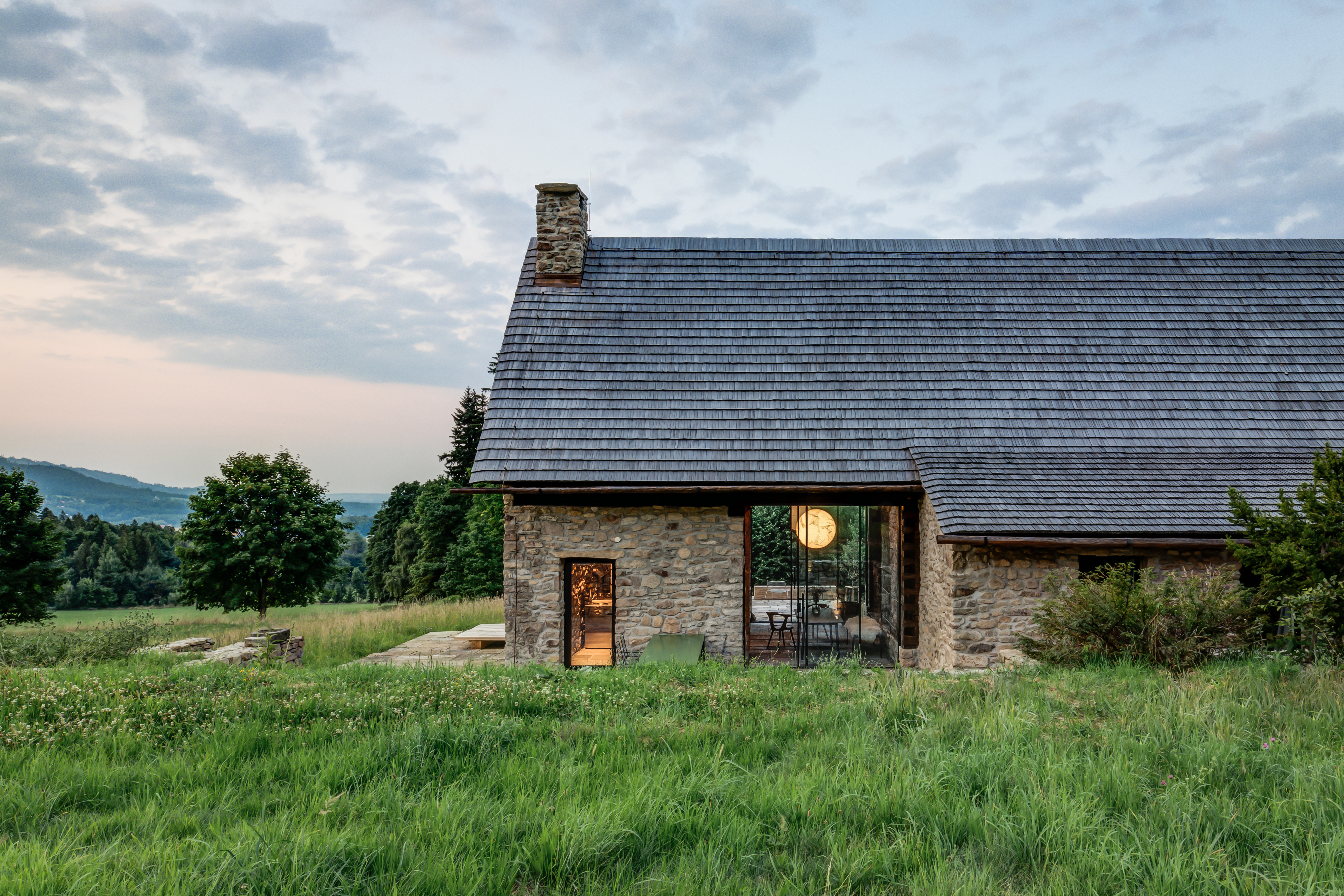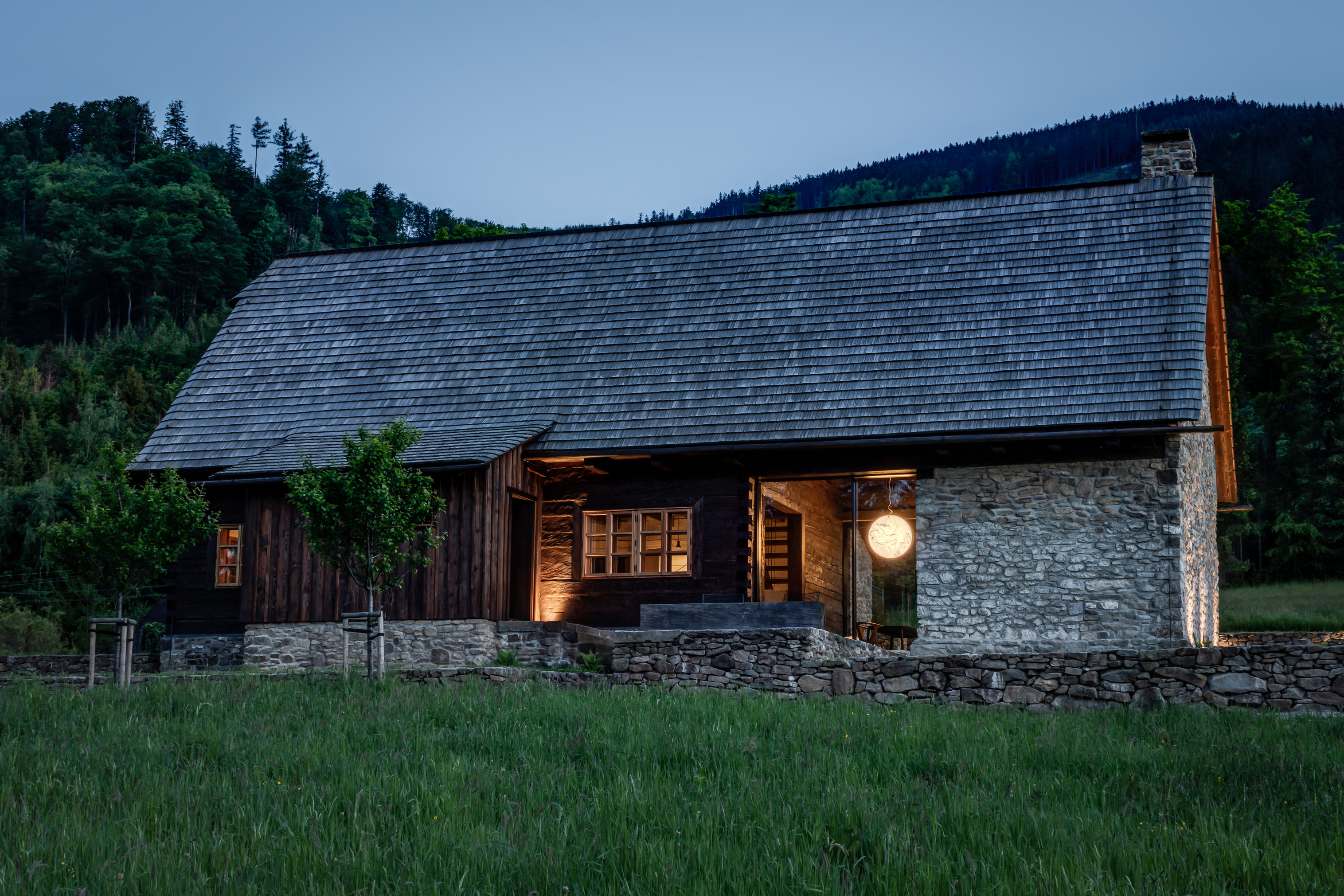 Na loukách s výhledem na vrcholy beskydských hor objevili manželé Hradilovi roubenku z roku 1880, která se stala dalším přírůstkem do rodiny jejich projektů. Budovu, která v minulosti prošla necitlivými úpravami, zbavili nepůvodních materiálů a přístaveb, aby ji mohli obnovit na původních kamenných základech. K rekonstrukci samotné bylo použito jedlové dřevo z beskydských lesů, trámy s dřevěnými spoji, izolace z ovčí vlny či kameny z bezprostředního okolí. Podlahu tvoří staleté žulové kameny, v ložnicích podobně staré dřevěné řeznické pulty. Nejzajímavější je tu ale jídelna, která vznikla v bývalém průjezdu – spojuje obytnou část s bývalým chlévem (kde se nyní nachází luxusní kuchyně) a díky velkým proskleným stěnám otevírá dům tiché kráse okolní přírody. Prochází až do podkroví, které slouží jako odpočinkový prostor a překlenuje ji dřevěnou lávkou.