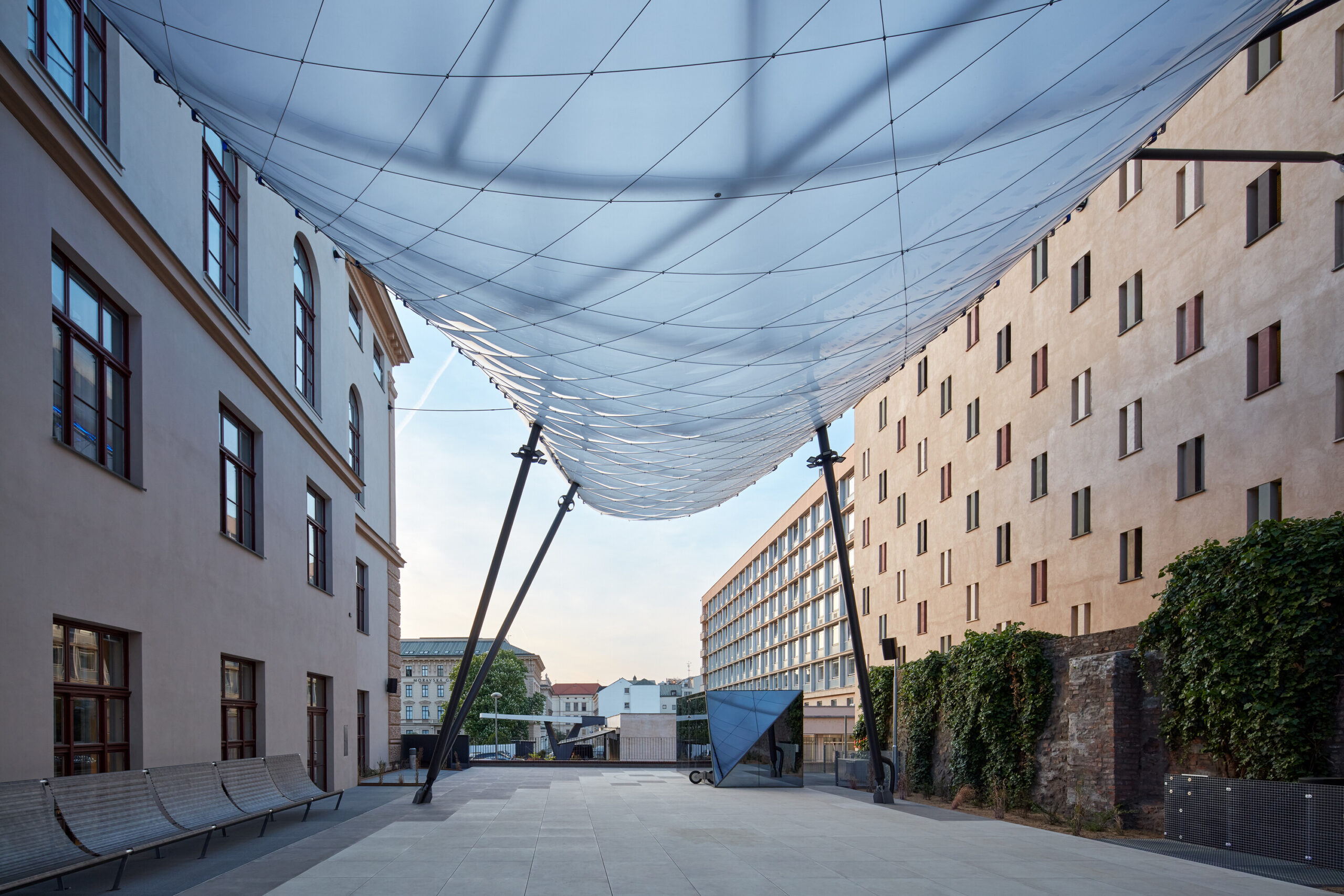 Mrak z dílny architekta Marka Štěpána reaguje na dění kolem – mění barvy, tlumeně svítí, občas zazní. Ve dne působí jako průsvitný baldachýn, v noci proměňuje dvůr galerie v tichou podívanou světel a odrazů.