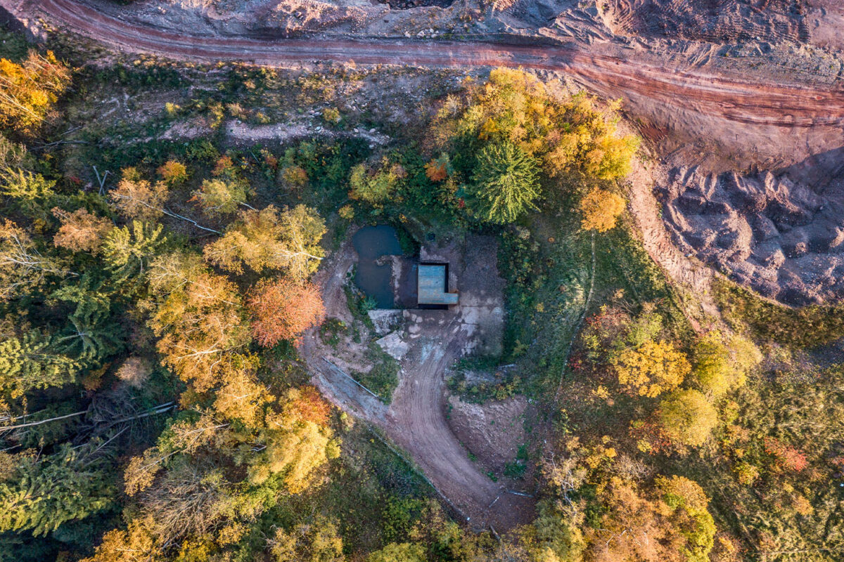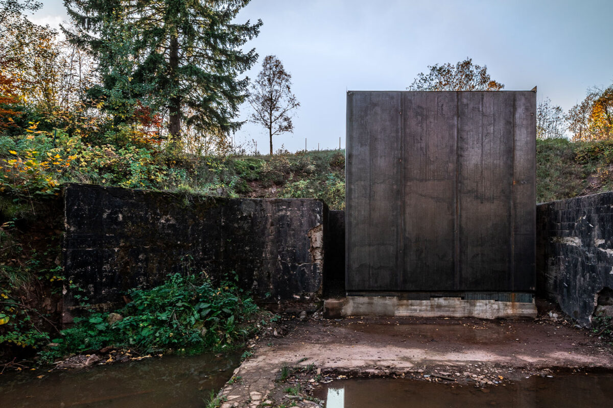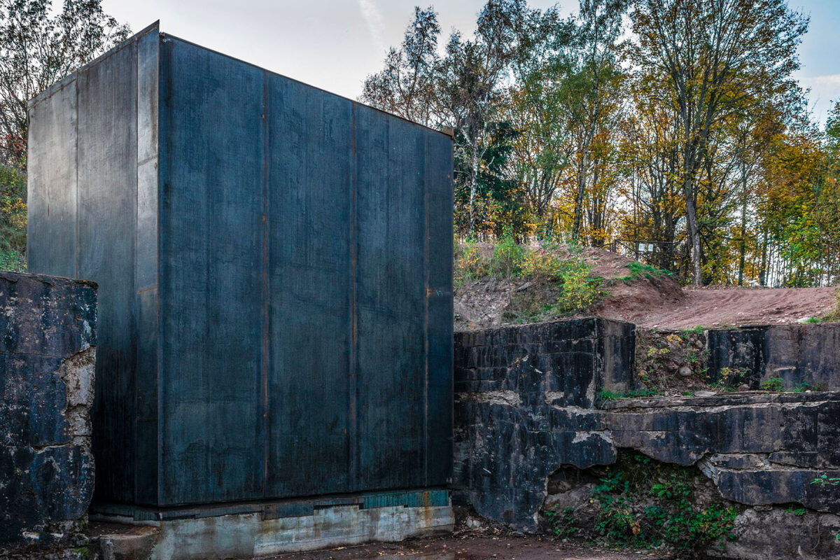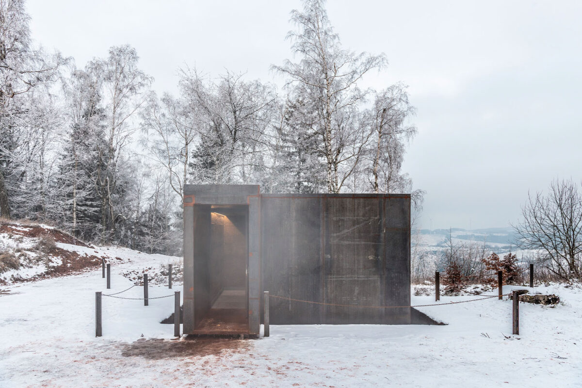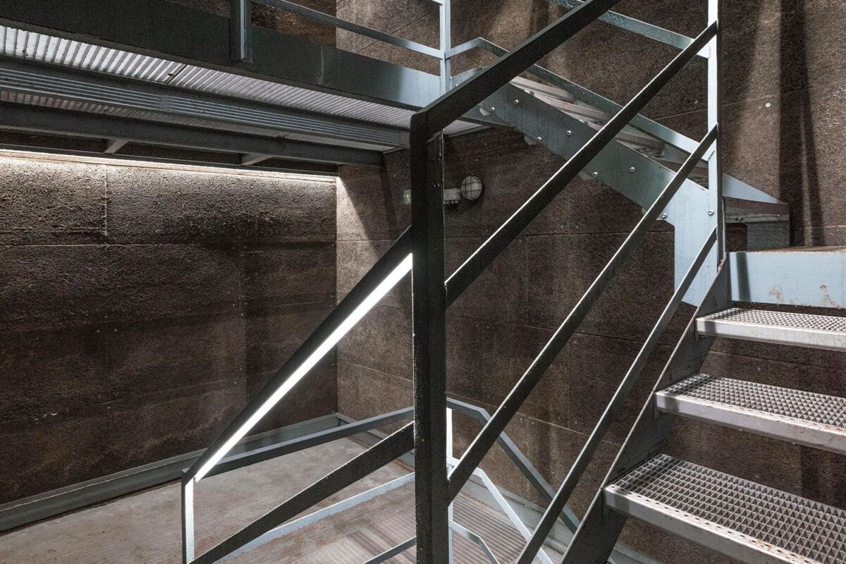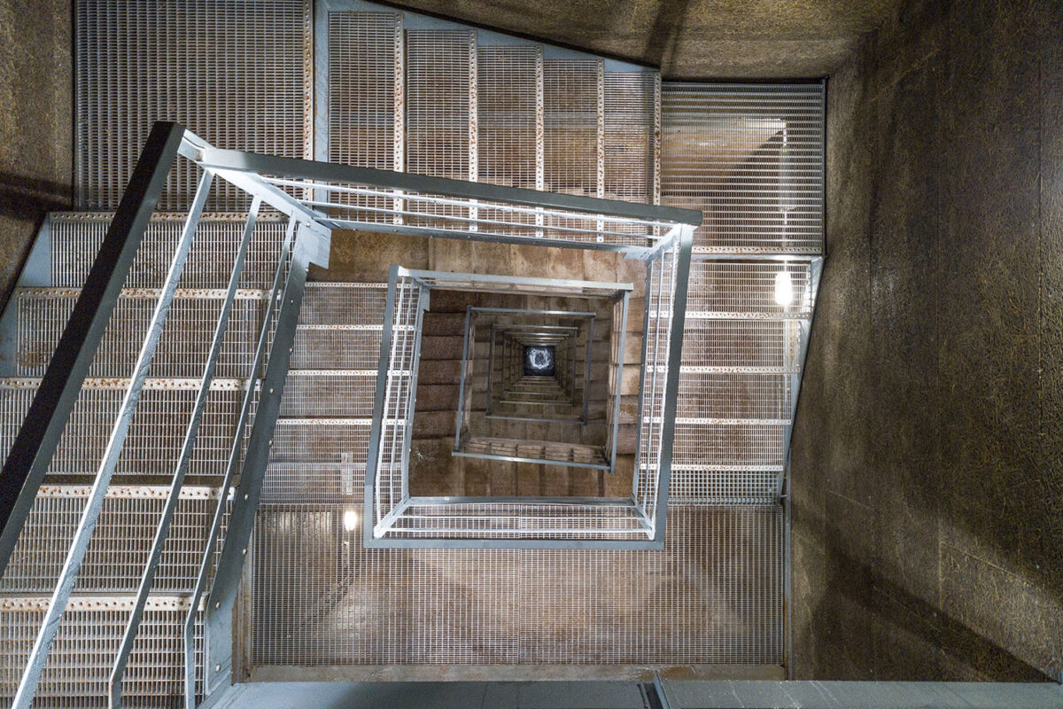 Nouzový východ umožňuje vystoupit z podzemí na terén v překvapivém místě, které mělo být ukryté hluboko v útrobách nerealizovaného pěchotního srubu. Citlivé osazení minimalizuje zásah do autentické základové desky samotného srubu. Tvar schodiště pokračuje v logice opakujících se ramen 40 metrů hluboké šachty. Nová část je ztvárněna kontrastními materiály podtrhujícími rozhraní mezi původním a přidaným.