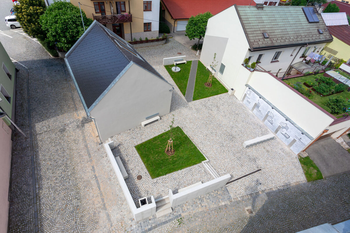 Díky návrhu studia New Work vznikl městský altán pro veřejnost s posezením a navazující kašnou. Původní uzavřenost dvora připomínají zídky z části domu blíže u kostela, která byla odstraněna. Místo je doplněno betonovými lavičkami, renovovanou vodní pumpou a dvěma zasazenými stromy – lípou a třešní. Zpevněné povrchy tvoří žulová dlažba, pochozí plocha v místě nové kašny je z kartáčovaného betonu.