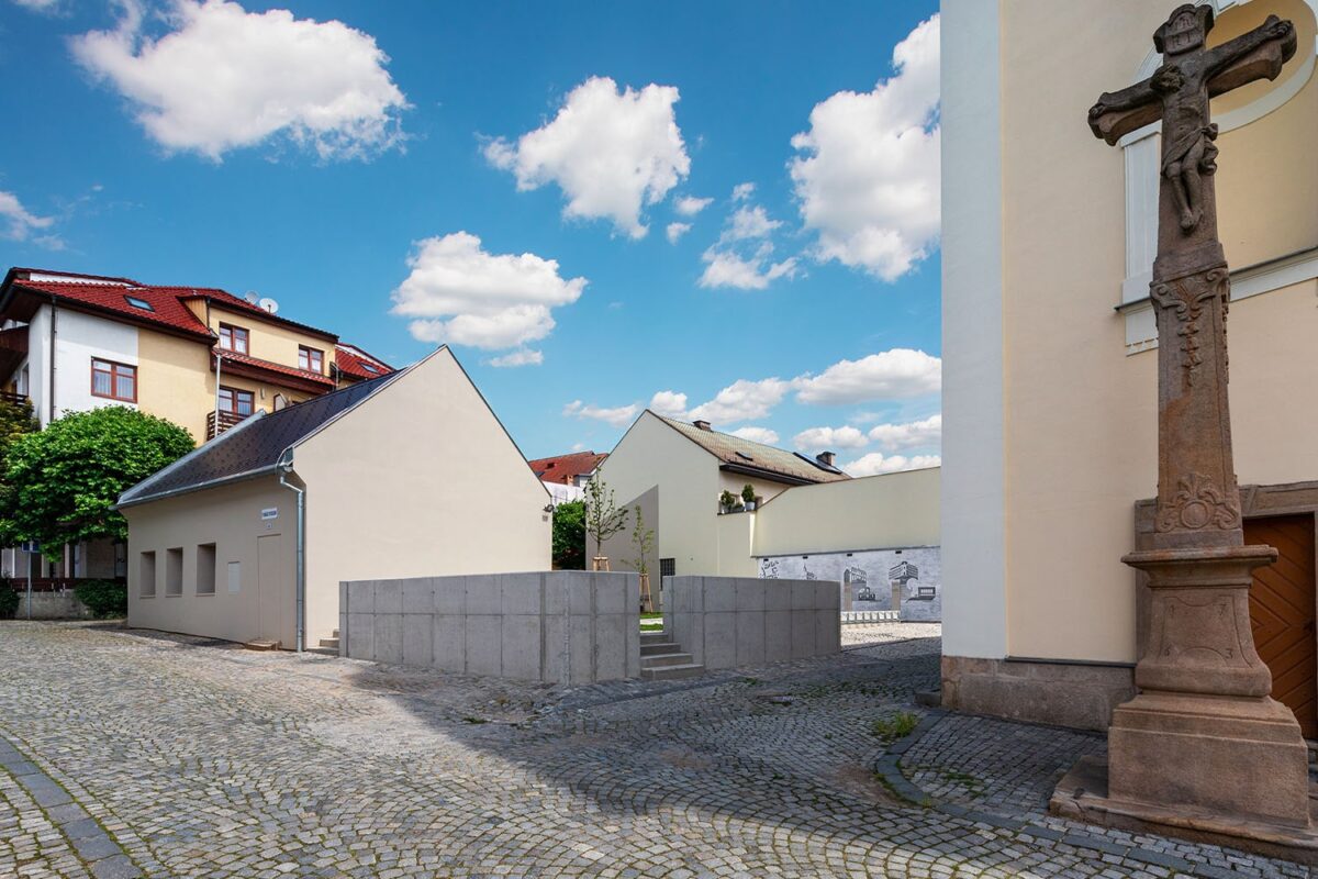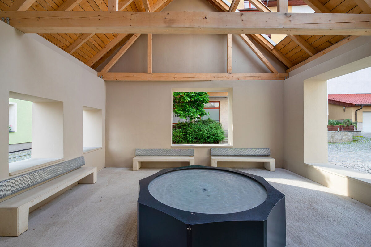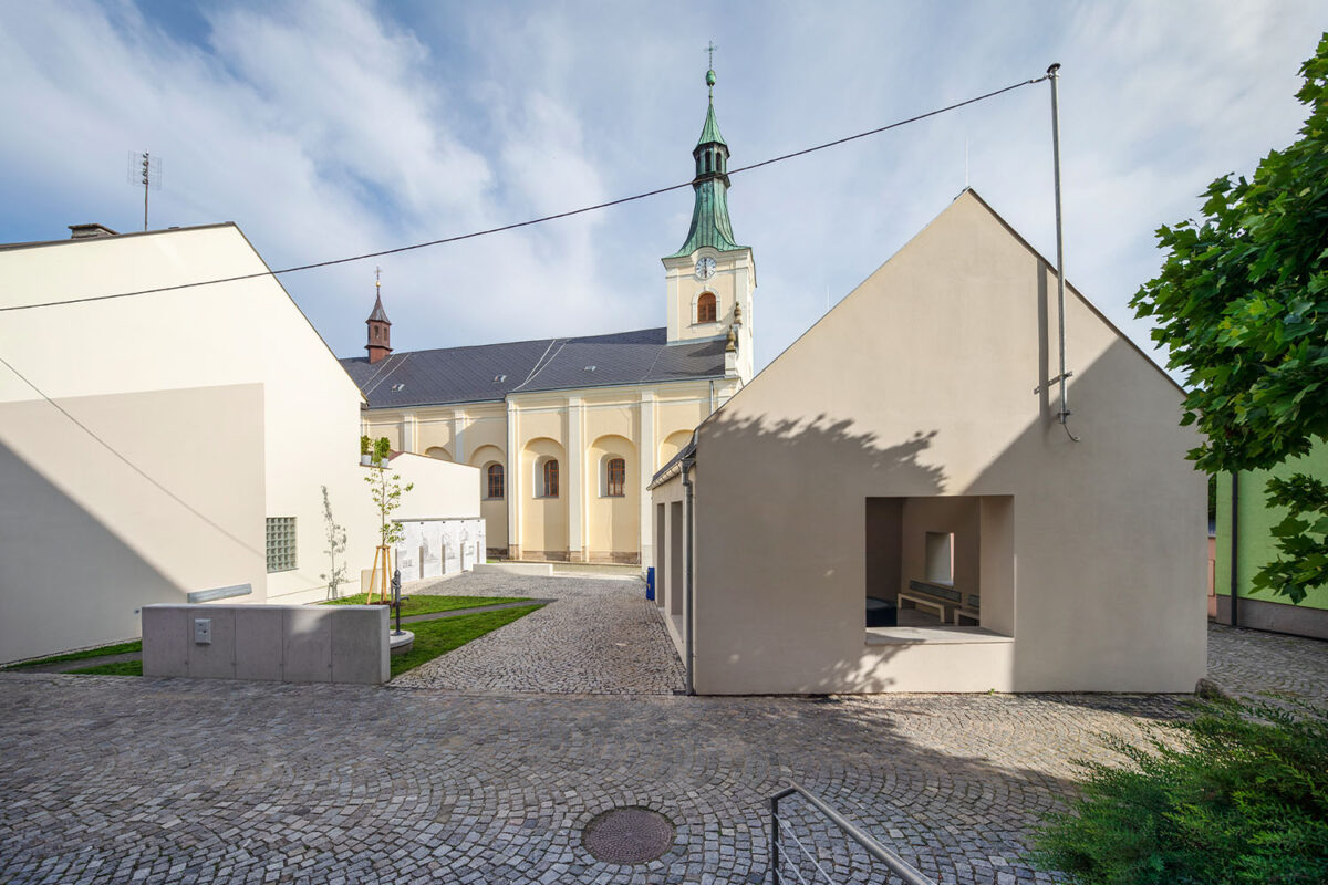 Díky návrhu studia New Work vznikl městský altán pro veřejnost s posezením a navazující kašnou. Původní uzavřenost dvora připomínají zídky z části domu blíže u kostela, která byla odstraněna. Místo je doplněno betonovými lavičkami, renovovanou vodní pumpou a dvěma zasazenými stromy – lípou a třešní. Zpevněné povrchy tvoří žulová dlažba, pochozí plocha v místě nové kašny je z kartáčovaného betonu.