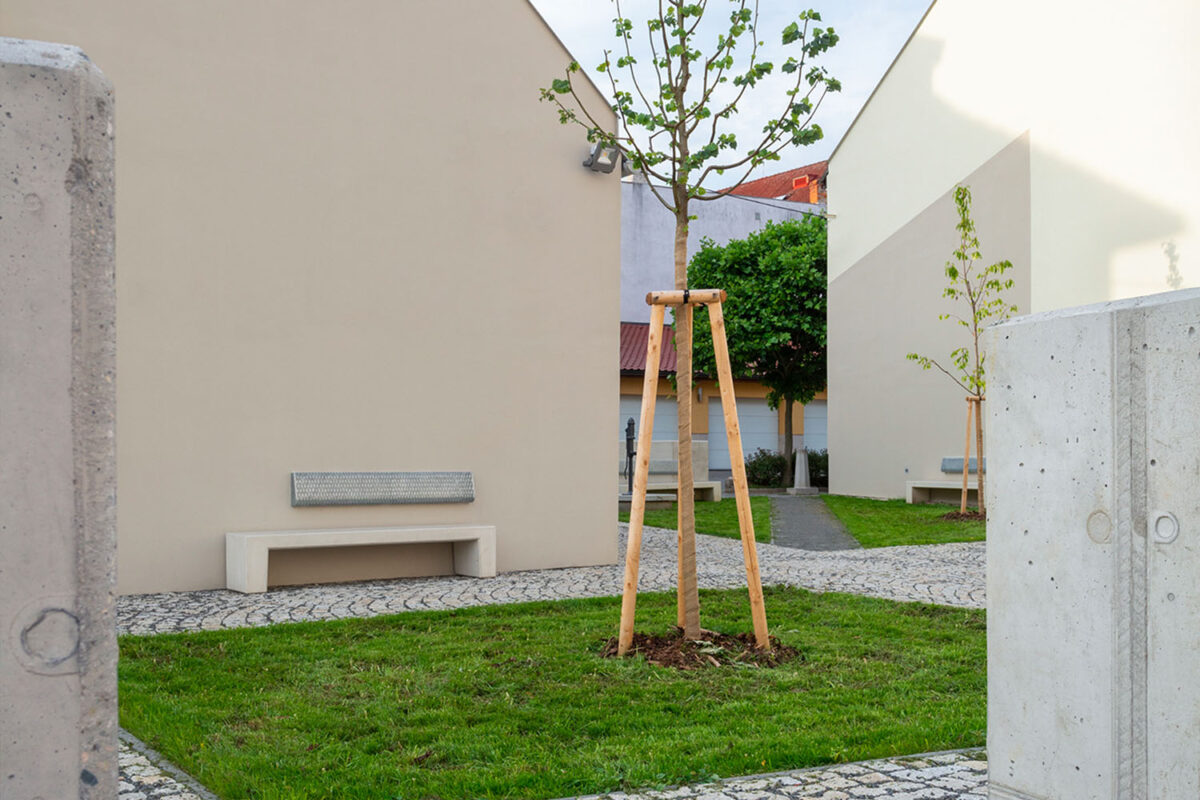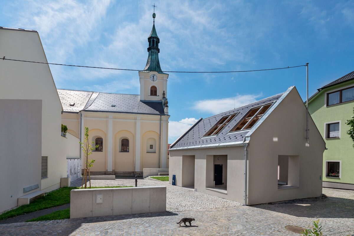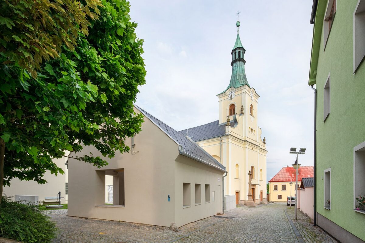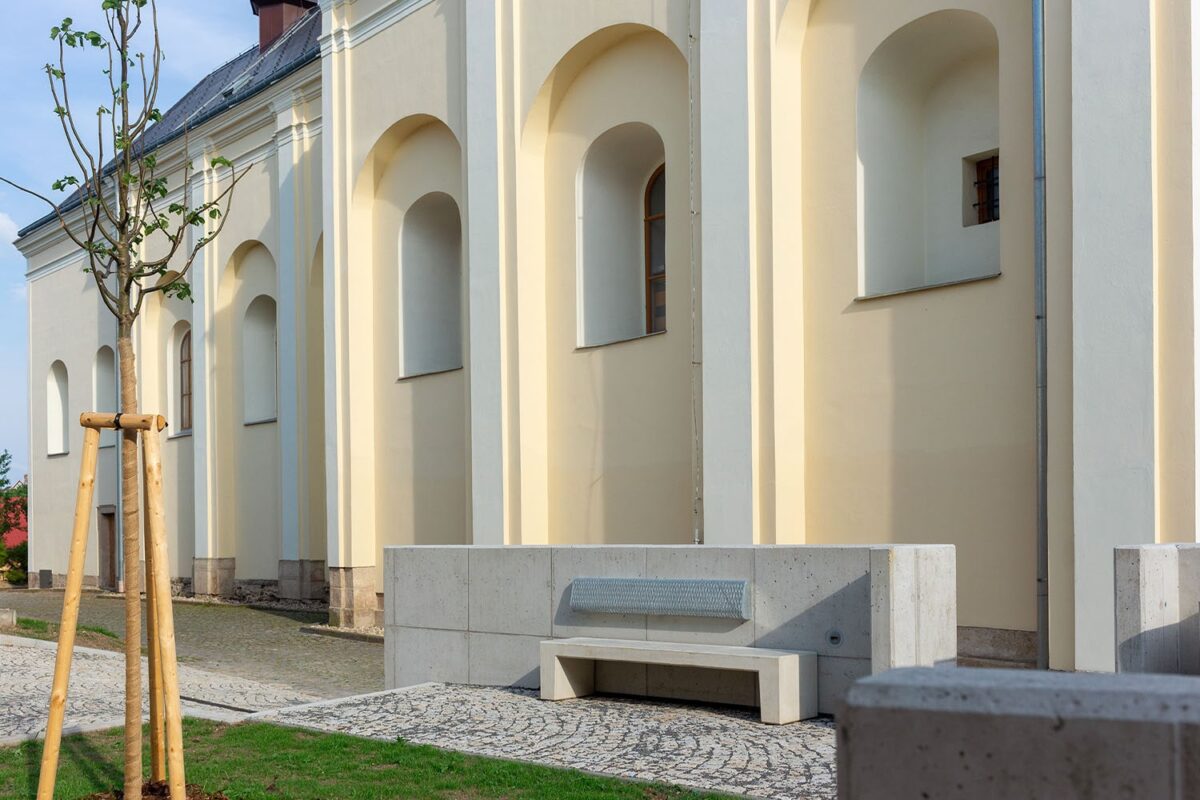 Díky návrhu studia New Work vznikl městský altán pro veřejnost s posezením a navazující kašnou. Původní uzavřenost dvora připomínají zídky z části domu blíže u kostela, která byla odstraněna. Místo je doplněno betonovými lavičkami, renovovanou vodní pumpou a dvěma zasazenými stromy – lípou a třešní. Zpevněné povrchy tvoří žulová dlažba, pochozí plocha v místě nové kašny je z kartáčovaného betonu.