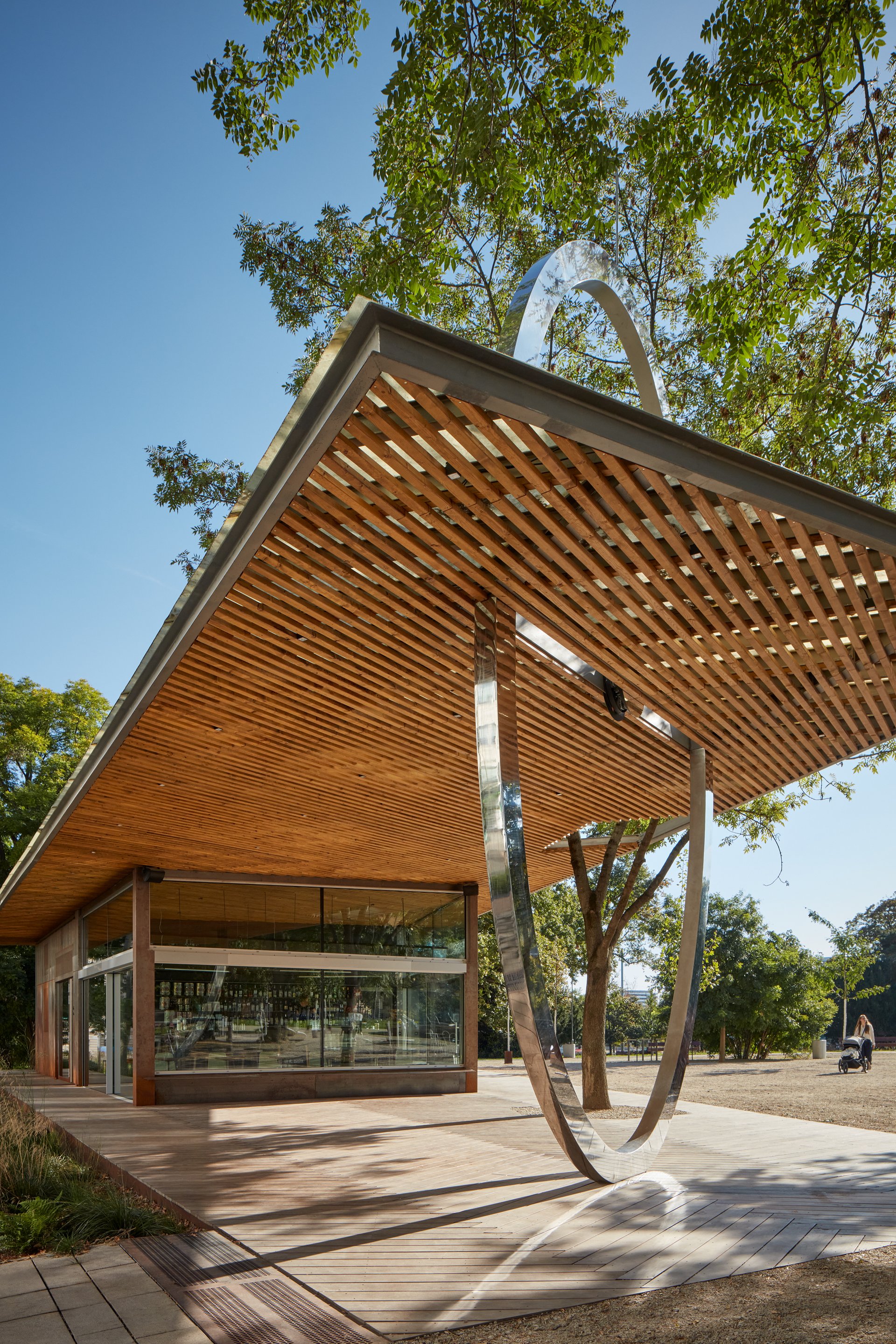 Na severní straně parku vznikla kavárna s terasou a dětským hřištěm, která se stala novým společenským centrem a prostorem pro menší kulturní akce. Její fasáda z kortenu s neonovým nápisem Budoucnost připomíná propojení umění, architektury a města.