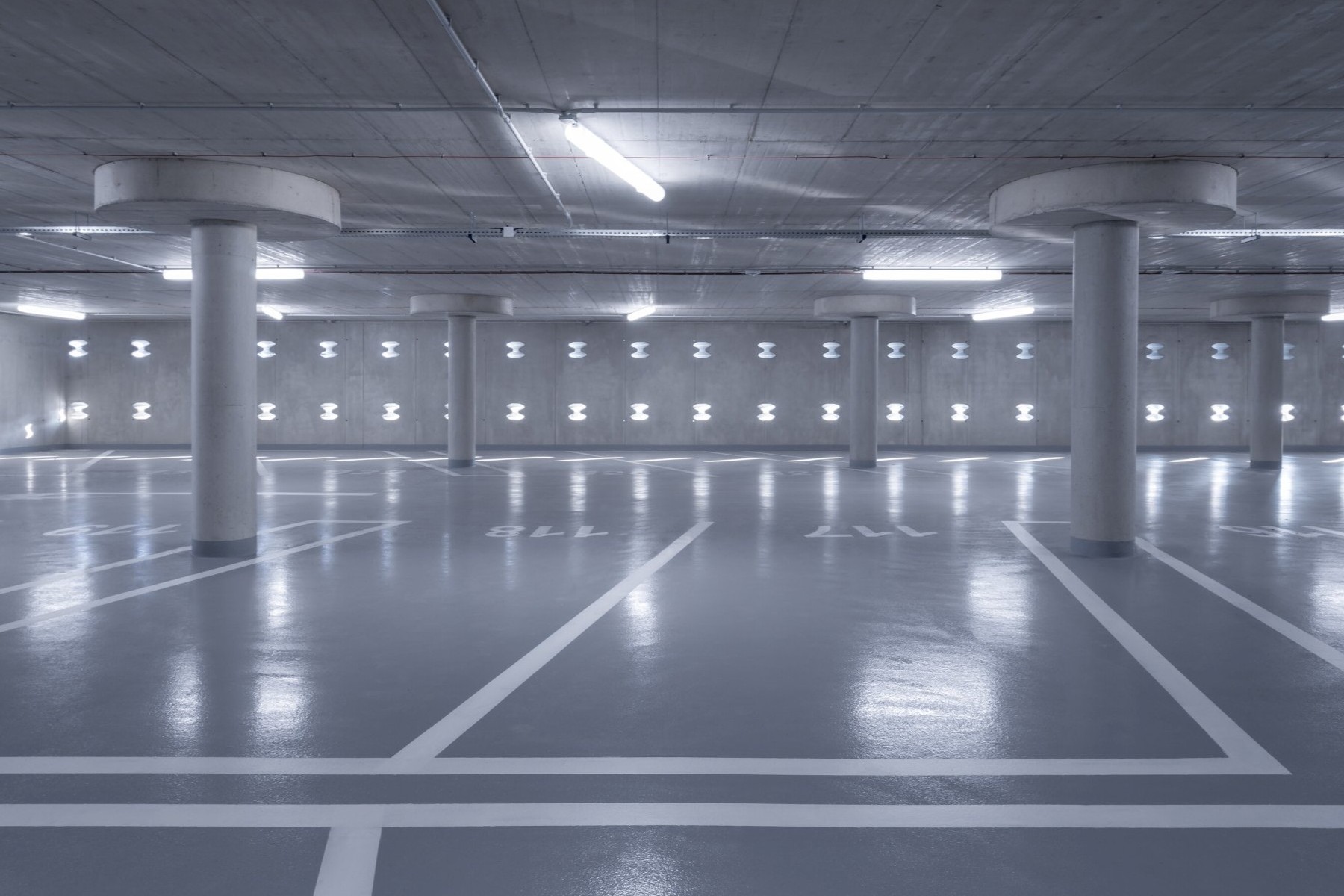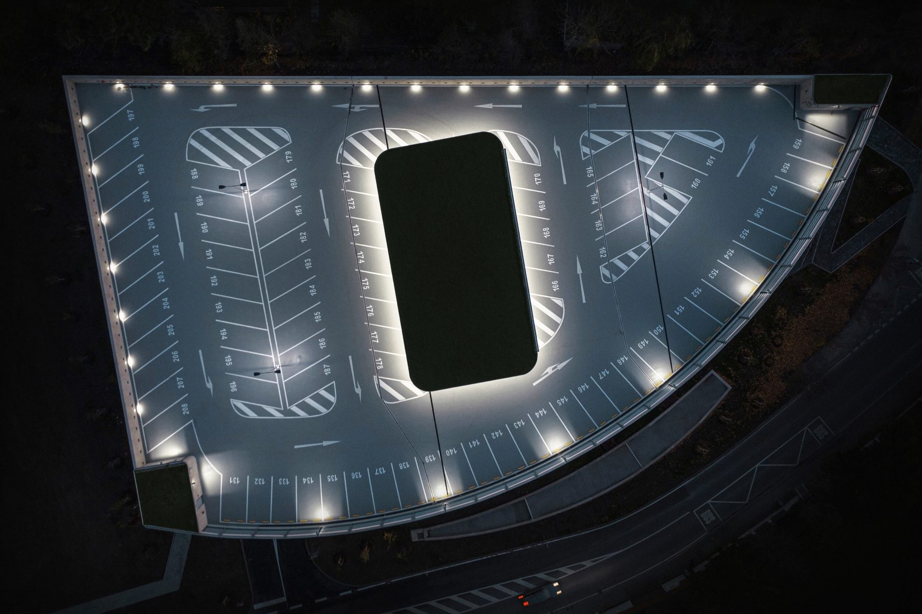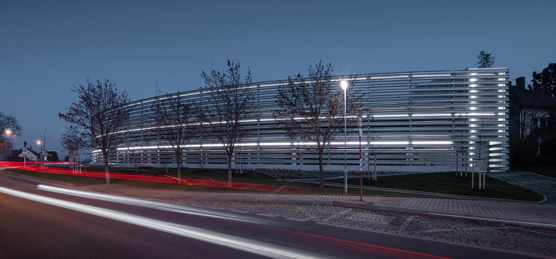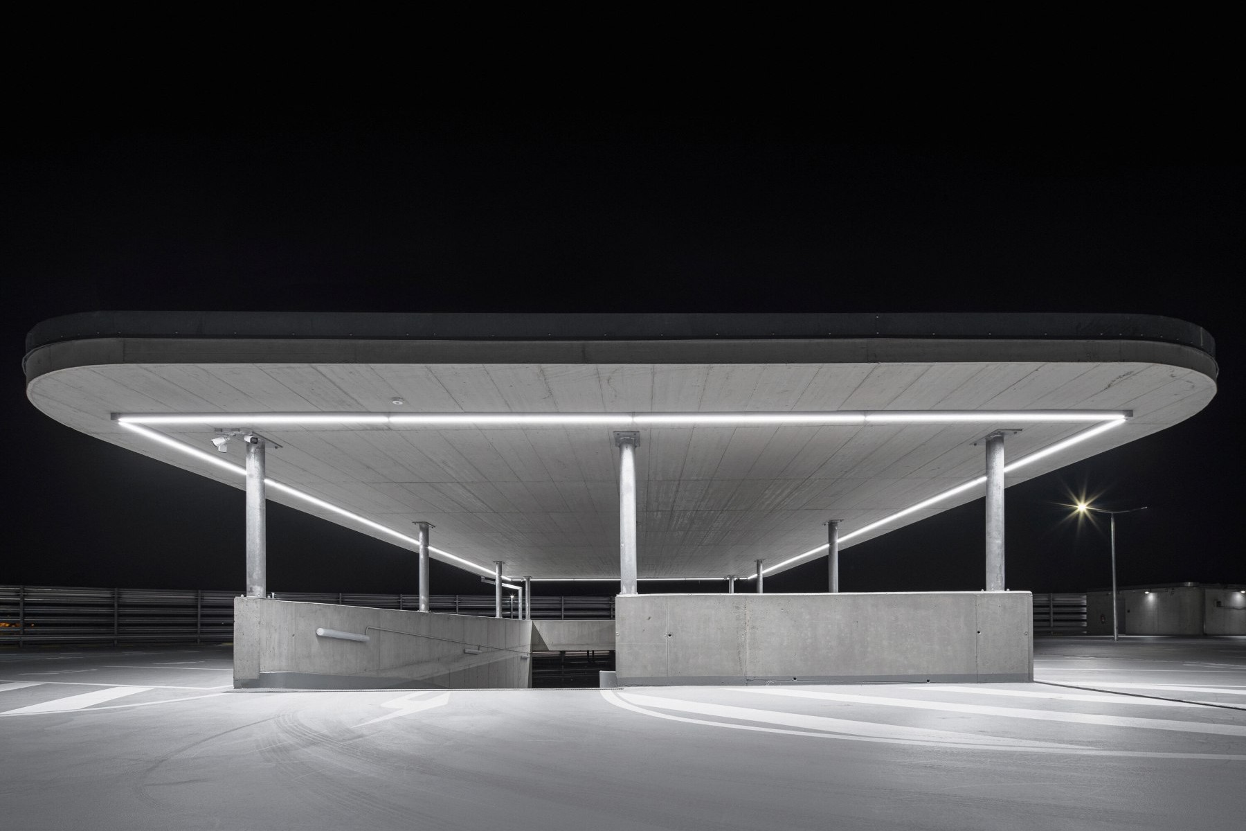 LED osvětlení umístěné na svodidlech severní fasády odkazuje na dlouhou expozici průjezdu aut. Jezírko před parkovacím domem sbírá dešťové vody a pomáhá tak retenci k užitkovému nakládání s vodou. Tři stříšky v nejvyšší úrovni objektu jsou pokryté vegetací. Celý objekt se v budoucnu utopí v zeleni.