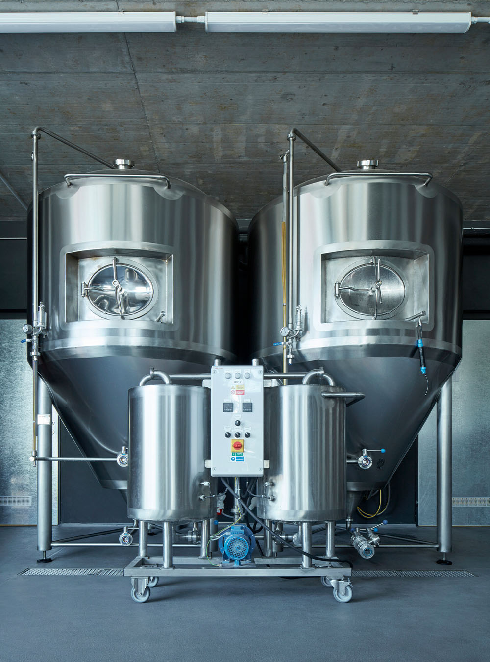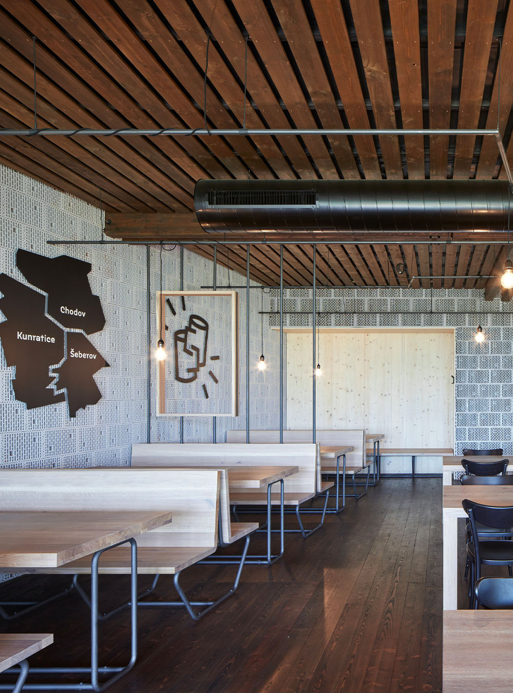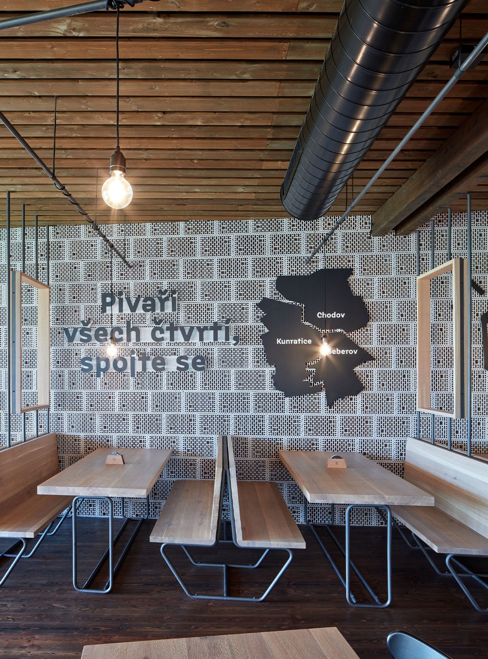 Fasáda tvoří 3D rastr ze smrkových latí, mořených černou barvou. Okna jsou ze smrkového dřeva. Pevná kostra je otevřena pouze v důležitých místech – ve varně pivovaru a v restauraci. Na interiér je použita kombinace několika materiálů: smrková prkna na podlaze, stropě a jedné ze stěn, šedé cihly otočené dutinkami do interiéru a na nejviditelnějších místech byla použita betonová stěrka.