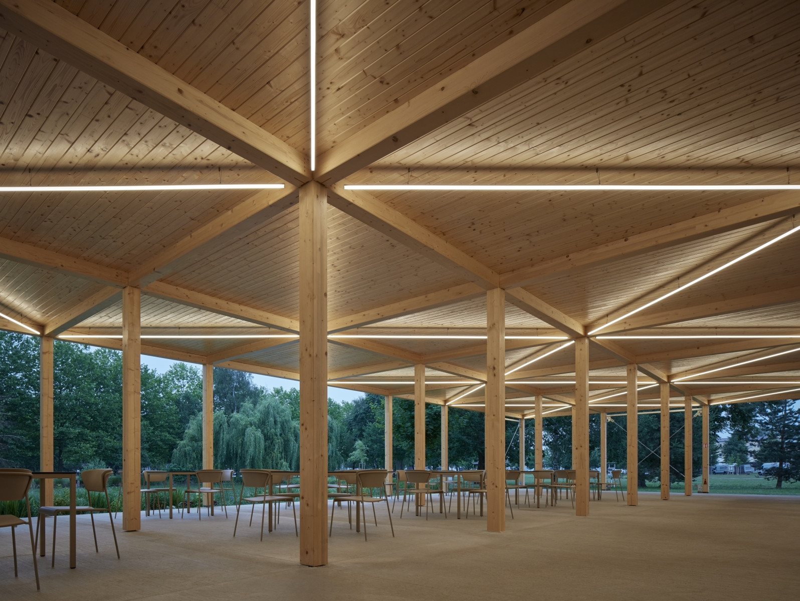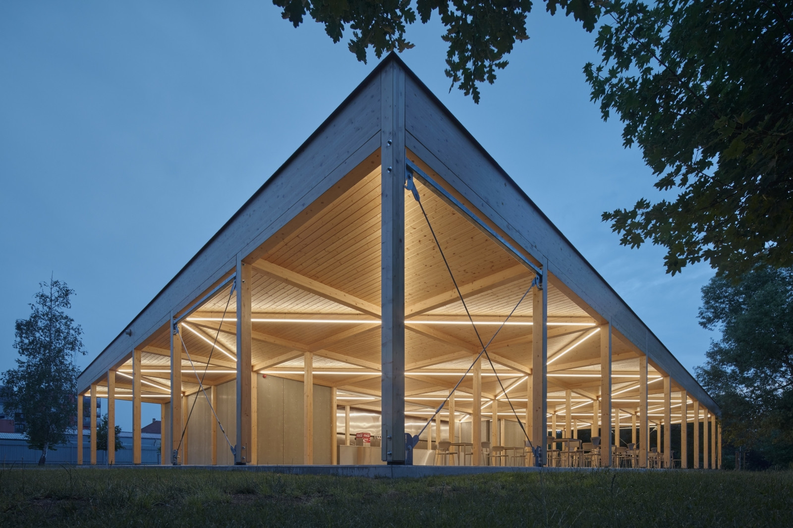 Původní restaurace zde stála již v roce 1970. Byla však v nevyhovujícím stavu, došlo k jejímu zbourání a na stejném místě byla vystavěna nová modulárně složená dřevěná budova s krytou verandou. Nachází se v areálu výstaviště v Českých Budějovicích, který postupně prochází proměnou. Díky svému umístění vedle jednoho z rybníků nabízí restaurace návštěvníkům nevšední zážitky. Využití jemných sloupků ze dřeva dodává stavbě lehkost, vzdušnost a v maximální míře propojuje provozní část s okolím. Krytá terasa umožňuje proměnlivé uspořádání míst k sezení a působí, jako byste se nacházeli na vodní hladině přilehlého rybníka.