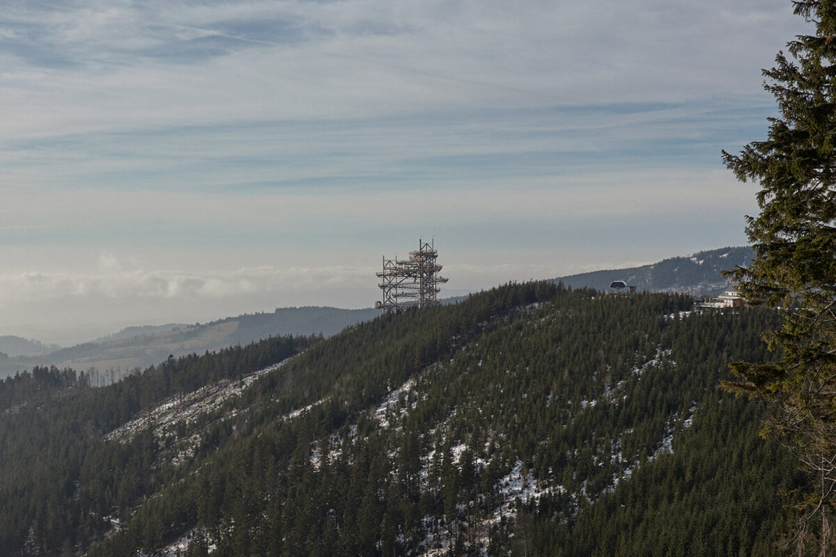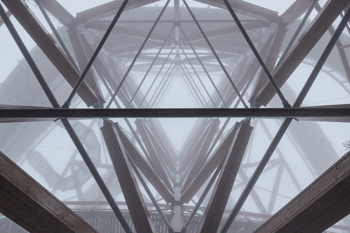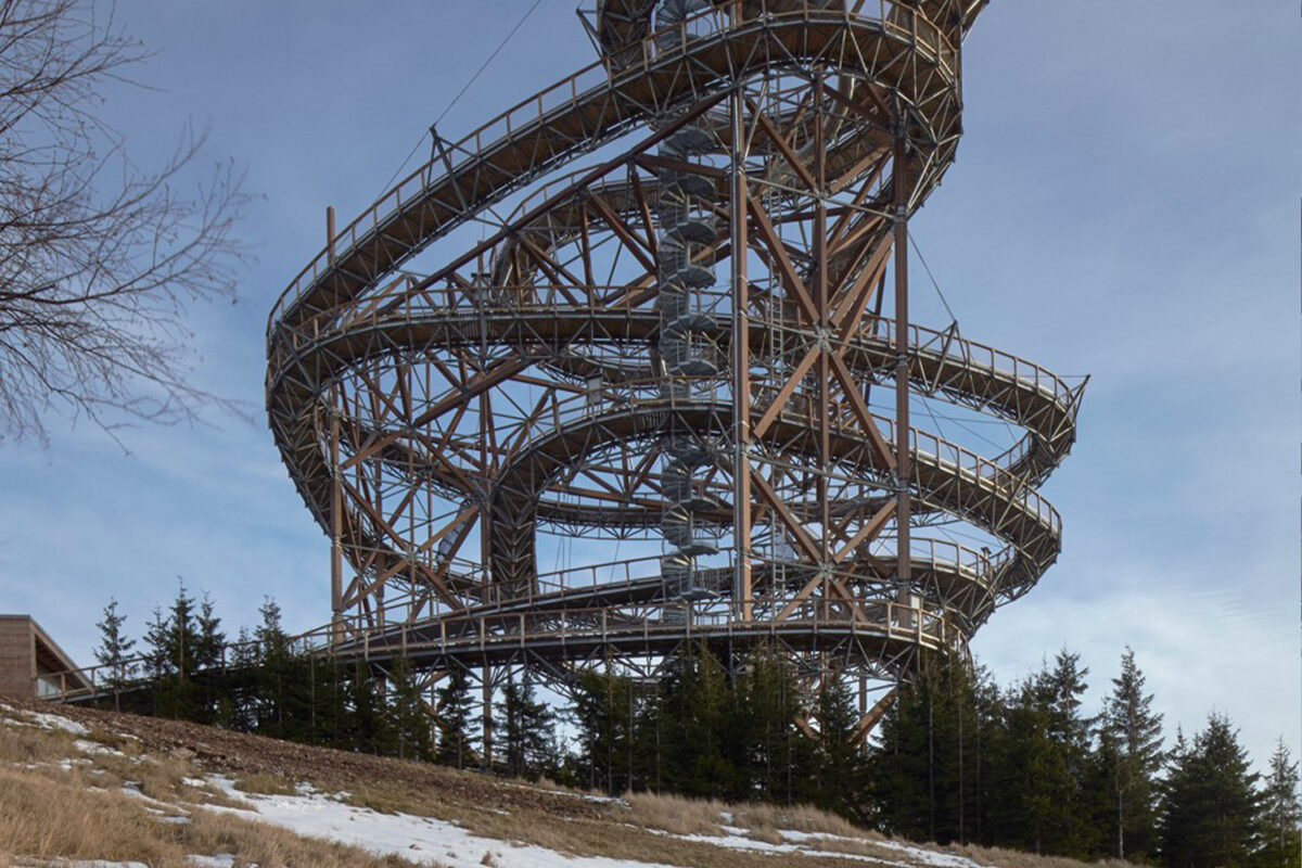 Sky walk se nachází v blízkosti chaty Slaměnka u horní stanice sedačkové lanovky na Kralický Sněžník v nadmořské výšce 1116 metrů. Stezka v oblacích je vysoká 58 metrů a díky dřevěné stezce se na ni snadno dostanou i lidé s omezenými možnostmi pohybu. Odvážnější si návštěvníci mohou delší cestu dolů zkrátit 101 m dlouhou nerezovou skluzavku s okénky. Návrh projektu Stezka v oblacích pochází od architekta Zdeňka Fránka, který o svém díle řekl: „Výjimečnost stavby je v rozsahu použití dřeva na stavbě těchto rozměrů. Také v tom, že vytvoří nový druh zážitku, kde si člověk lépe uvědomí svou skutečnou maličkost v lůně přírody…“