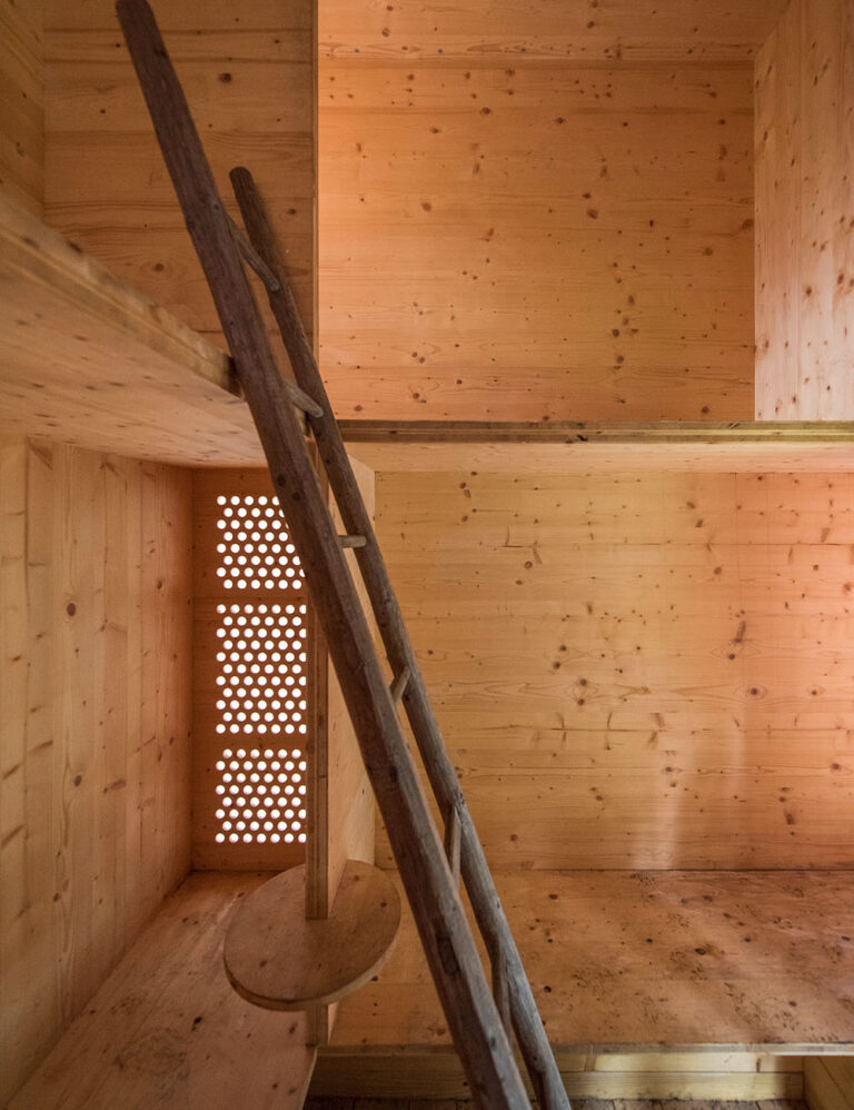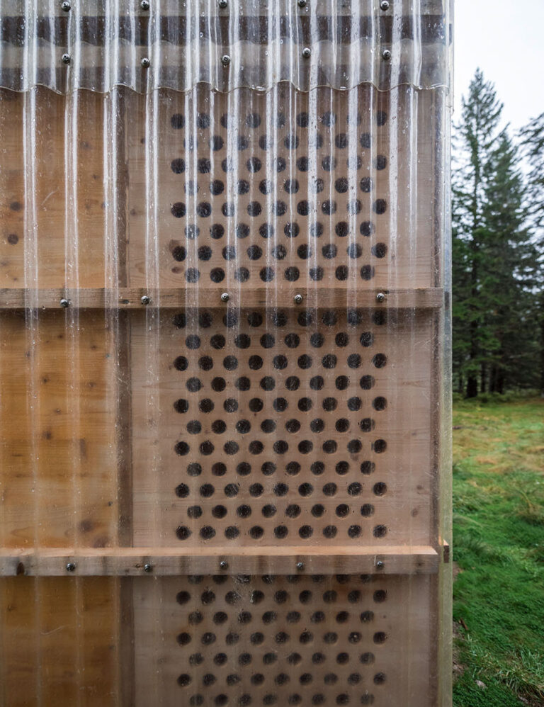 Konstrukce je sestavena ze sedmi shodných modulů, které zároveň formují interiér. Rozměry boxu jsou voleny tak, aby se v něm dalo pohodlně sedět i ležet. Fasáda je navržena z jemně vlnitého průsvitného sklolaminátu. Celá dřevěná konstrukce je tak chráněna před nepřízní počasí a současně je možné přes průhlednou „pláštěnku“ vnímat krásu přírodního materiálu stavby.