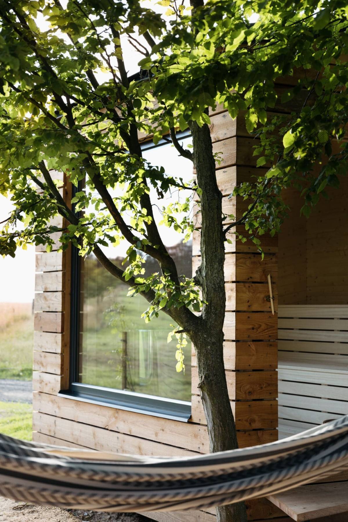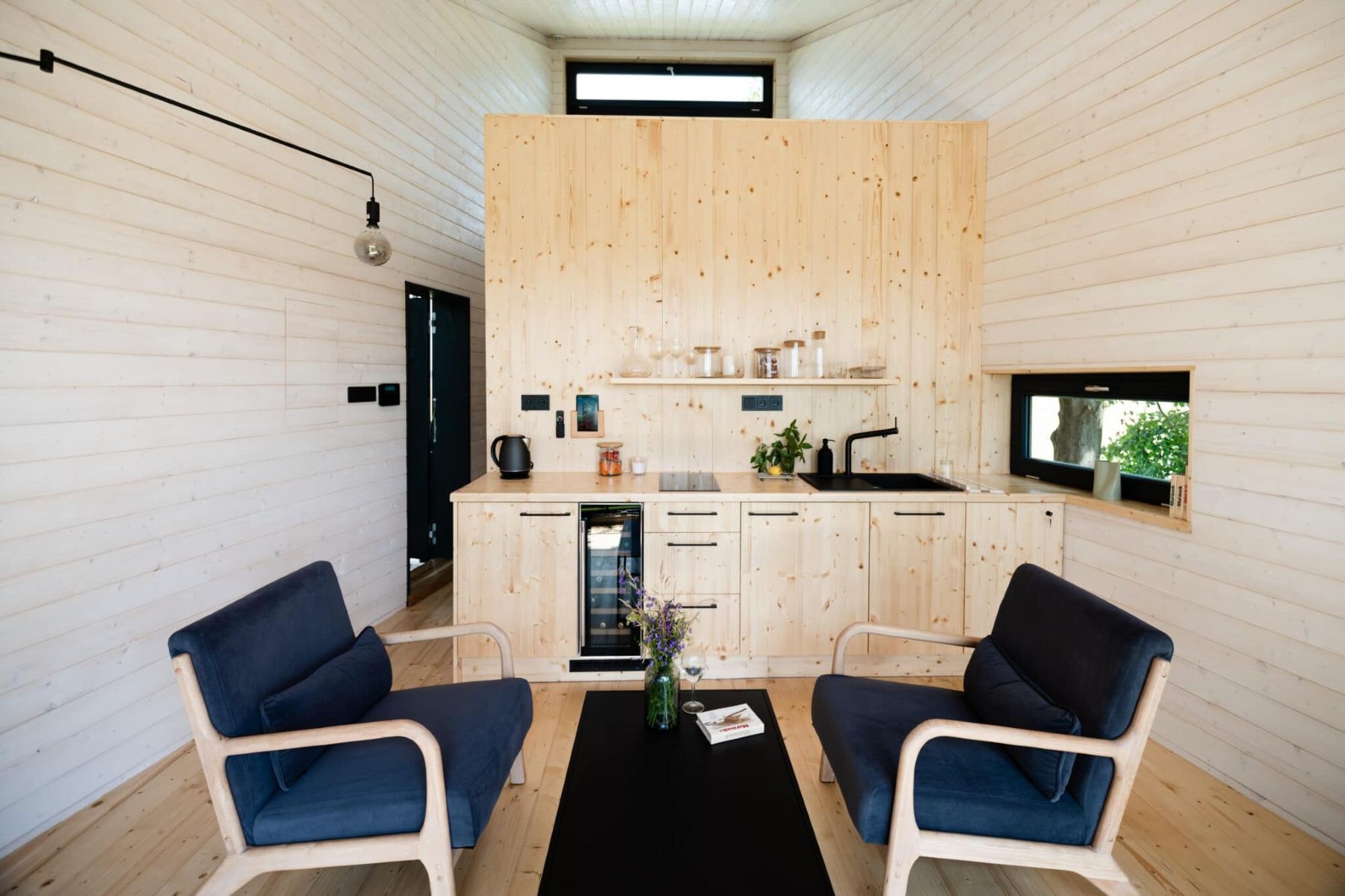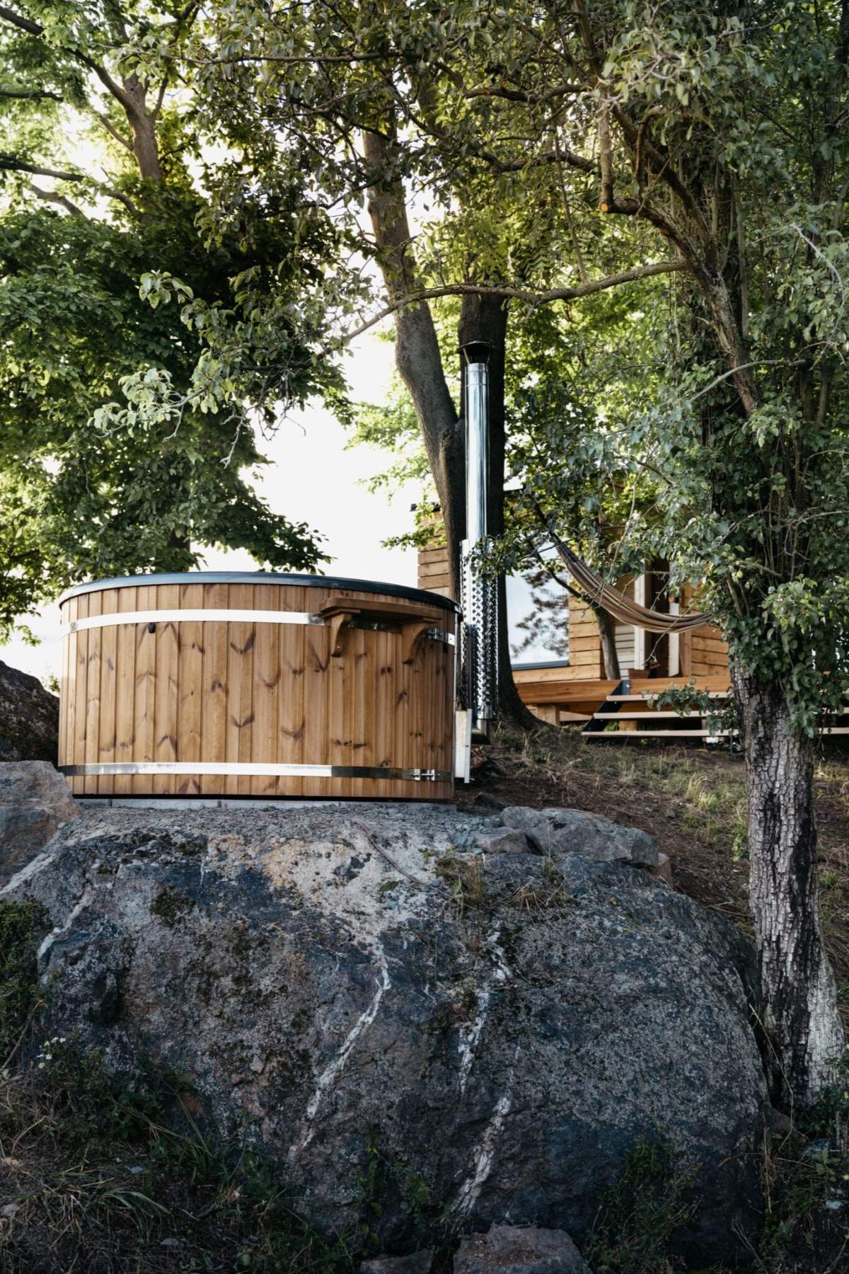Exteriér útulny je pobit prkny použitými už na jiném objektu, aby na nich byla přirozená patina. V interiéru jsou prkna použita též, byla však vybrána nová. Útulna nabízí minibar s výběrovými víny, kamna pro navození romantické atmosféry, která mají i praktickou stránku – ohřívají vodu pro koupání, takže pohodlí je zaručeno po celý rok. Venku relax zajišťuje hot tub.