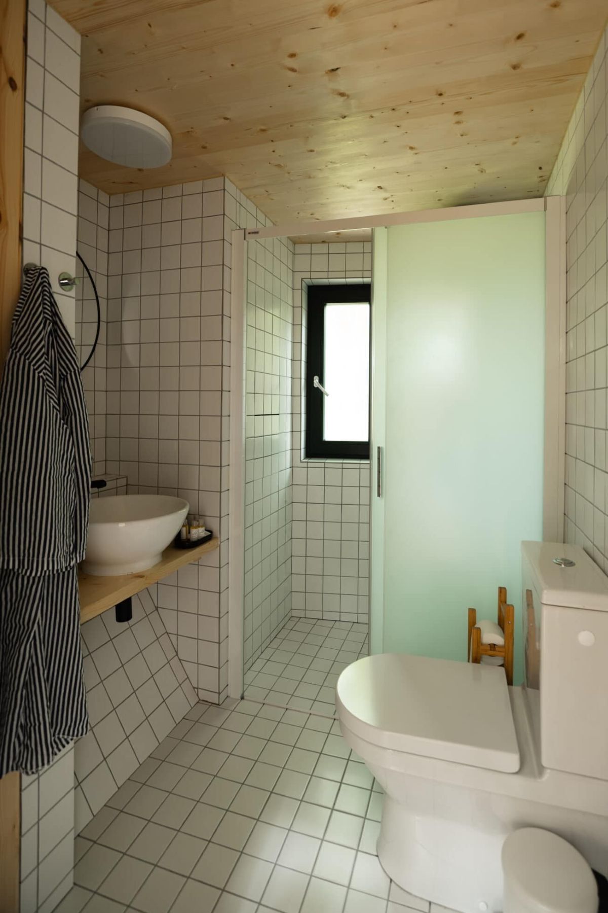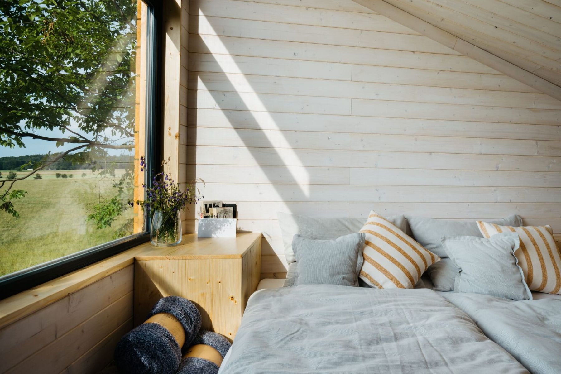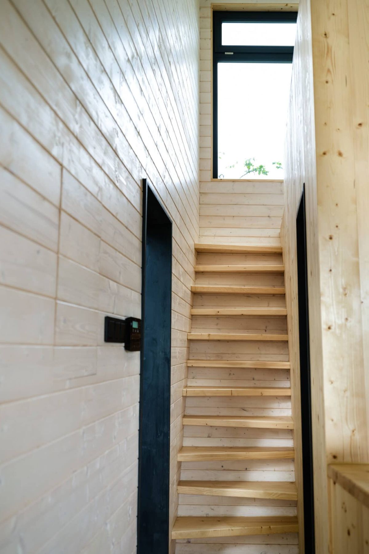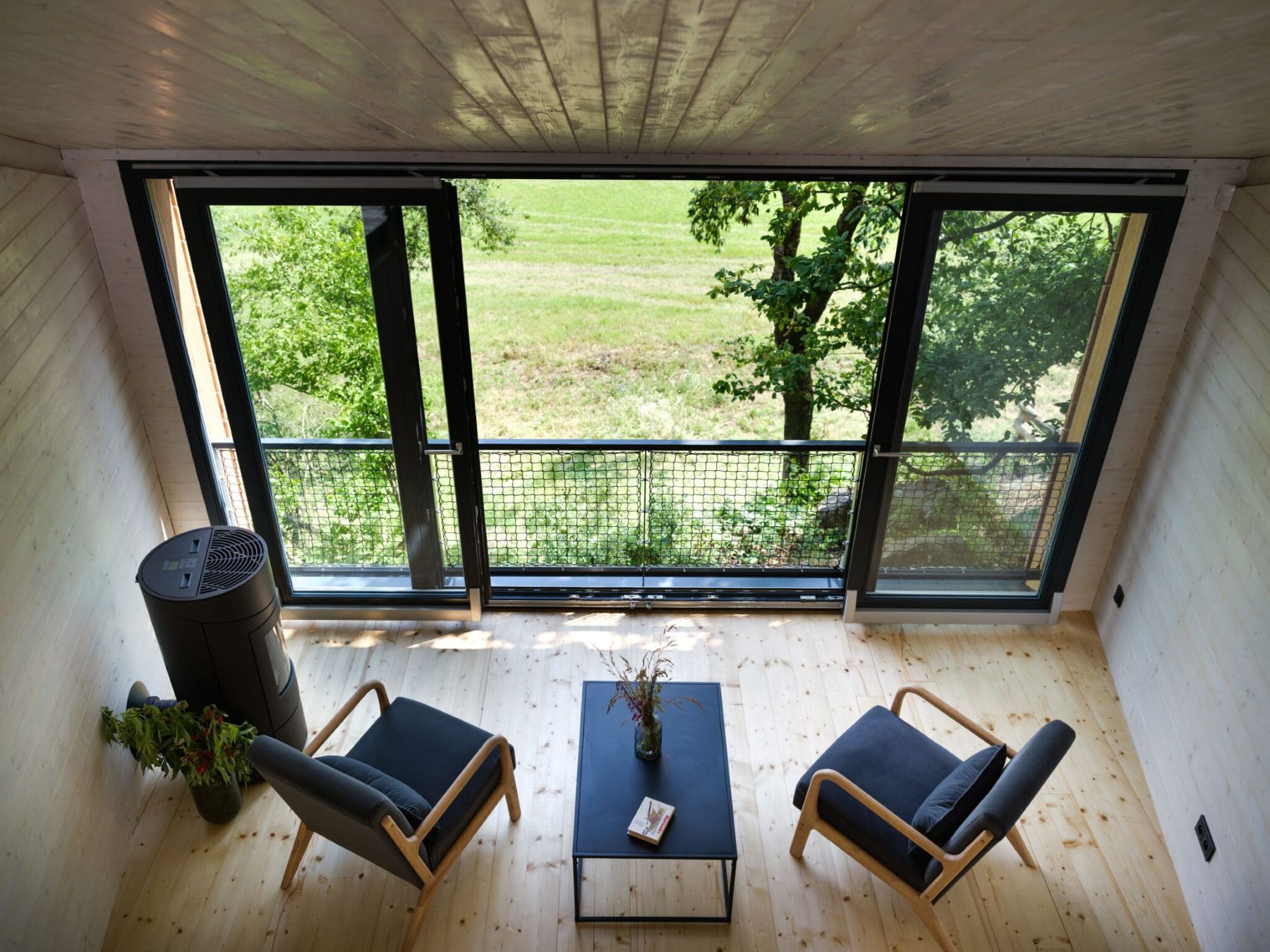 Exteriér útulny je pobit prkny použitými už na jiném objektu, aby na nich byla přirozená patina. V interiéru jsou prkna použita též, byla však vybrána nová. Útulna nabízí minibar s výběrovými víny, kamna pro navození romantické atmosféry, která mají i praktickou stránku – ohřívají vodu pro koupání, takže pohodlí je zaručeno po celý rok. Venku relax zajišťuje hot tub.