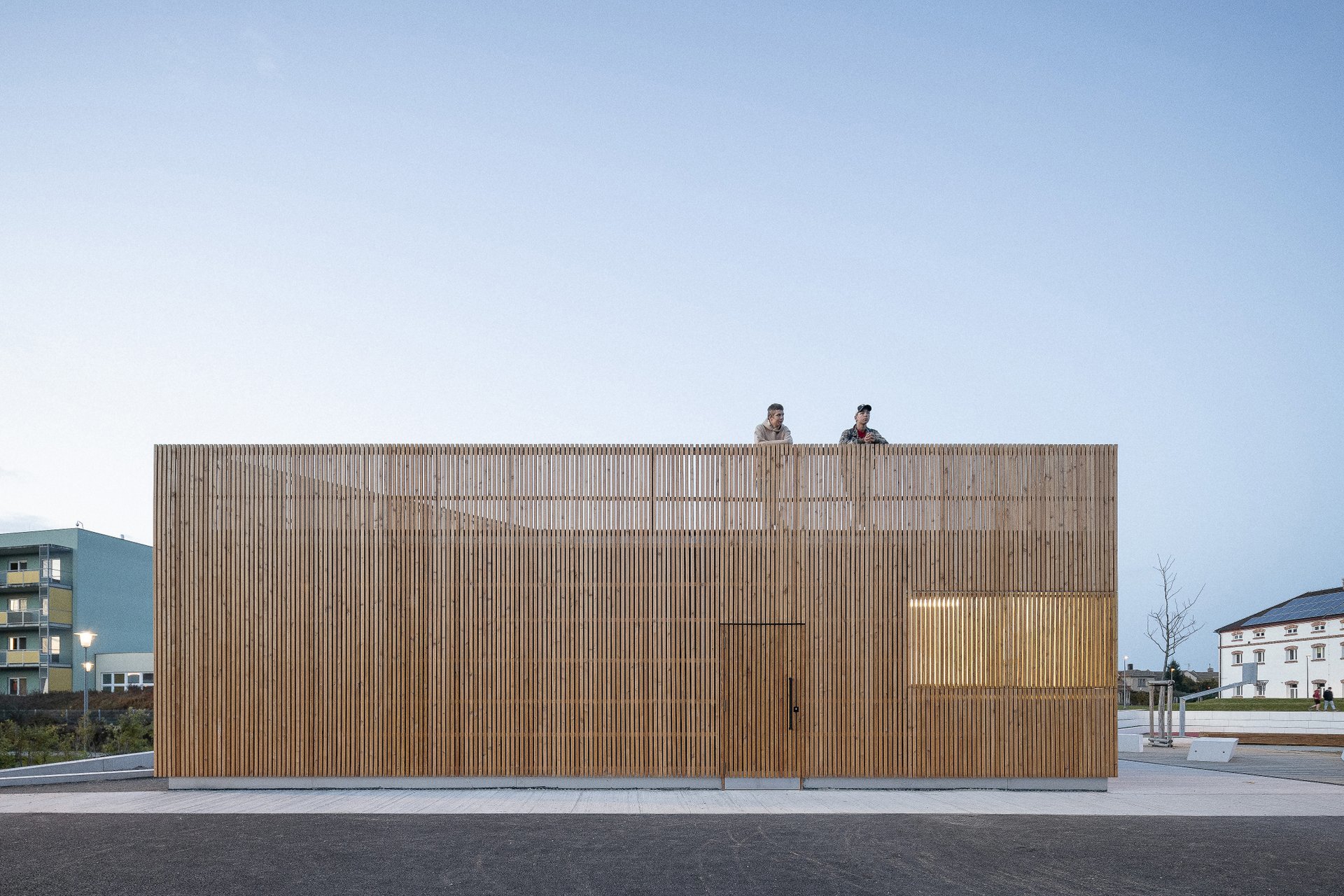 Hřiště lemují bílé tribuny, využívané jako pohodlné posezení, okolí doplňují zatravněné terasy a aleje stromů. Dominantou celého prostoru je dřevěný kiosek umístěný u hlavní pěší trasy. Jedna jeho strana je tvořena schodištěm, které slouží jako vyhlídka na celý areál.