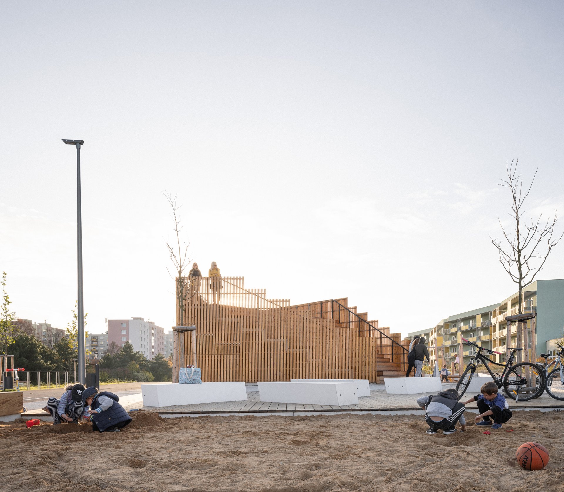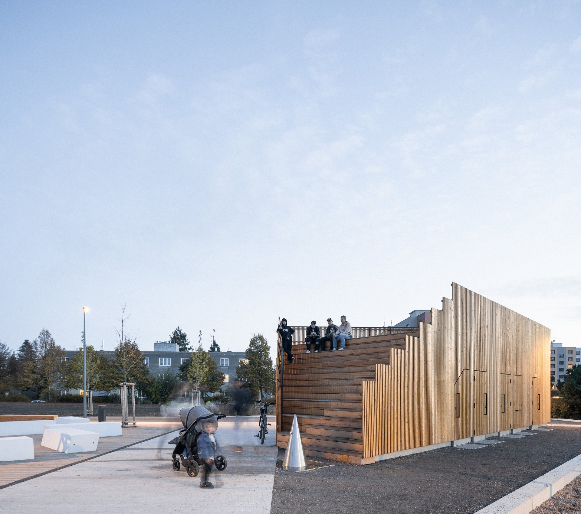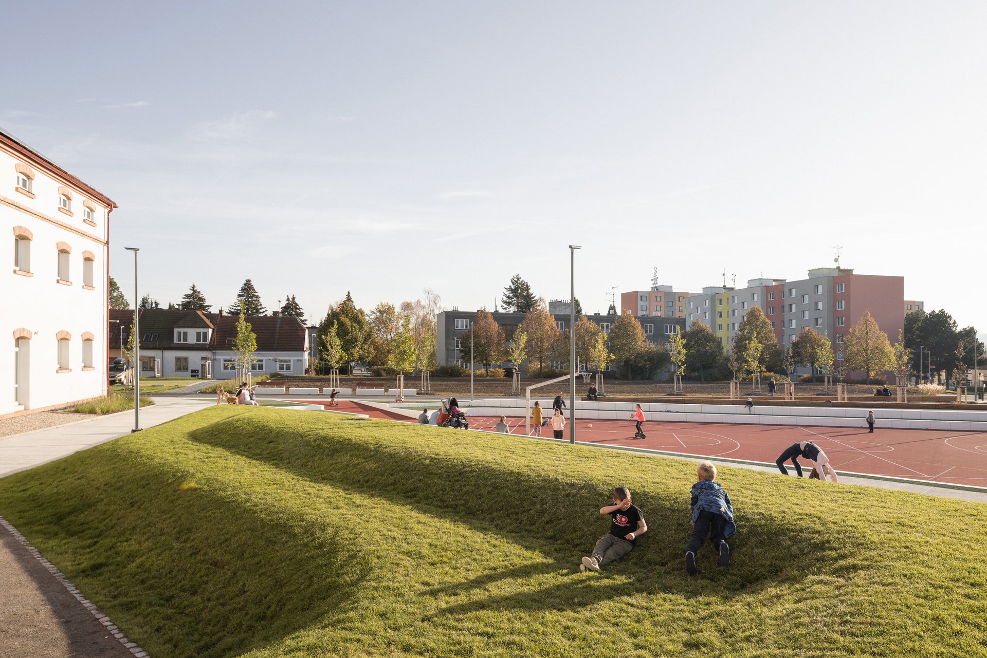 Hřiště lemují bílé tribuny, využívané jako pohodlné posezení, okolí doplňují zatravněné terasy a aleje stromů. Dominantou celého prostoru je dřevěný kiosek umístěný u hlavní pěší trasy. Jedna jeho strana je tvořena schodištěm, které slouží jako vyhlídka na celý areál.